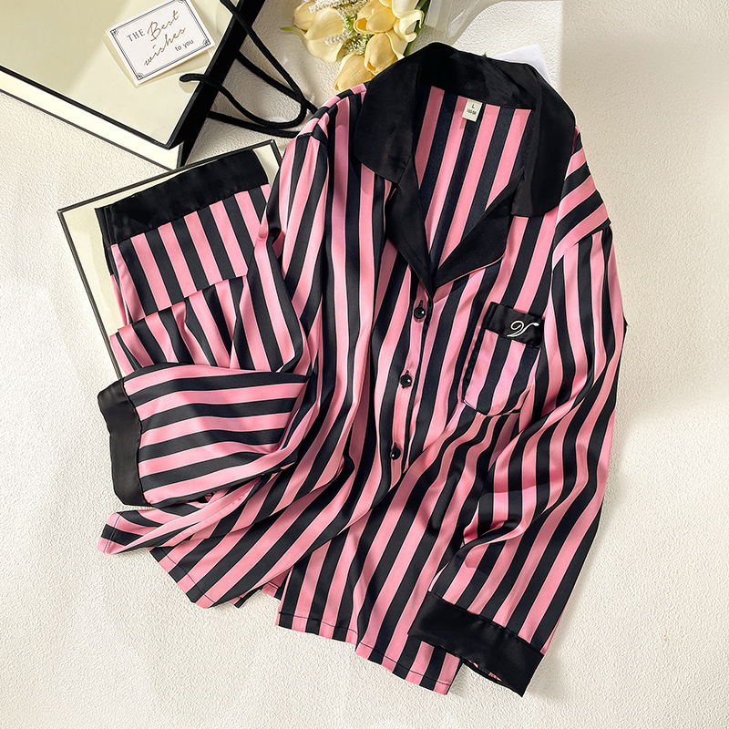2025 새로운 도착 잠옷 여성의 봄과 가을 아이스 실크 긴 소매 세트 아이스 실크 틈새 줄무늬 겉옷스토어 가기