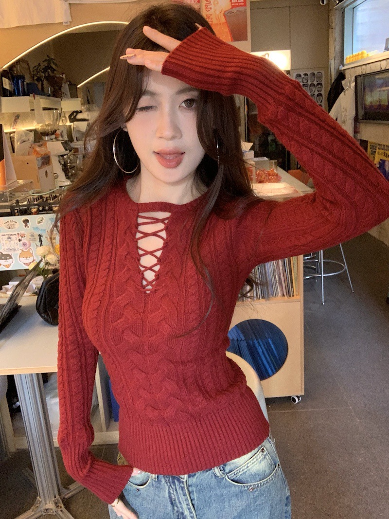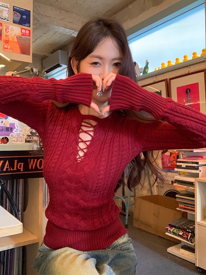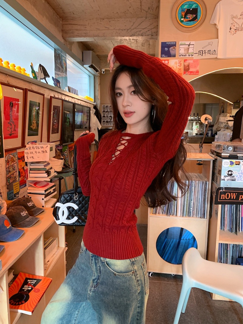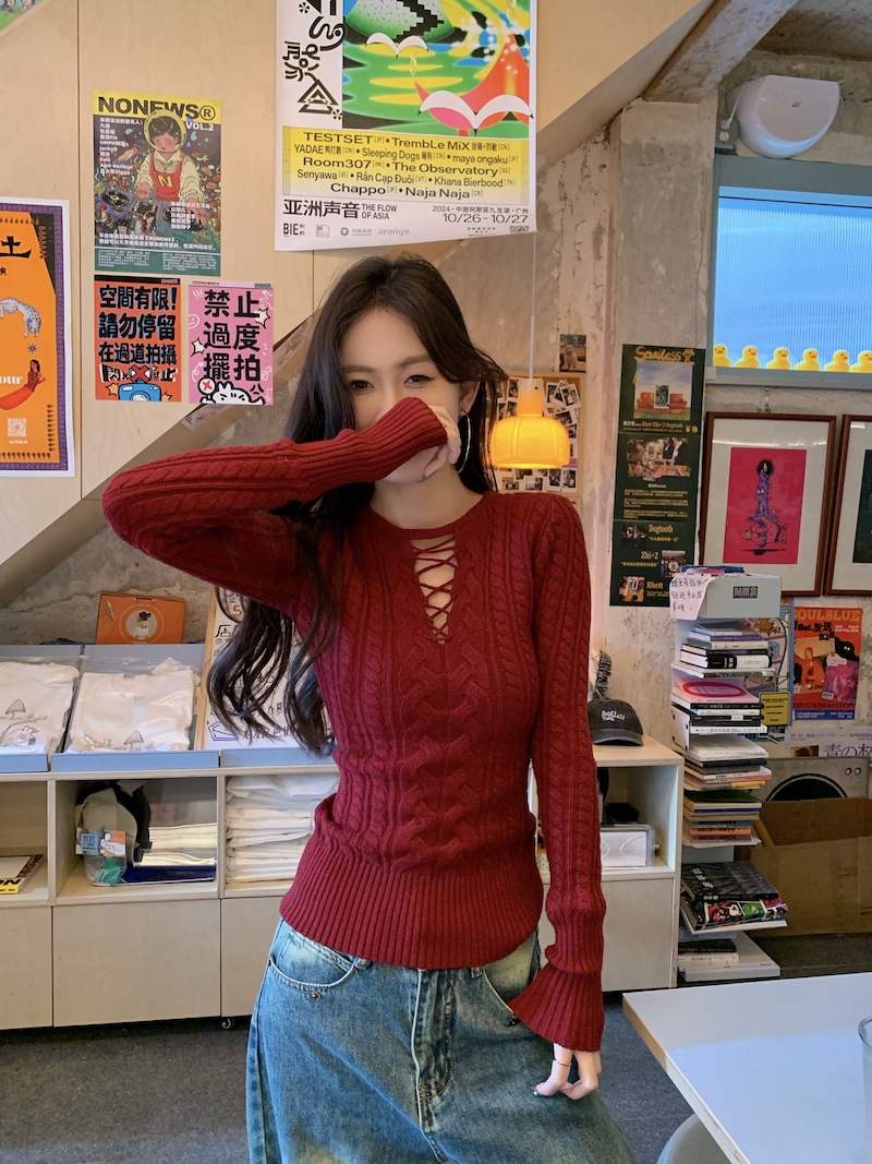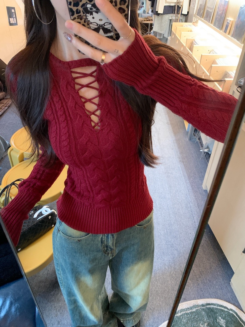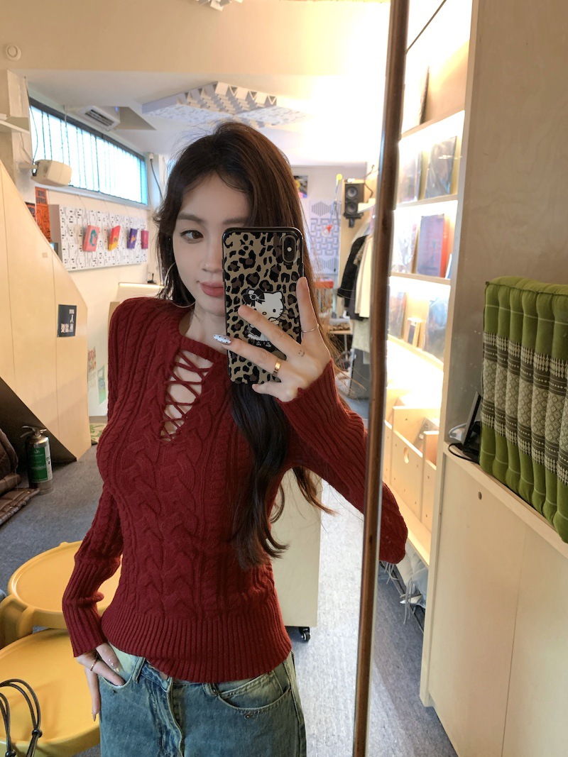 순수한 향신료 소녀 스타일 긴 소매 섹시한 중공 셔츠 여성용 봄 복고풍 허리 베이스 셔츠 세련된 레드 탑