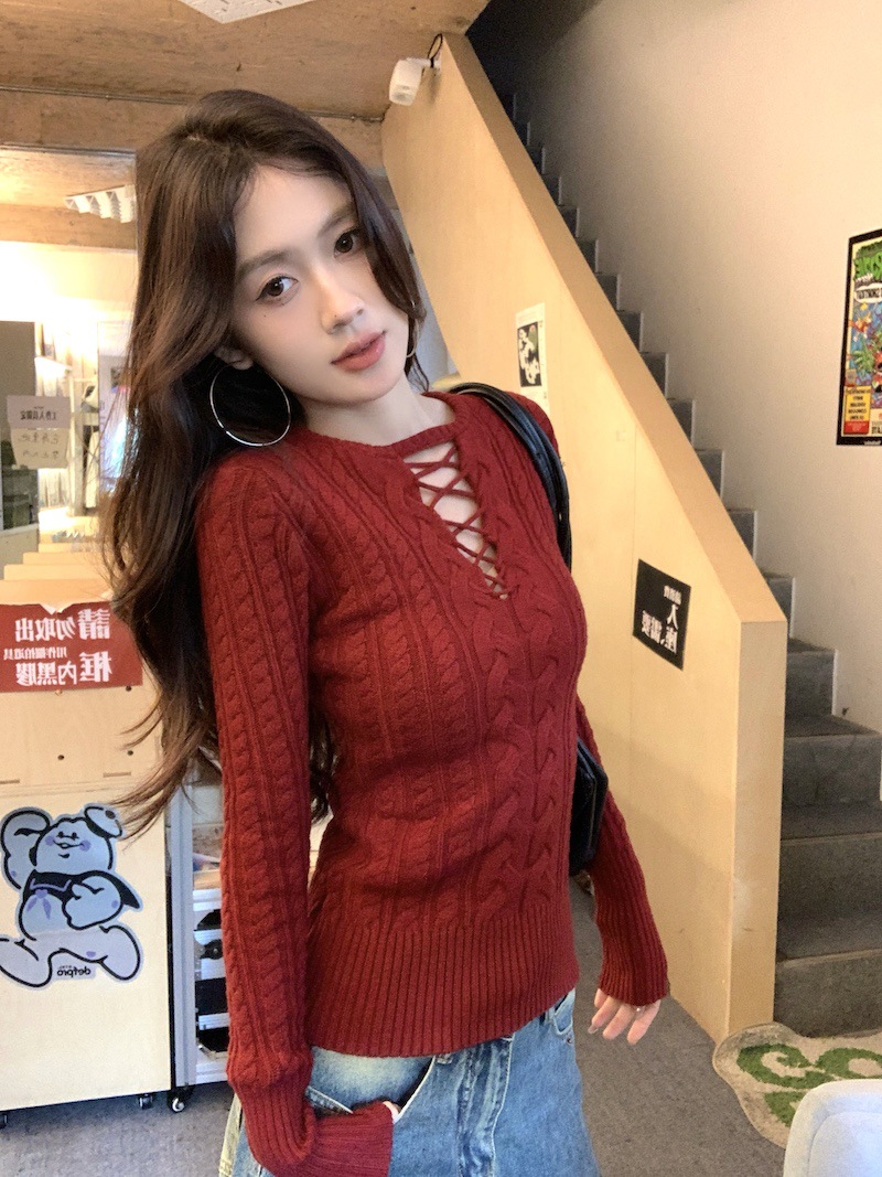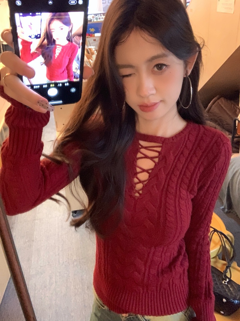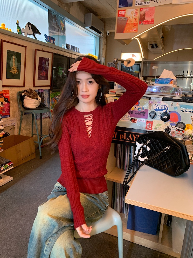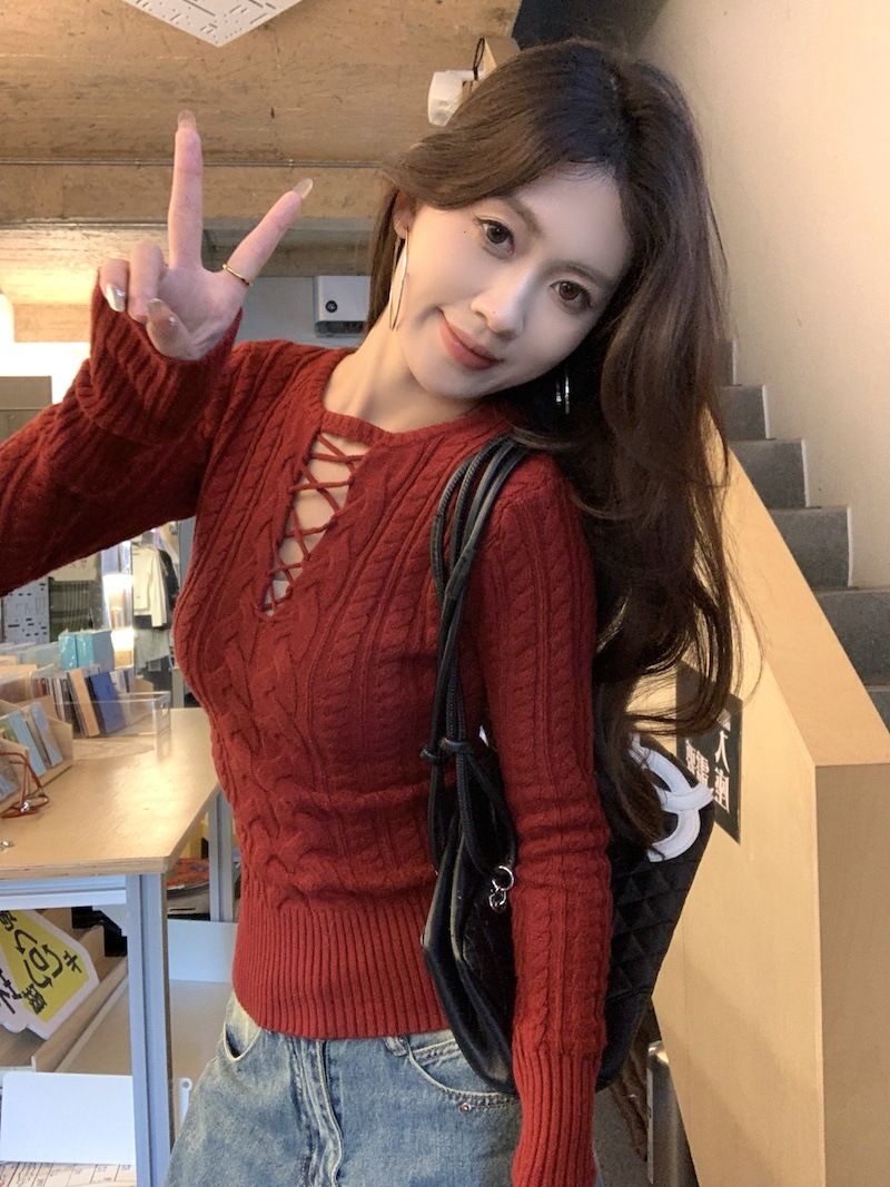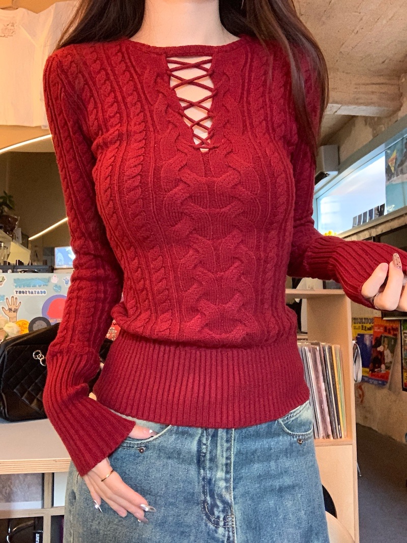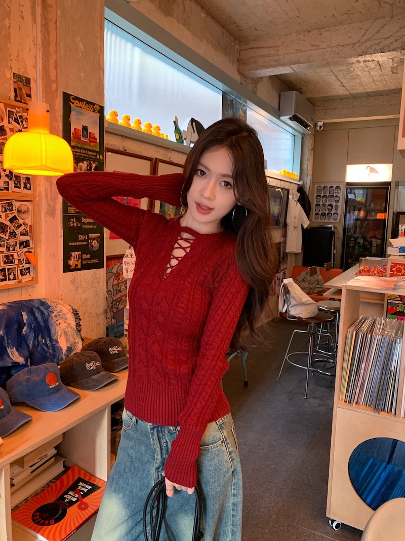 순수한 향신료 소녀 스타일 긴 소매 섹시한 중공 셔츠 여성용 봄 복고풍 허리 베이스 셔츠 세련된 레드 탑