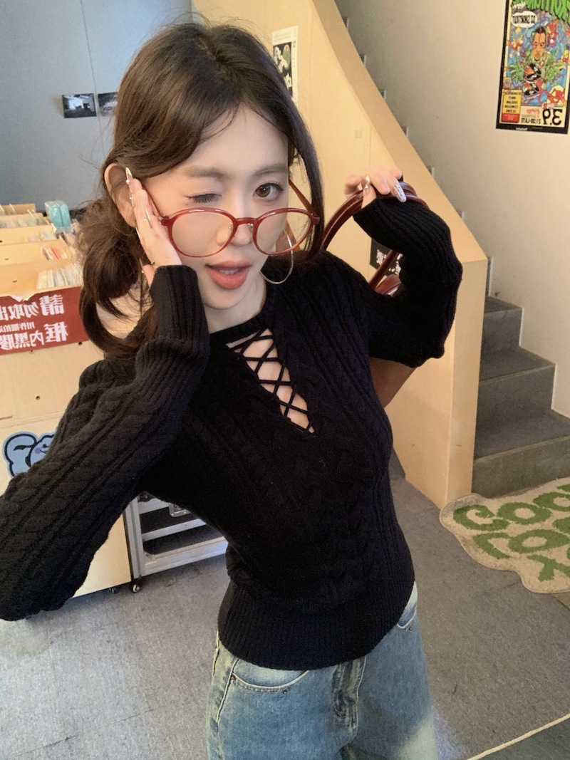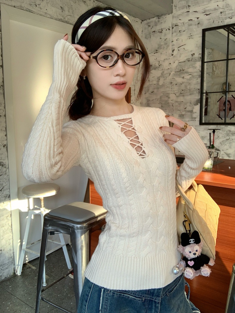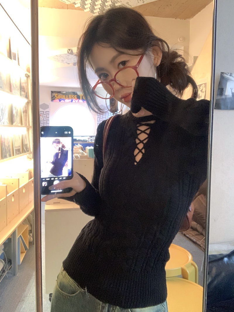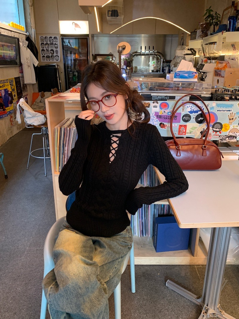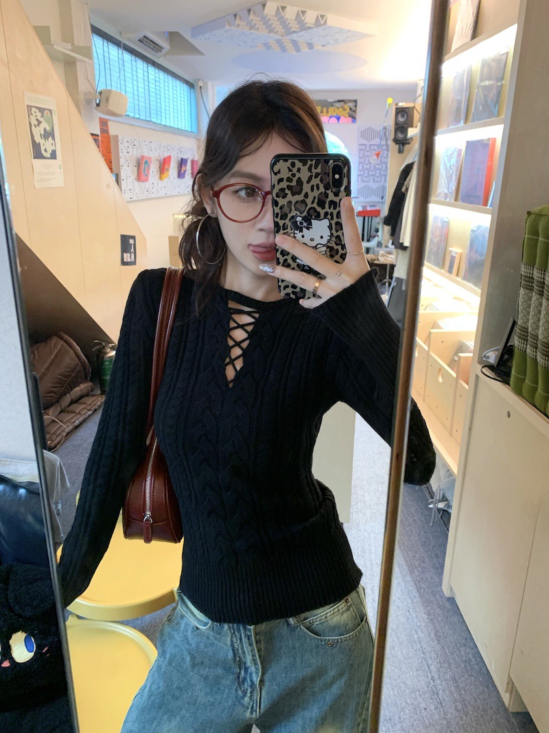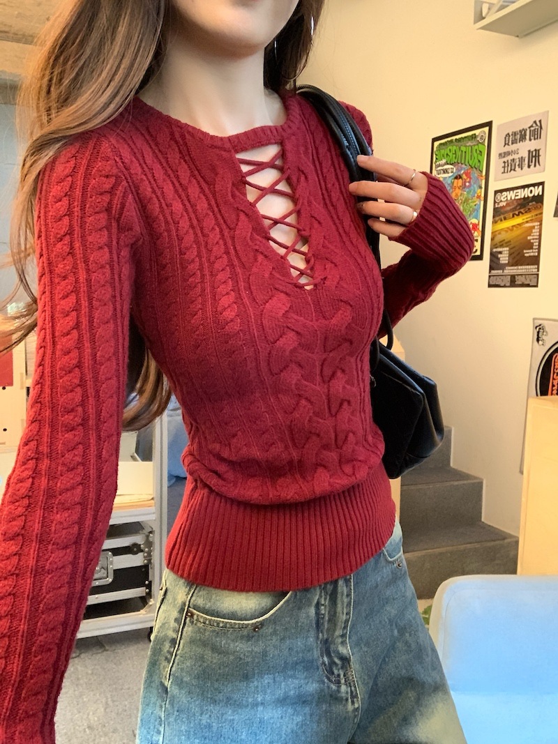 순수한 향신료 소녀 스타일 긴 소매 섹시한 중공 셔츠 여성용 봄 복고풍 허리 베이스 셔츠 세련된 레드 탑