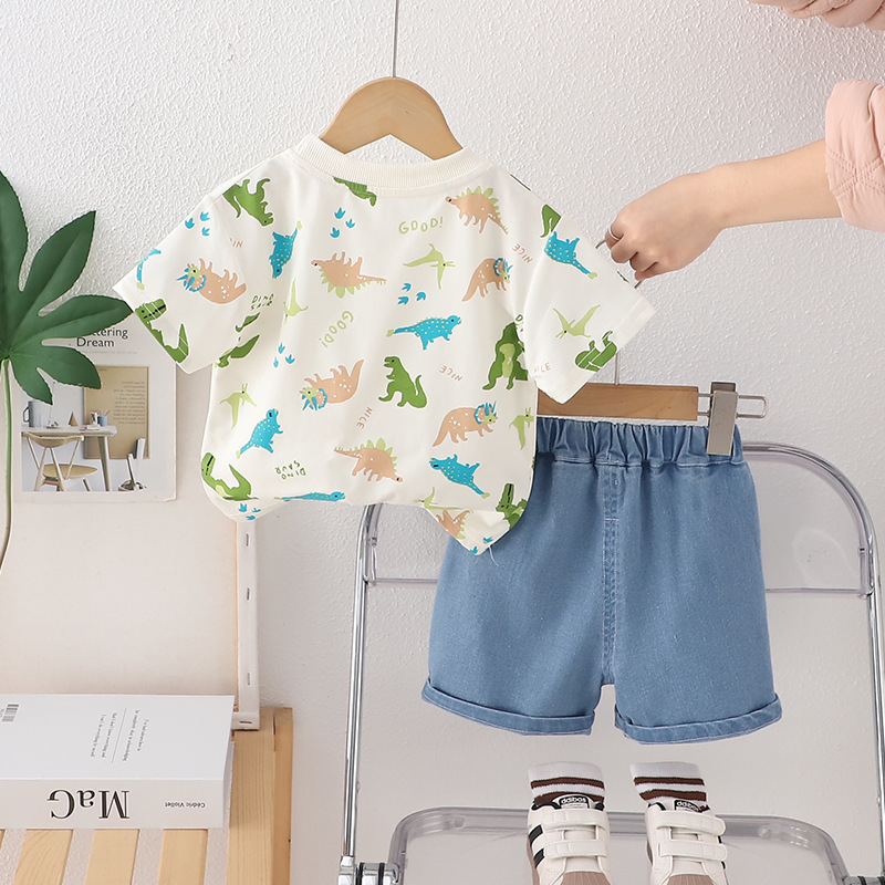 소년 여름 옷 세트 2025 새로운 소년 아기 여름 소년 여름 옷 전체 인쇄 공룡 반팔 투피스 세트스토어 가기