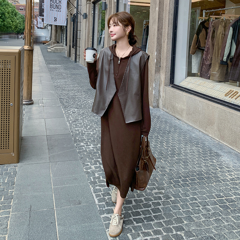 리얼 샷 다크 브라운 패션 PU 가죽 조끼 원피스 세트 2025 새로운 캐주얼 간단한 스웨터 스커트 투피스 세트스토어 가기