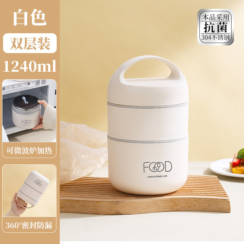 • [304 손잡이 도시락] 화이트 더블 레이어 + 식기 + 일본식 보온 가방.