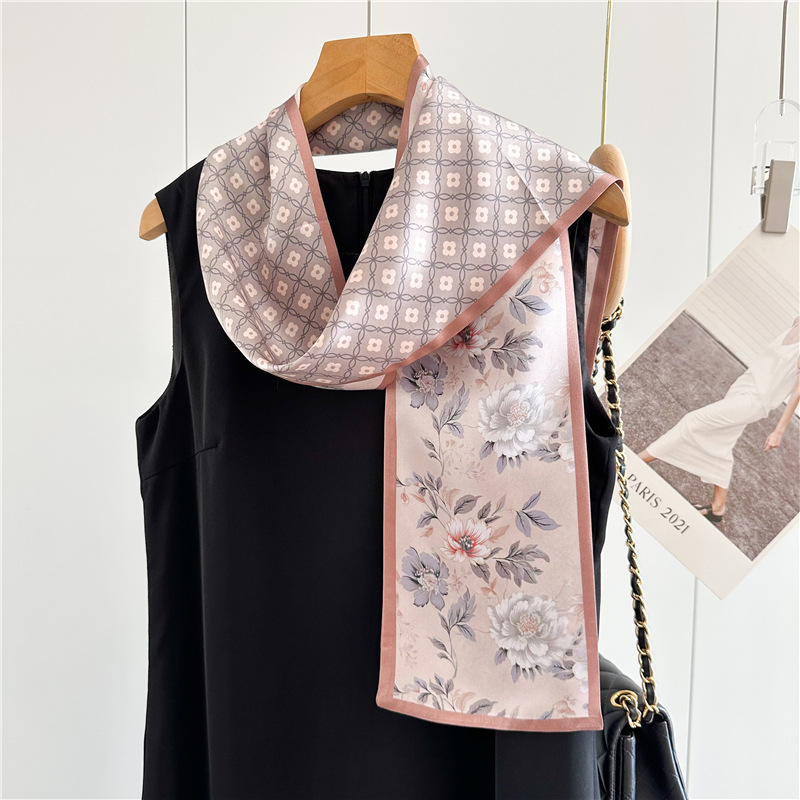 부드러운 핑크 작은 꽃 실크 스카프 여성의 우아한 뽕나무 실크 스카프 얇은 좁은 긴 더블 레이어 양면 스카프 리본