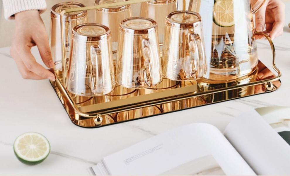 • 호박색 손잡이 컵 6개 + 금틀 + 삼각 냄비 + 금 거울 트레이