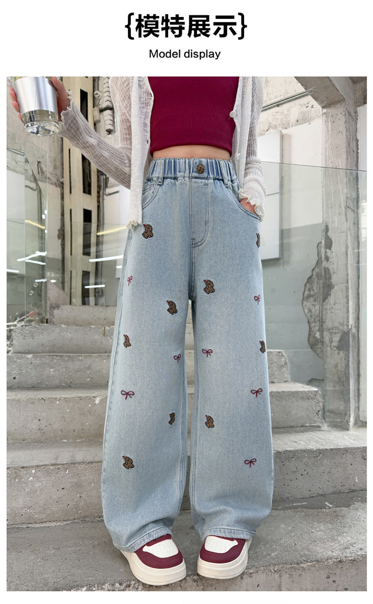 소녀의 봄 자수 활 청바지 2025 새로운 어린이 서양식 캐주얼 스포츠 와이드 다리 바지 긴 바지