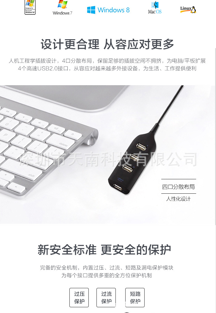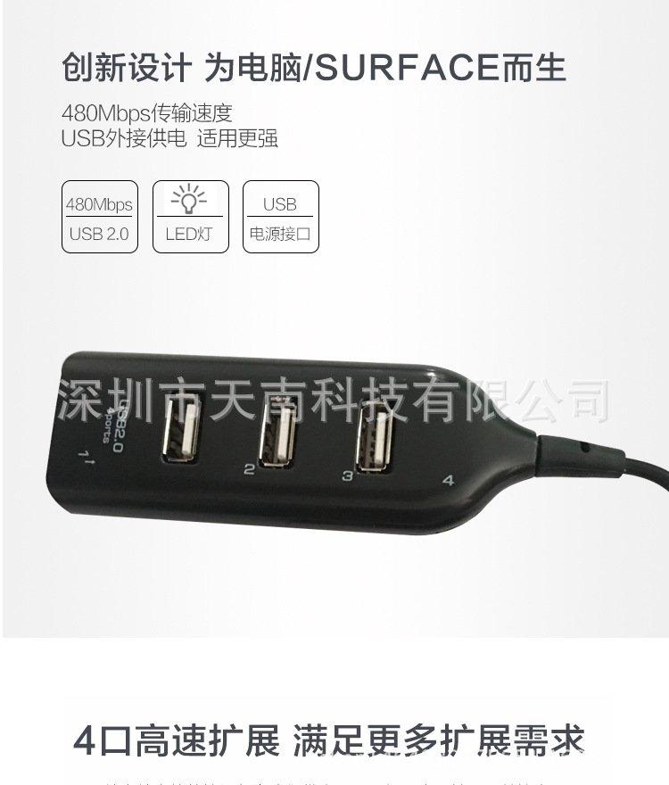 全新设计,更前卫更时尚。高速USB 2.0 4PORTHUB,外观设计非常漂亮,亮丽实用。此产品体积小巧,携带方便。