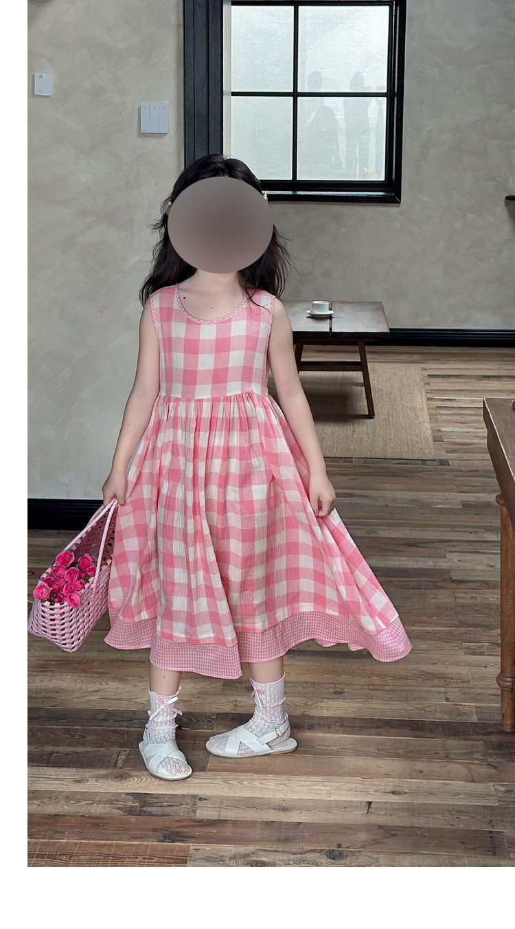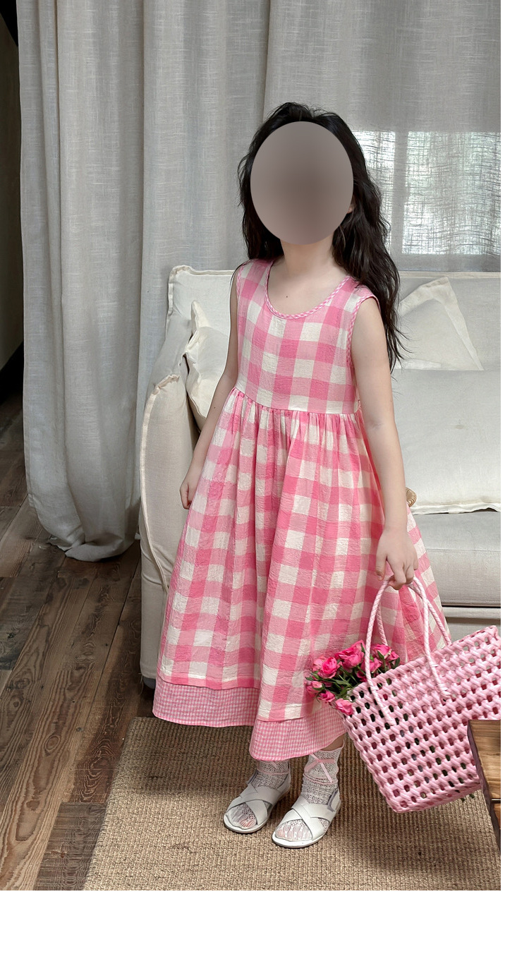 소녀 원피스 여름 새로운 캐주얼 핑크 격자 무늬 민소매 조끼 스커트 어린이를위한 머리카락 세대