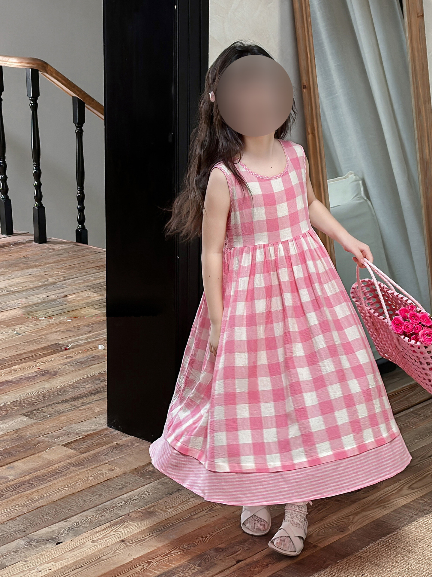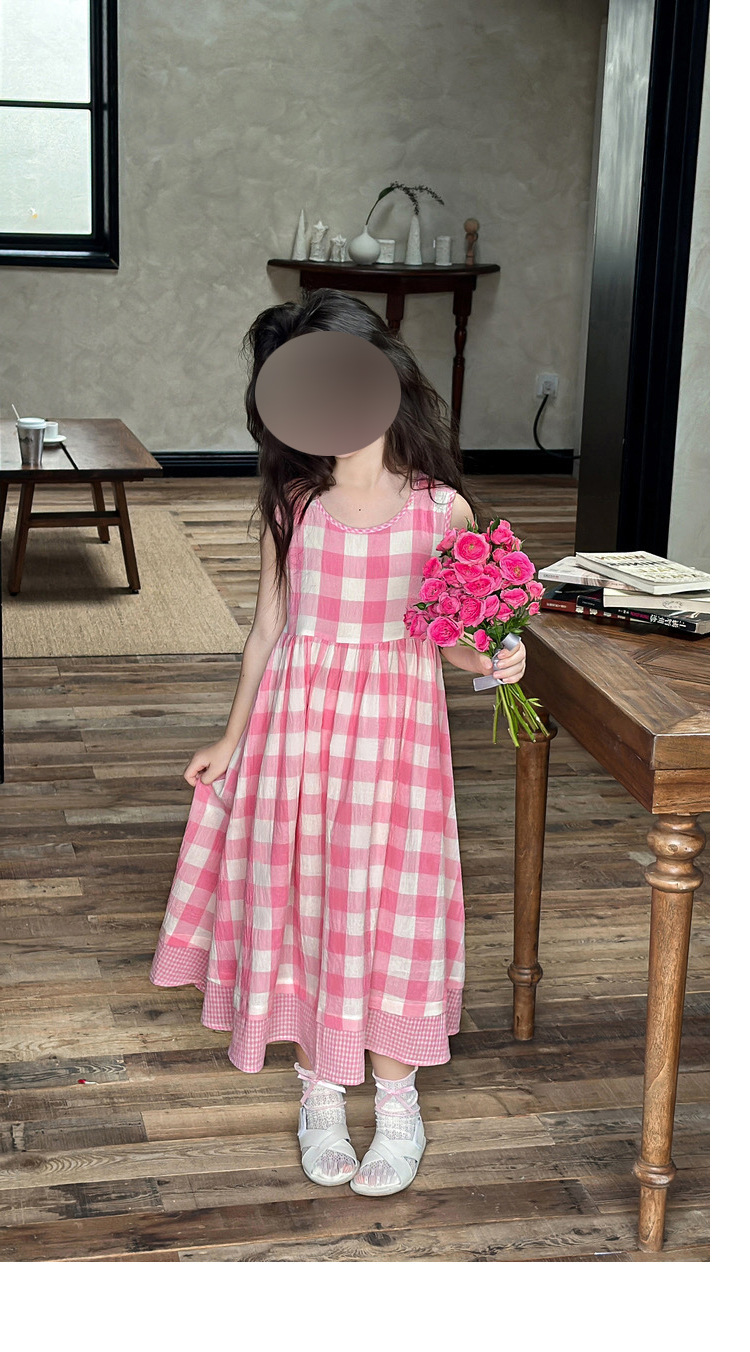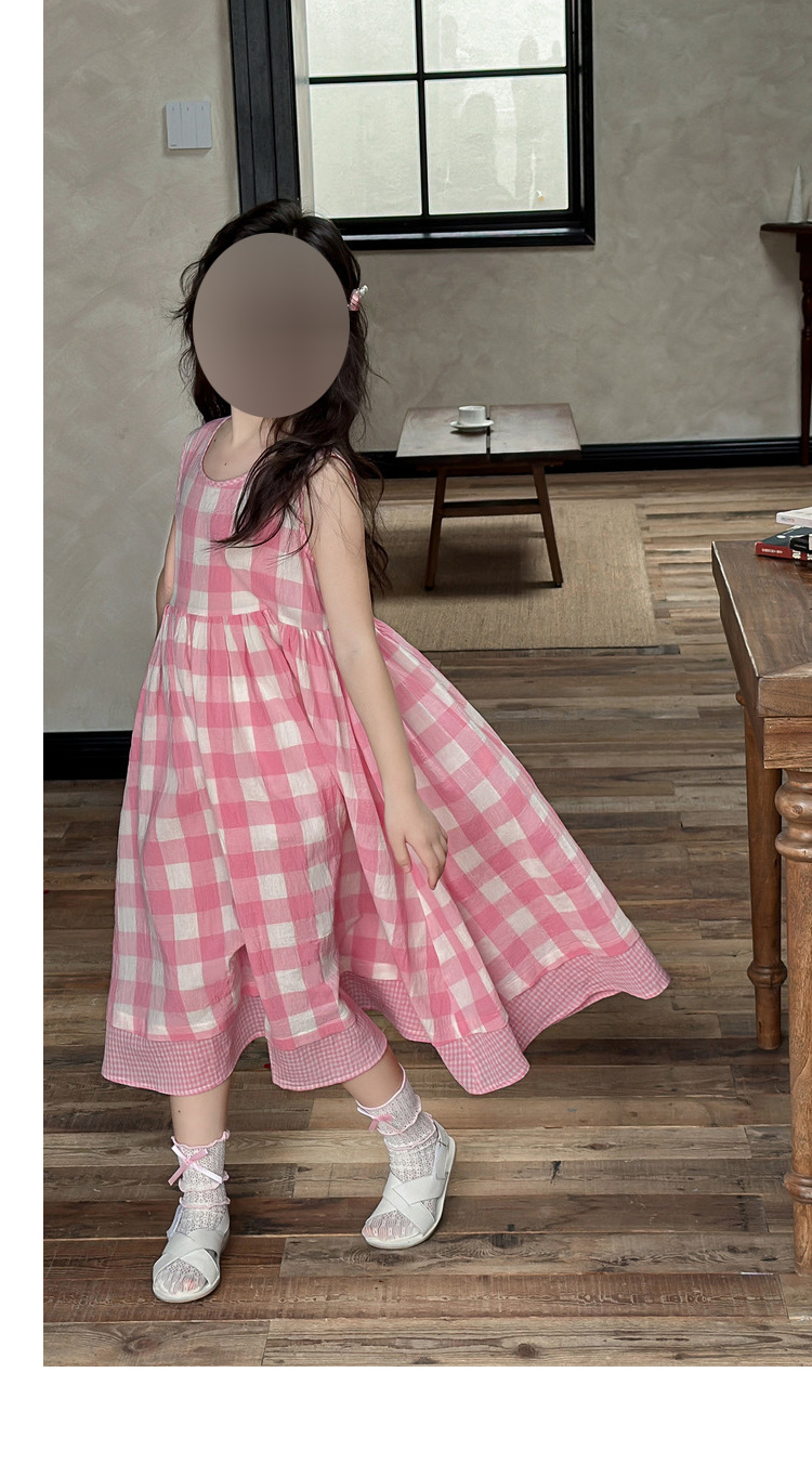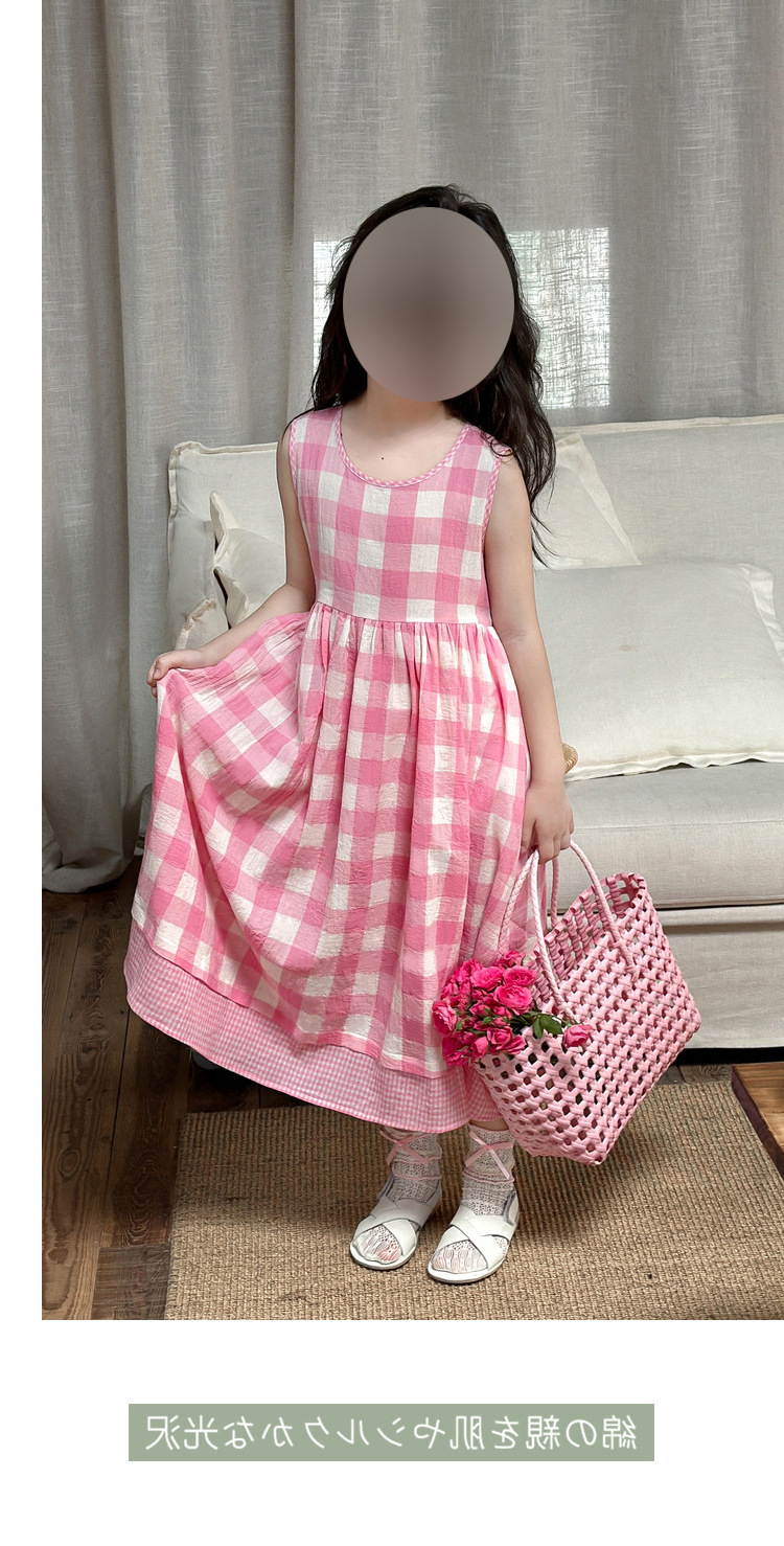 소녀 원피스 여름 새로운 캐주얼 핑크 격자 무늬 민소매 조끼 스커트 어린이를위한 머리카락 세대스토어 가기