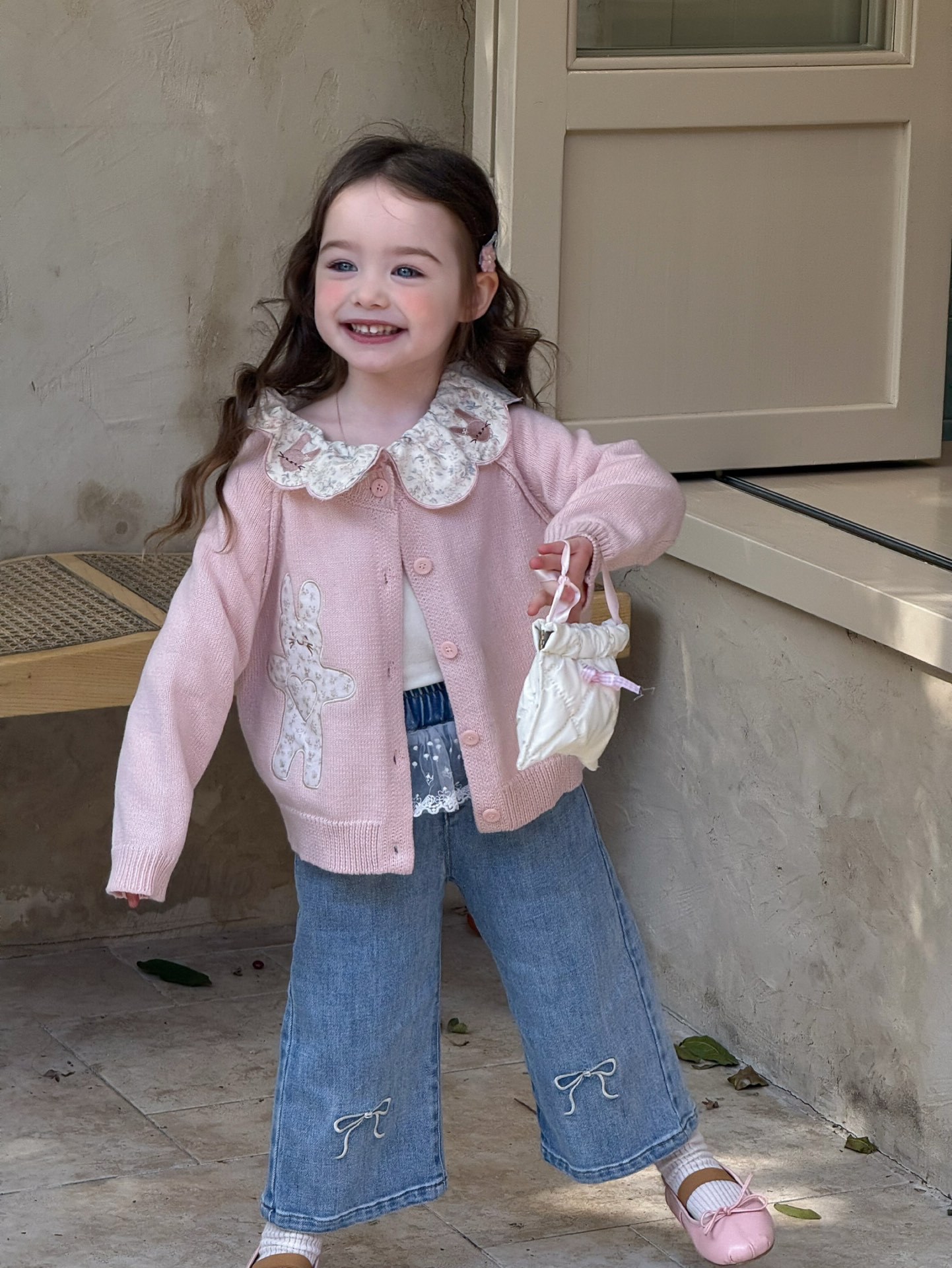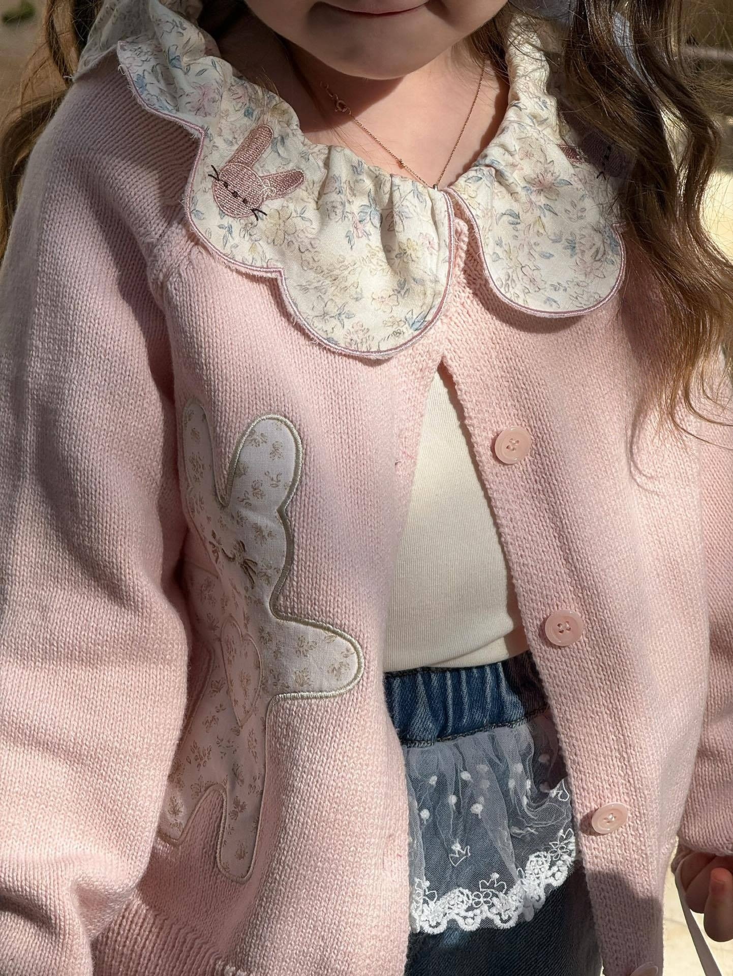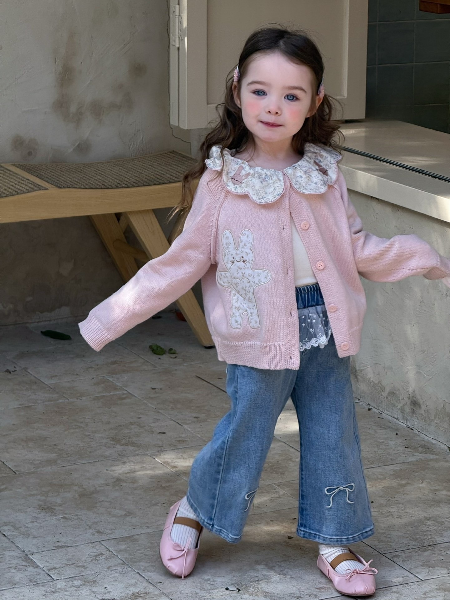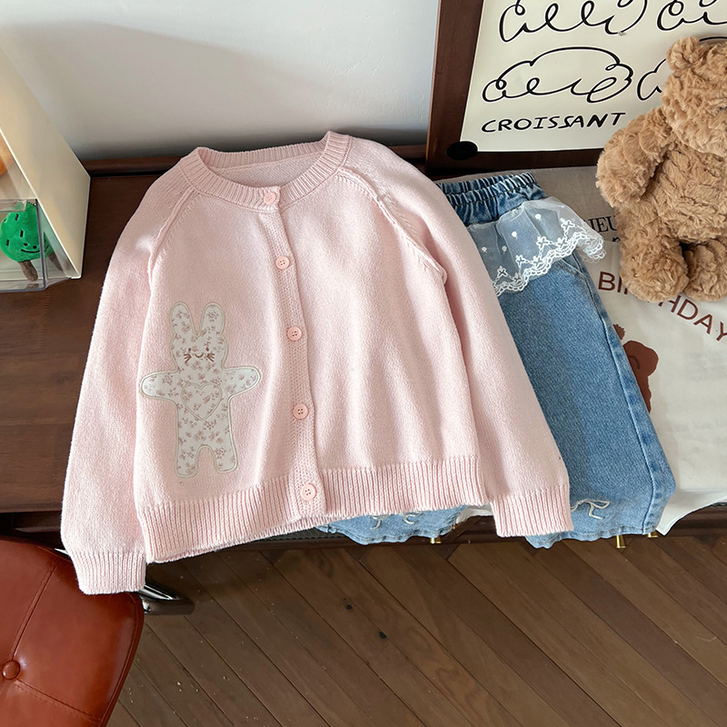 소녀 니트웨어 2025 봄 한국식 토끼 스티커 스웨터 코트 옷깃베이스 셔츠 활 청바지