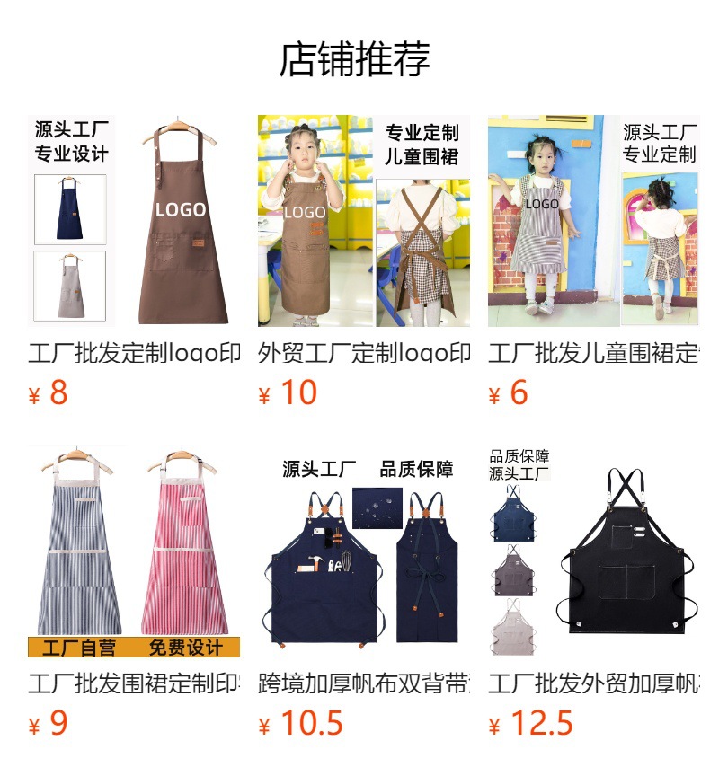本厂是专业生产围裙20年的工厂,有着丰富的生产,定制经验,日产量8000+ 全套的生产设备,定制印字刺绣一站式服务 。 来样定制,代加工,一件代发,满足多样需求 跨境电商专属:opp包装,装箱,贴标等服务。 让您售后无忧,快速响应,贴心服务一路相伴。