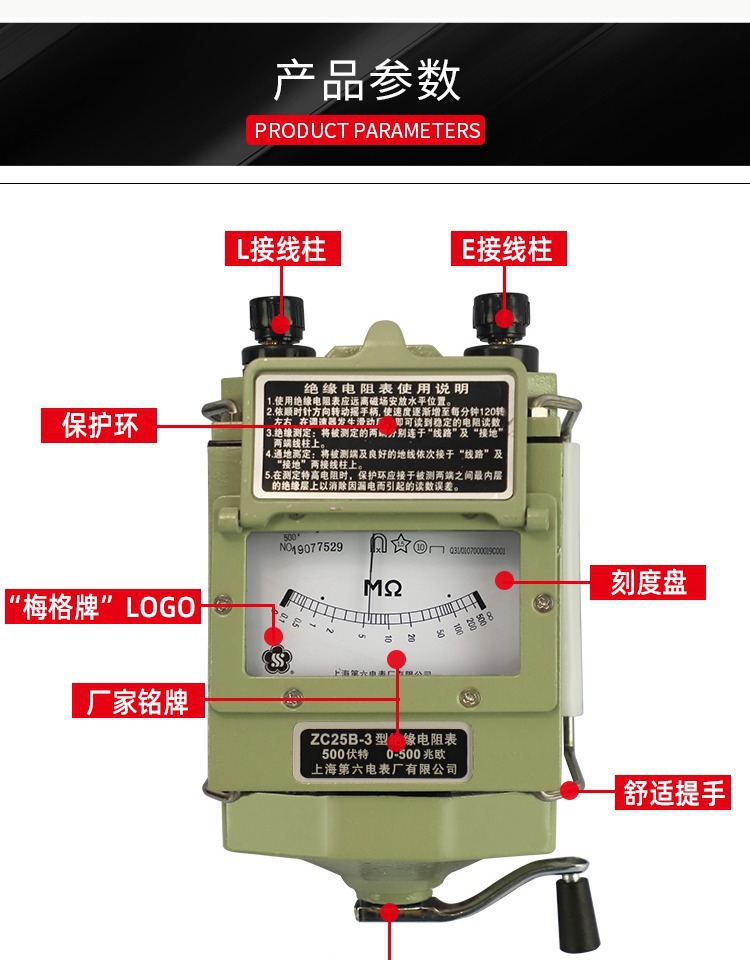 상하이 No.6 전기 미터 공장 Meg 브랜드 500V Megohmmeter ZC25B-3 수공 절연 저항 미터스토어 가기