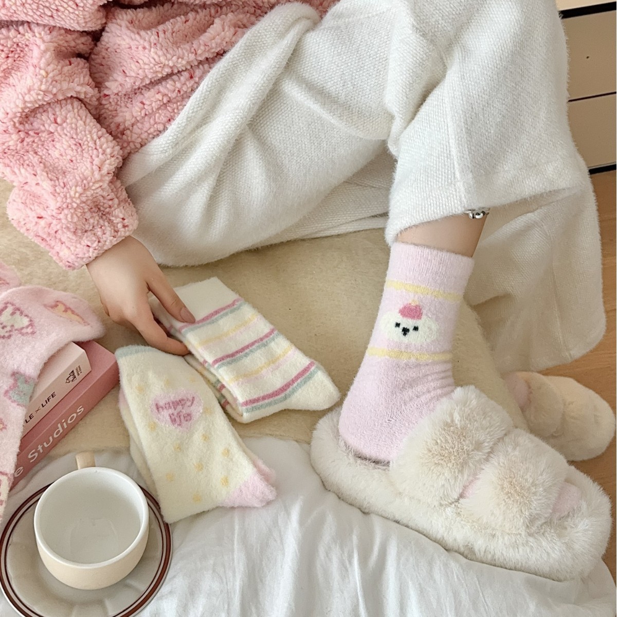 핑크 호주 벨벳 양말 어린이 가을과 겨울 두꺼운 따뜻한 튜브 양말 일본 만화 줄무늬 귀여운 플러시 바닥 양말스토어 가기