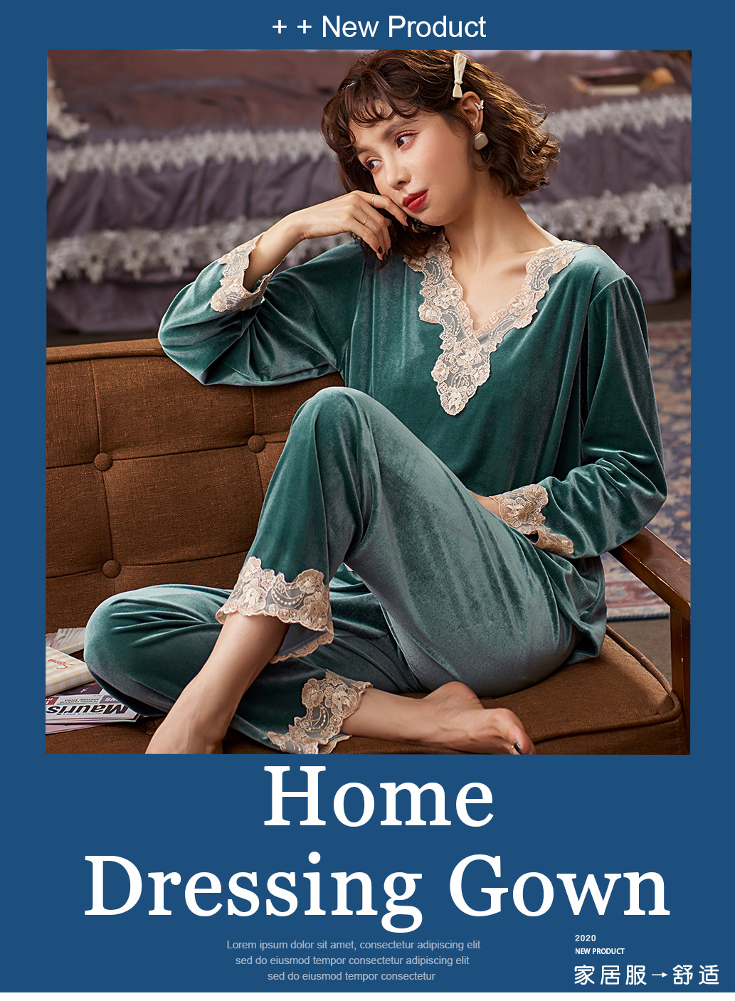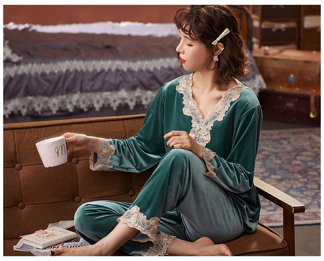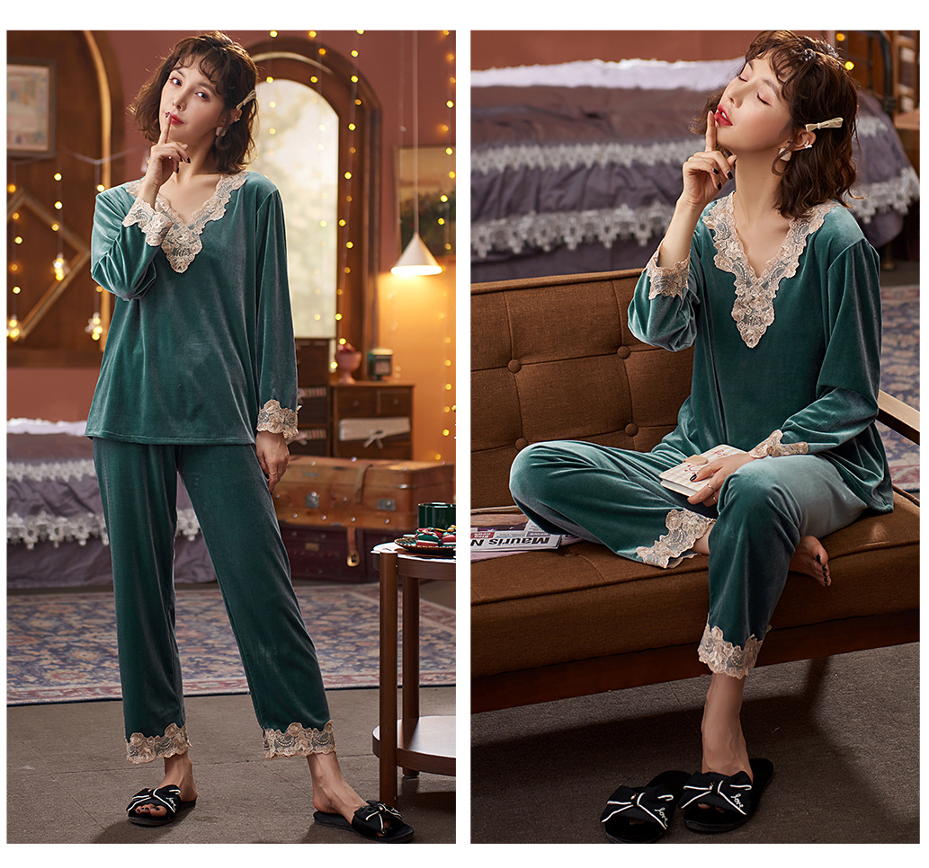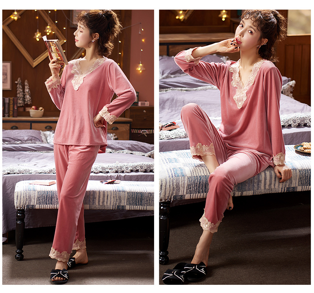 다빈치 코드 따뜻한 골드 벨벳 잠옷 가을 겨울 한국 스타일 외출복 레이스 여성용 투피스 세트