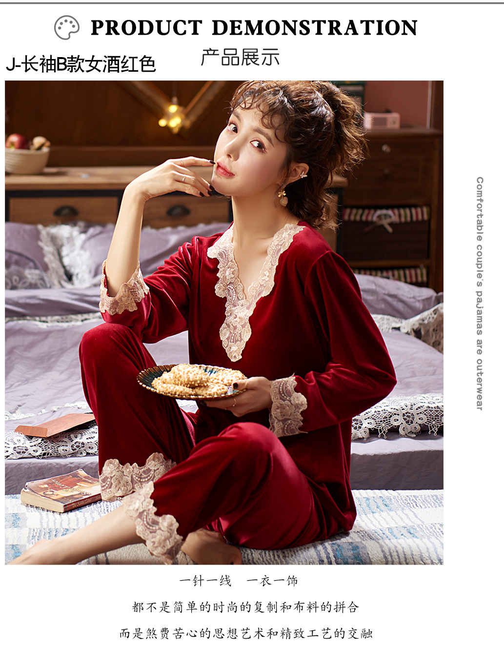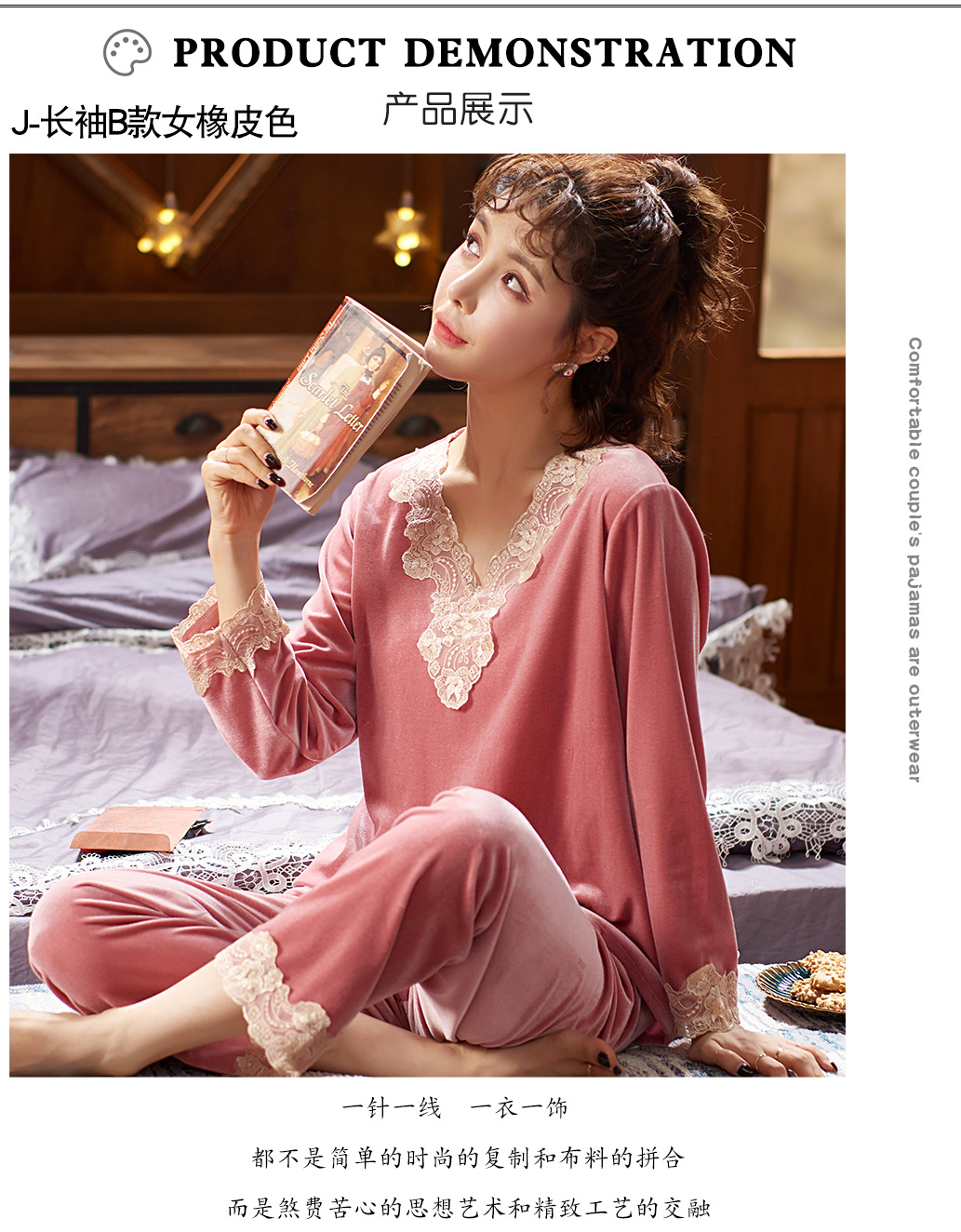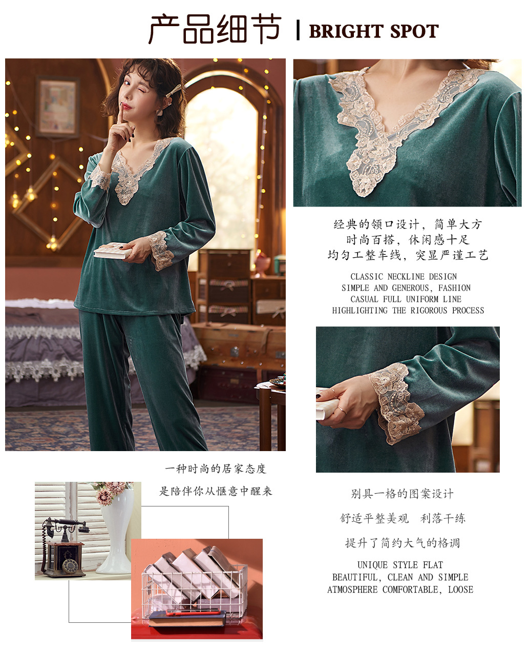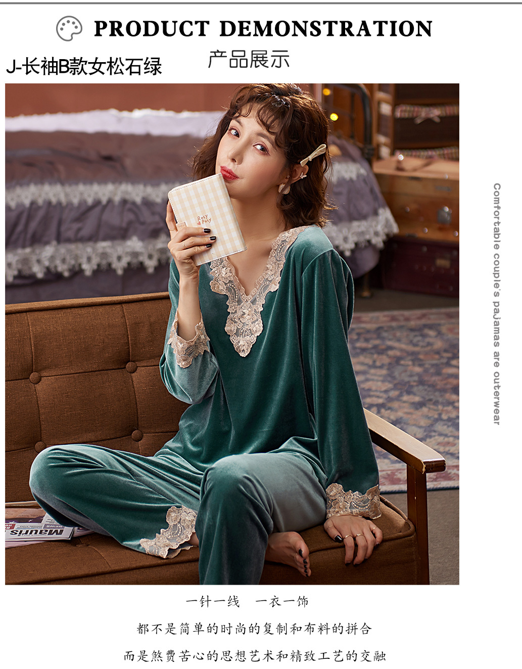 다빈치 코드 따뜻한 골드 벨벳 잠옷 가을 겨울 한국 스타일 외출복 레이스 여성용 투피스 세트스토어 가기