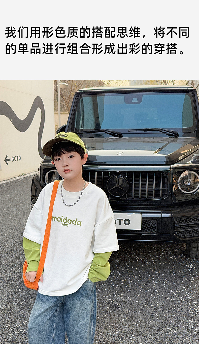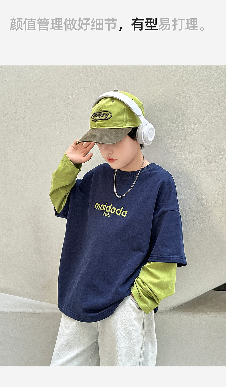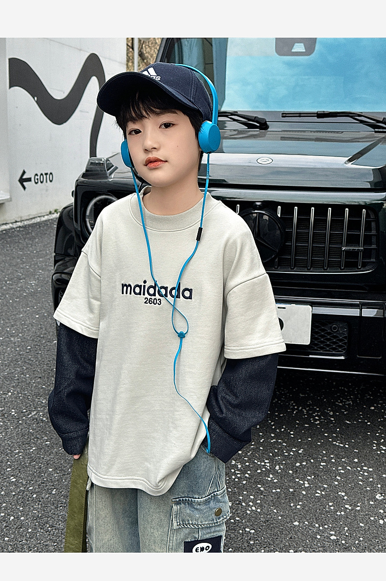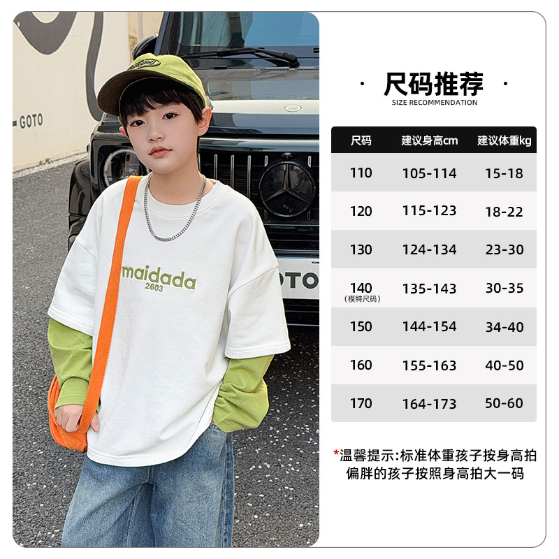 2025 가을 테리 코튼 대비 색상 남아용 스웨트셔츠, 순면 팬더 원형 중대형 아동용 페이크 투피스 티셔츠스토어 가기