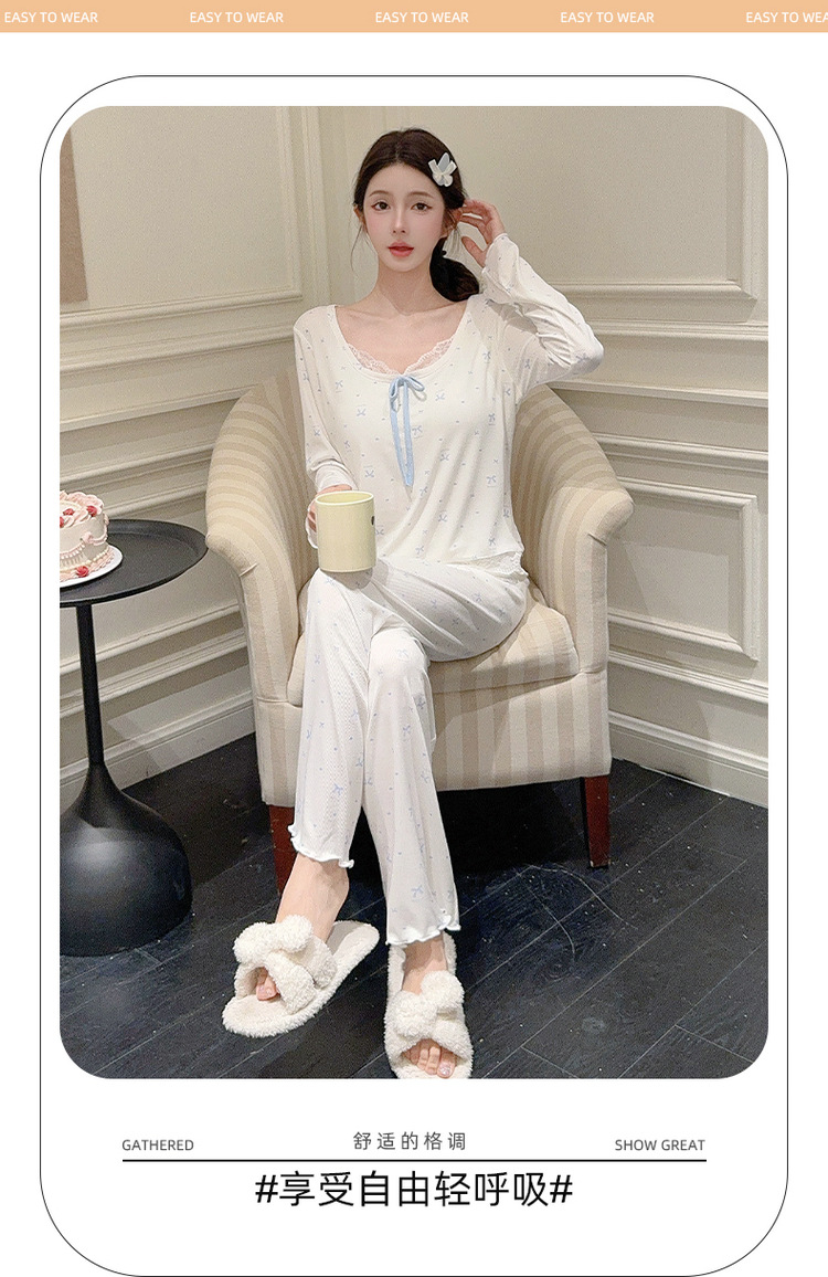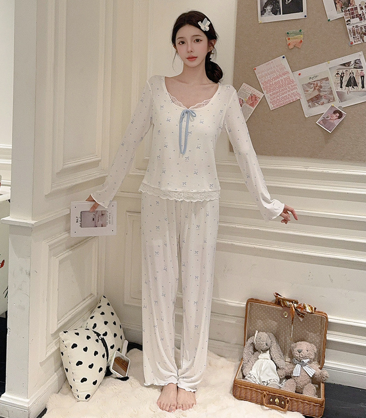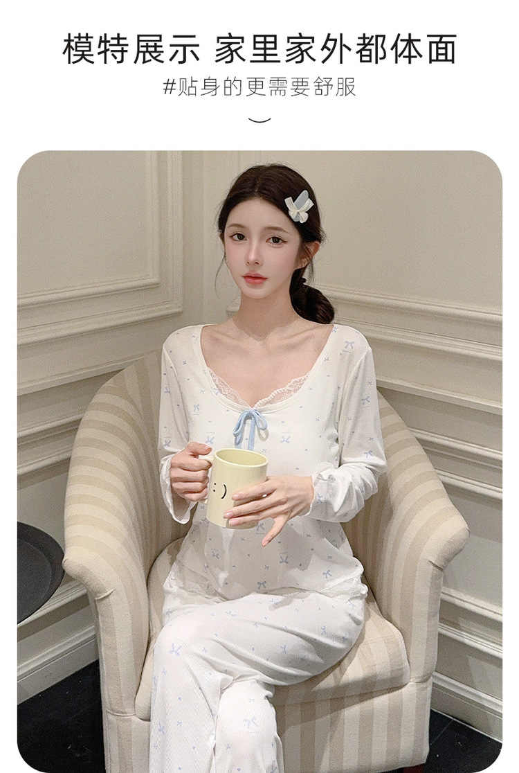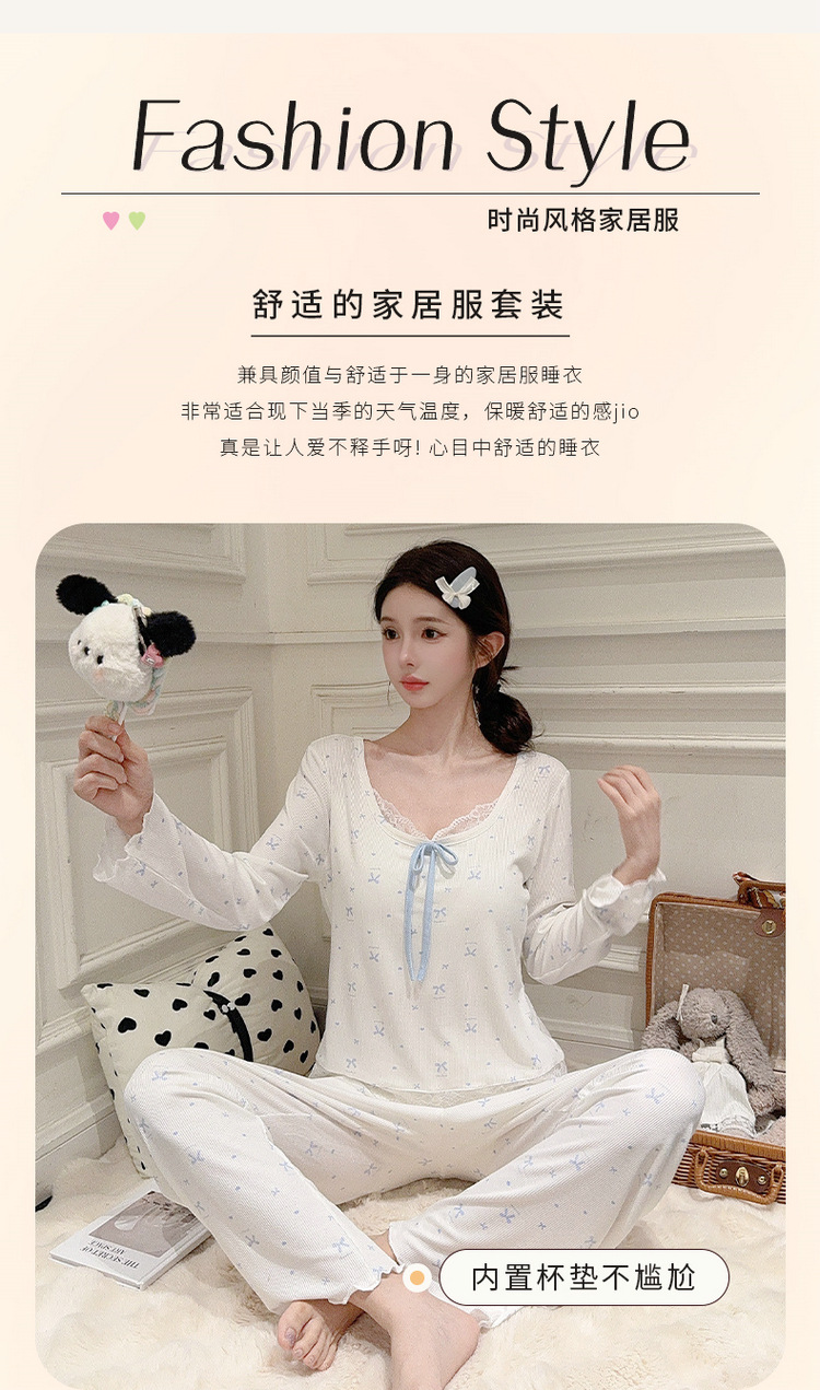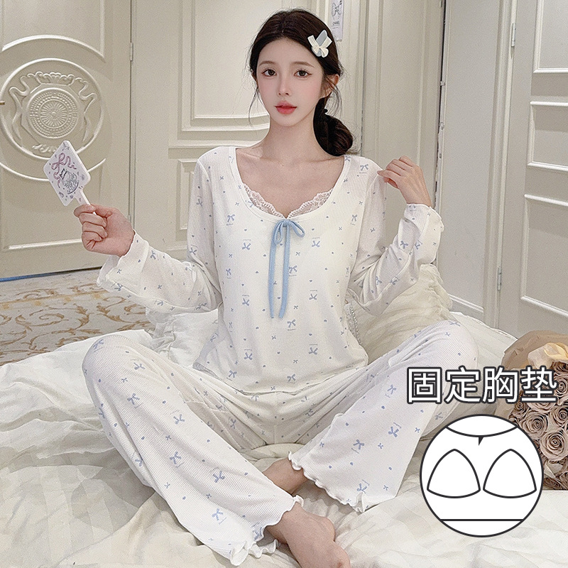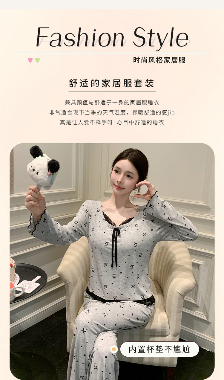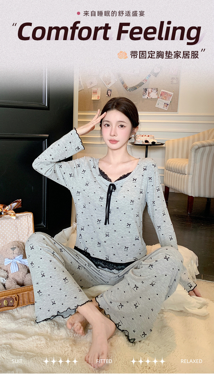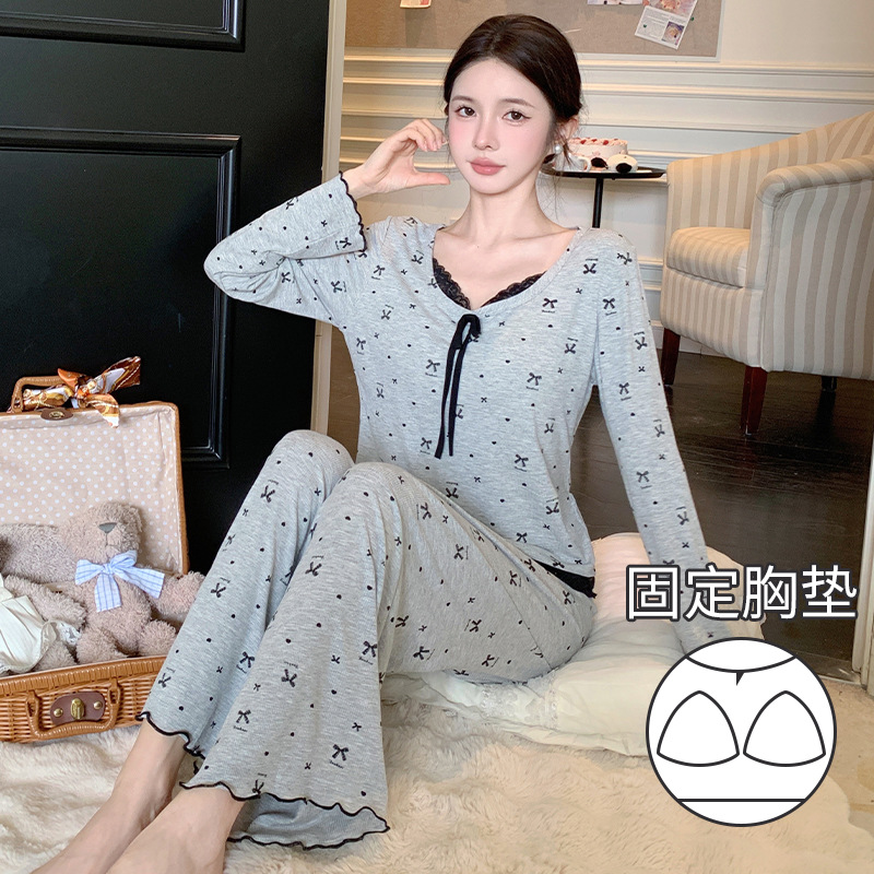 Omida 봄과 가을 신상 여성용 긴팔 잠옷, 가슴 패드가 있는 모달 리본 레이스 세트, 홈웨어스토어 가기