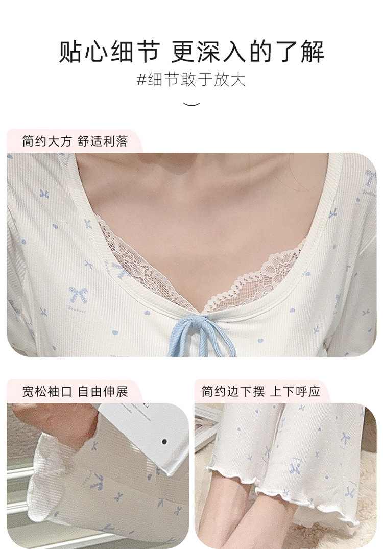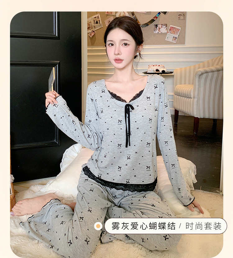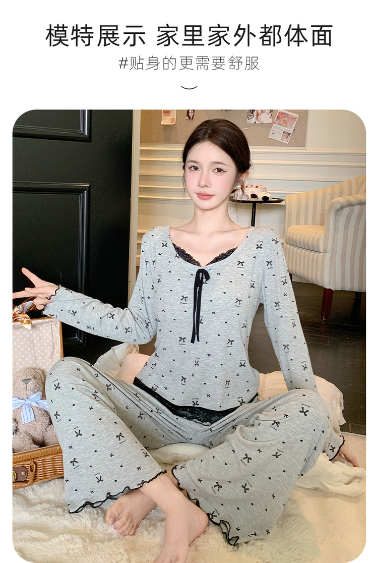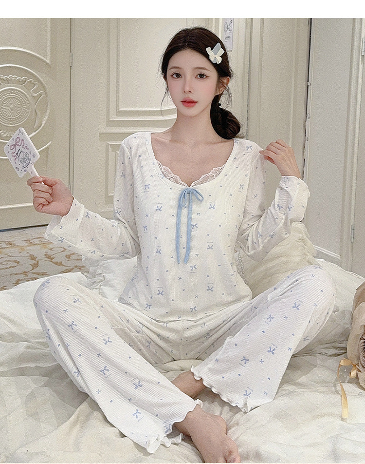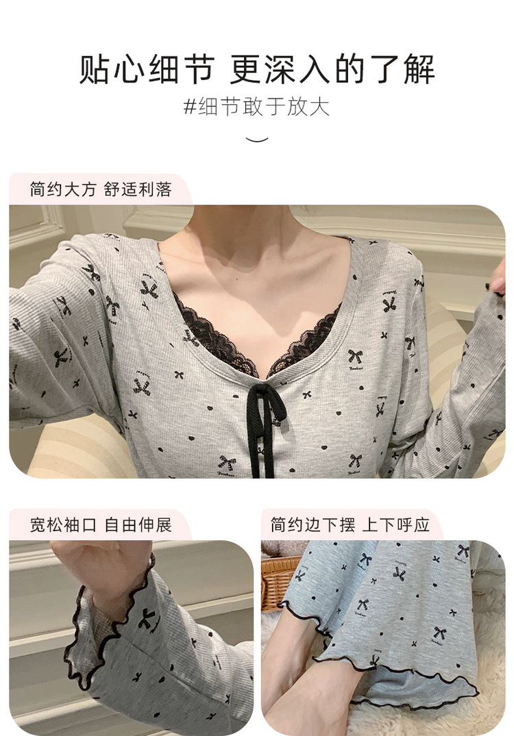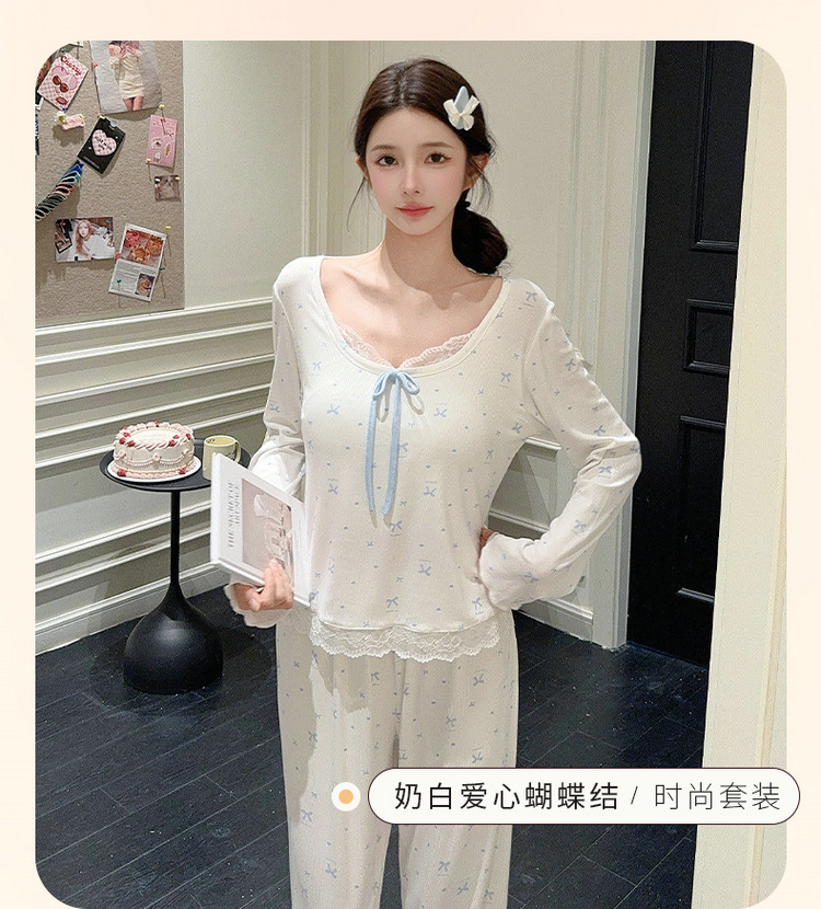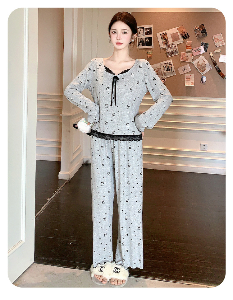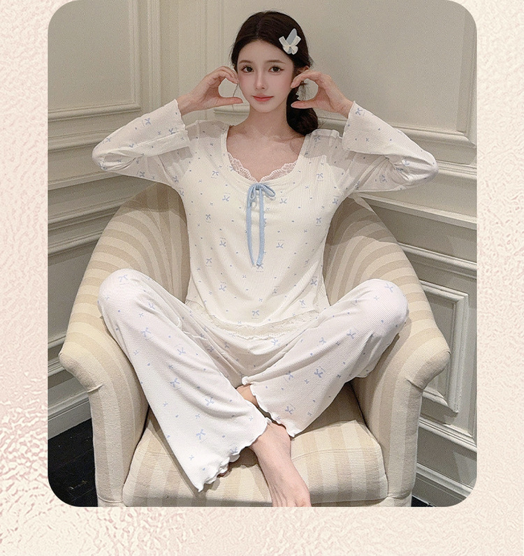 Omida 봄과 가을 신상 여성용 긴팔 잠옷, 가슴 패드가 있는 모달 리본 레이스 세트, 홈웨어스토어 가기