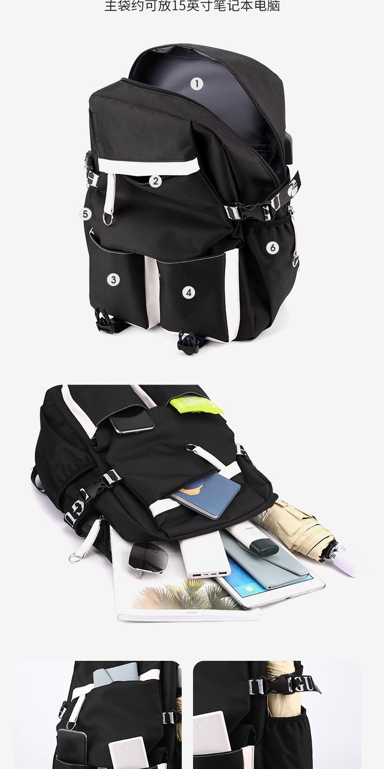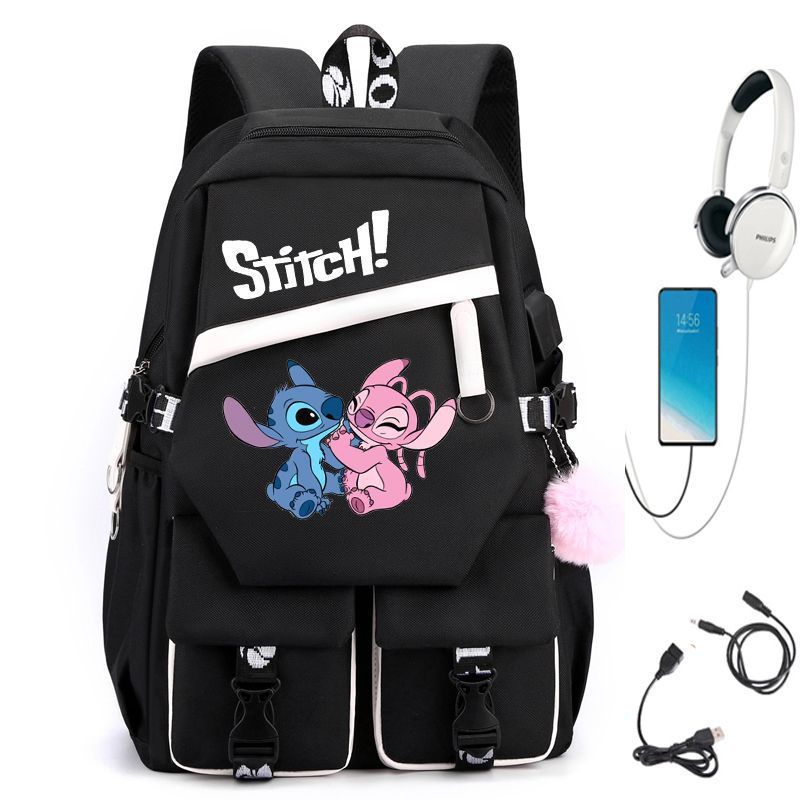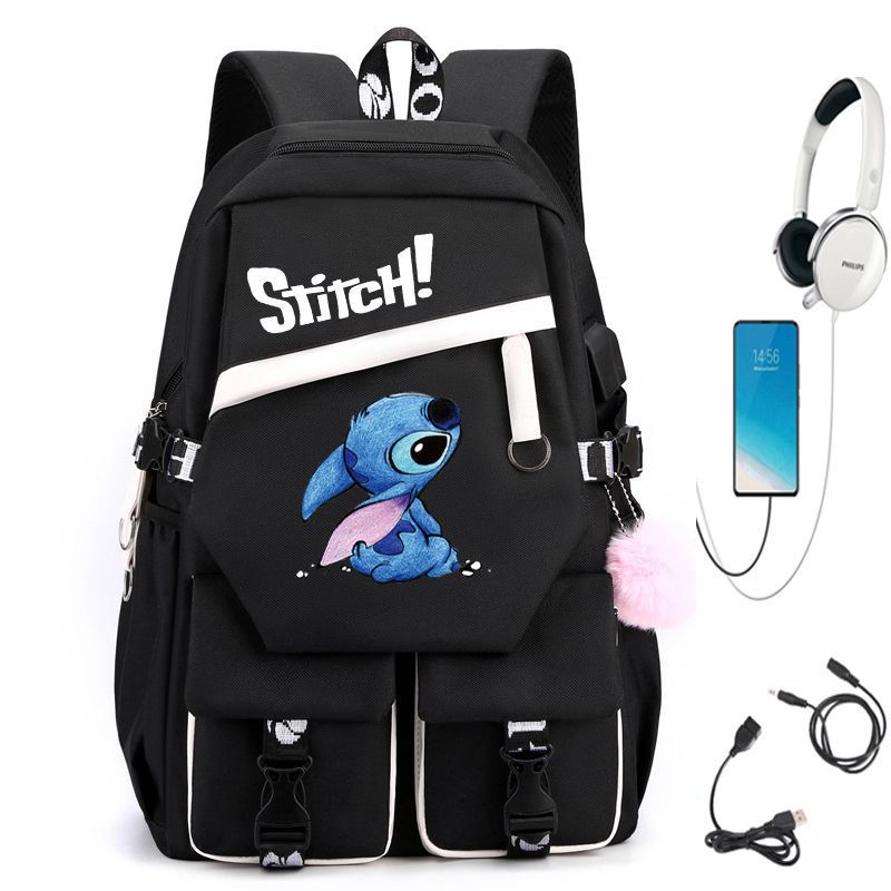 남성과 여성 학생을위한 국경 간 새로운 스티치 스티치 스티치 USB 충전 스쿨백 배낭 여행 가방스토어 가기