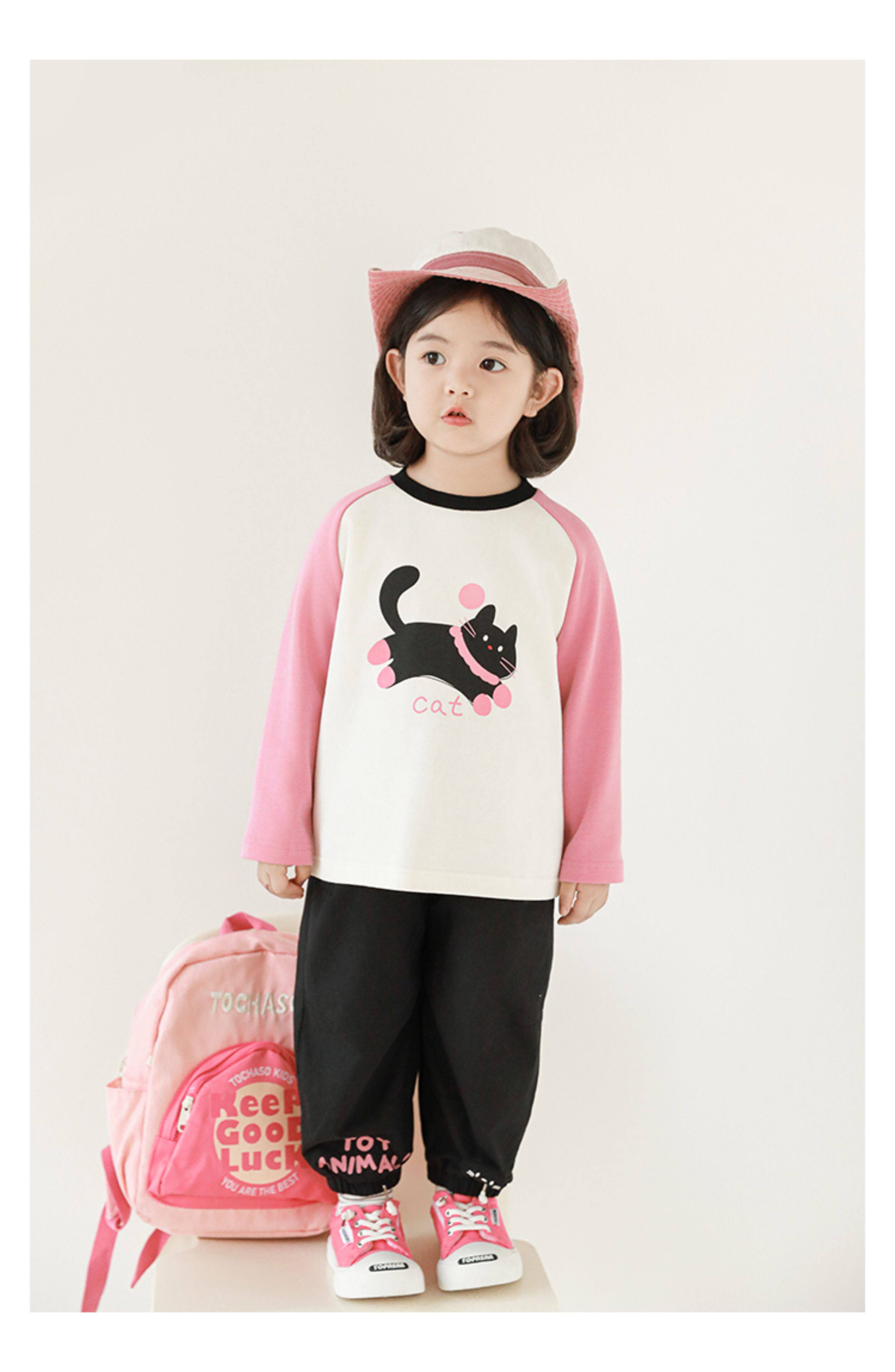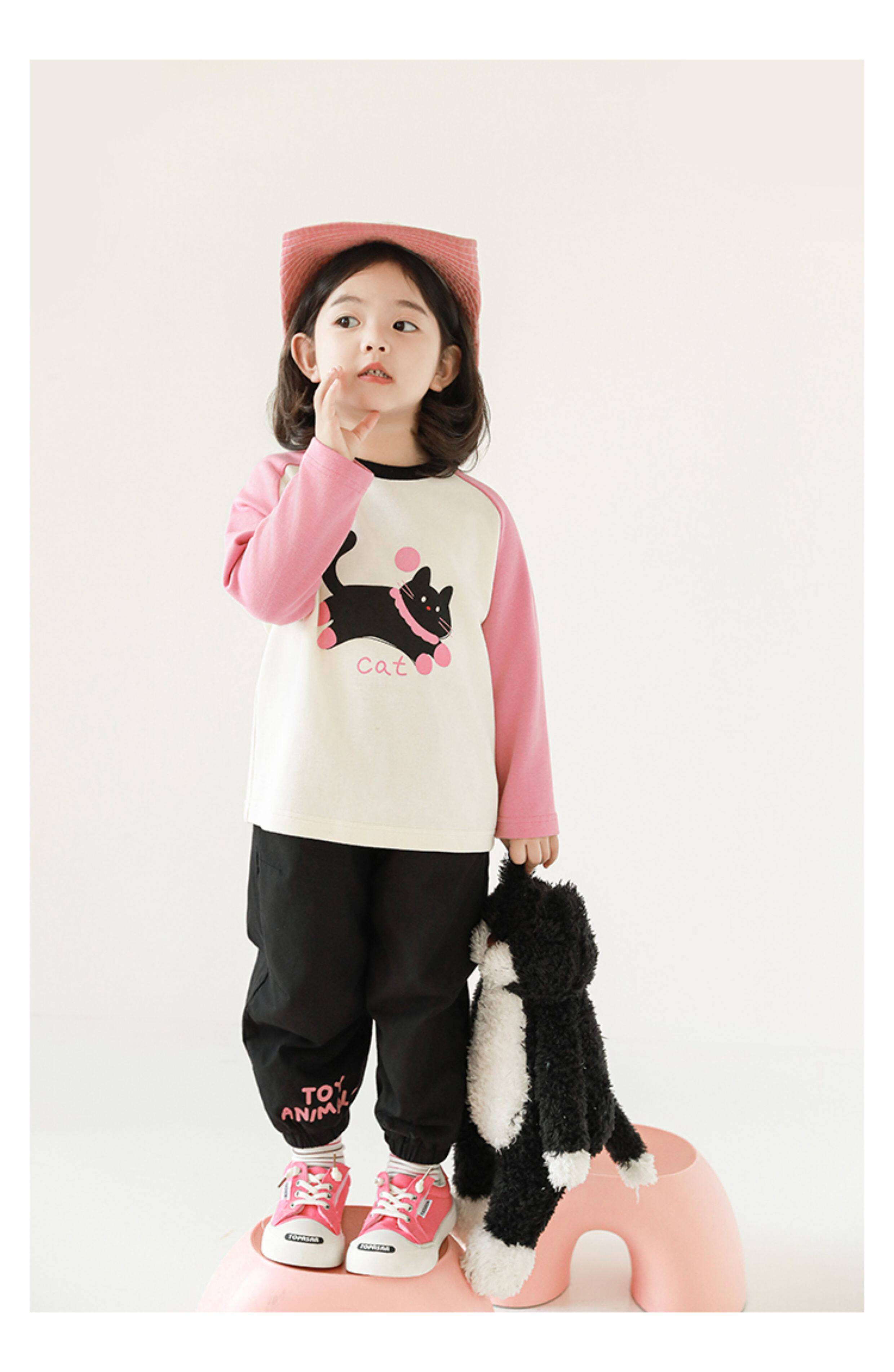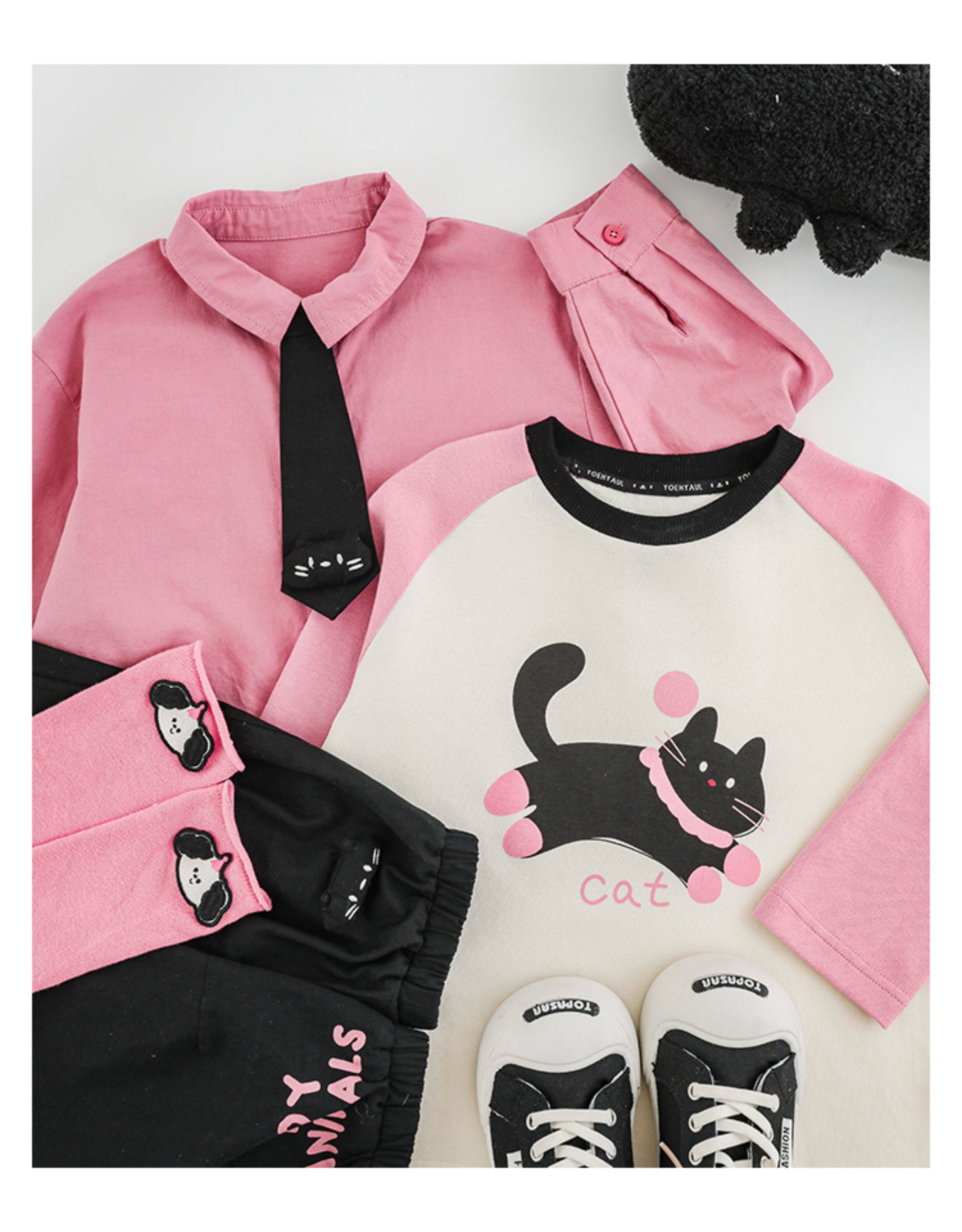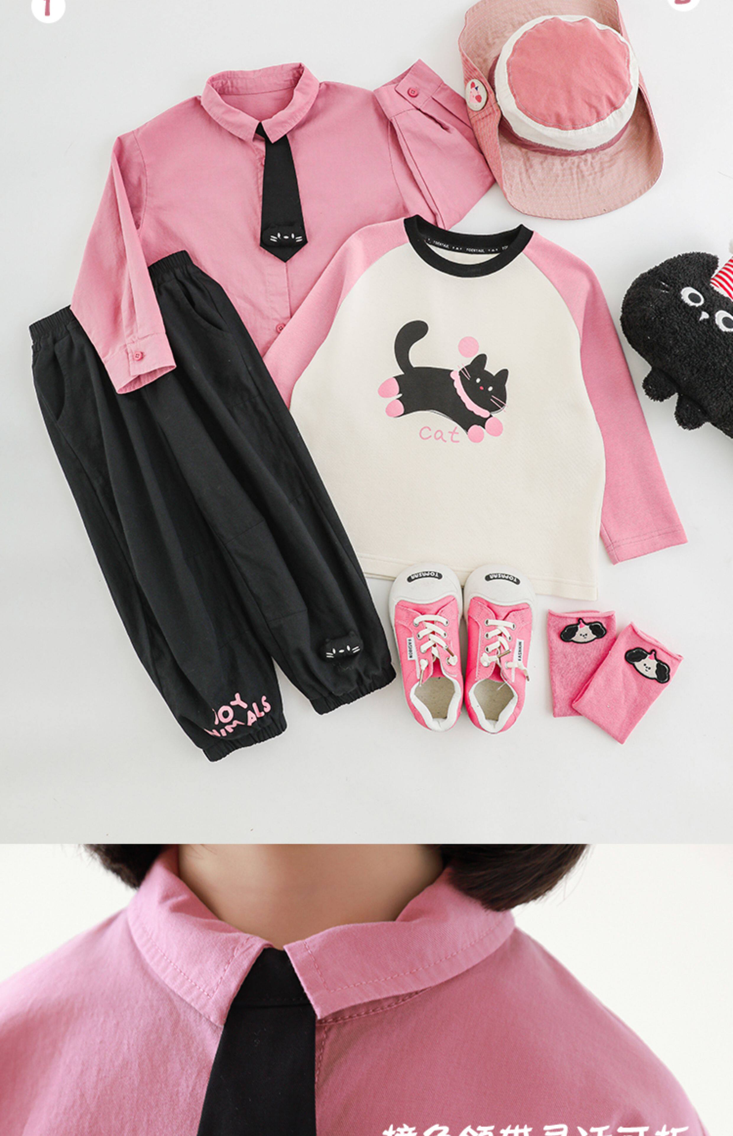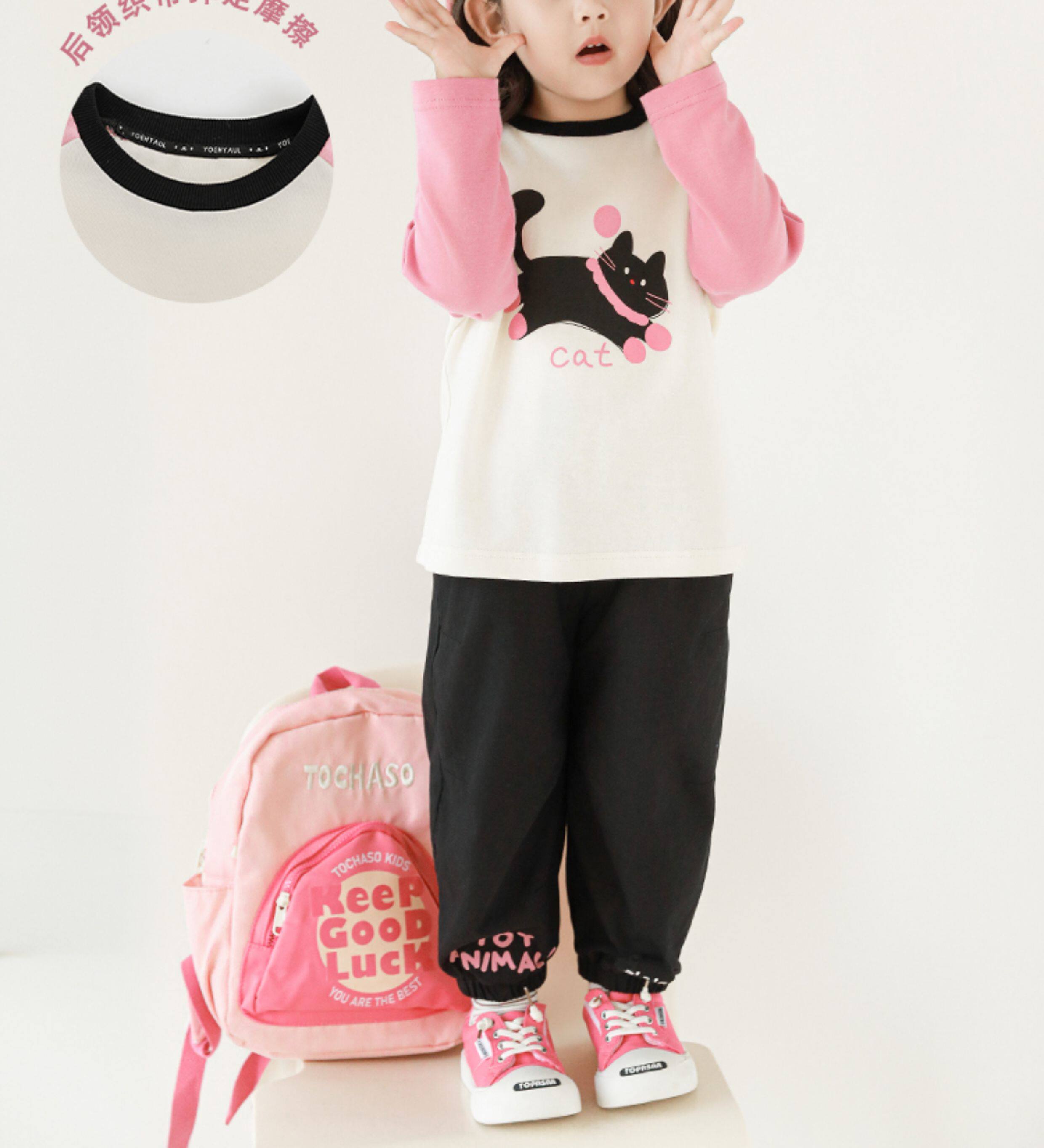 우리부이 여아 귀여운 애완동물 파라다이스 시리즈 봄 배색 래글런 티셔츠 심플하고 상큼한 카라 셔츠와 바지스토어 가기