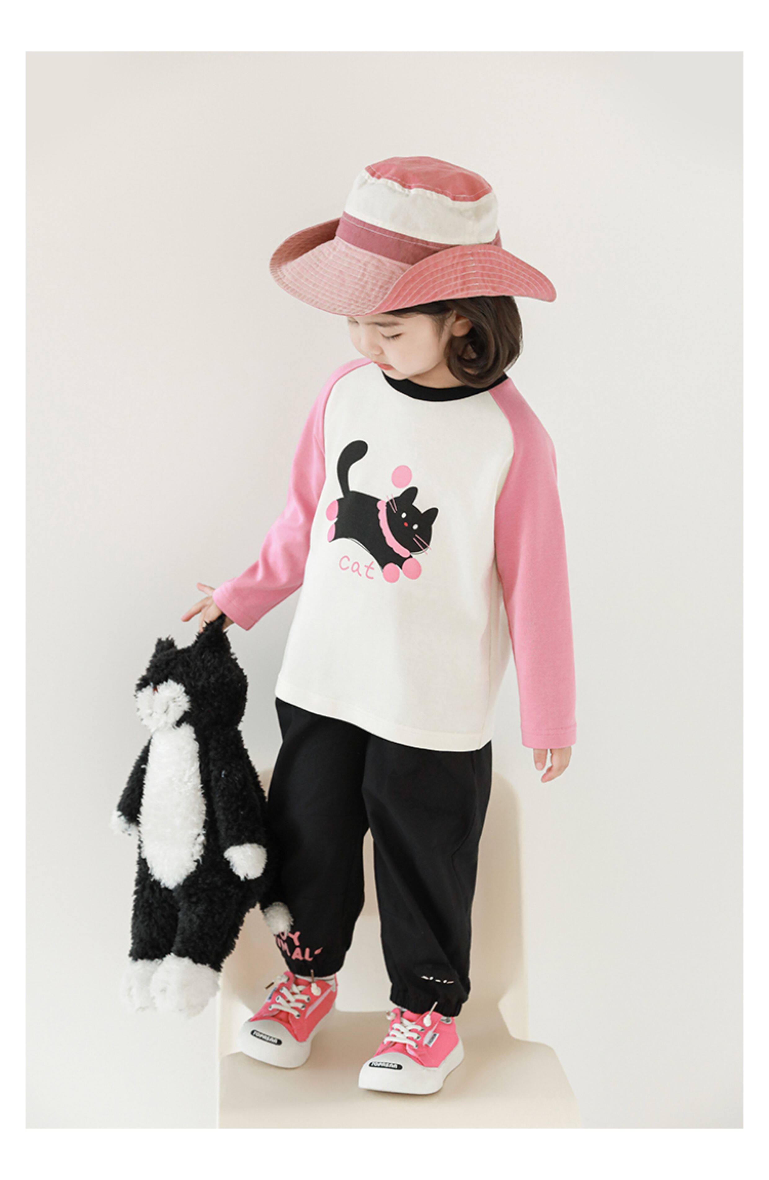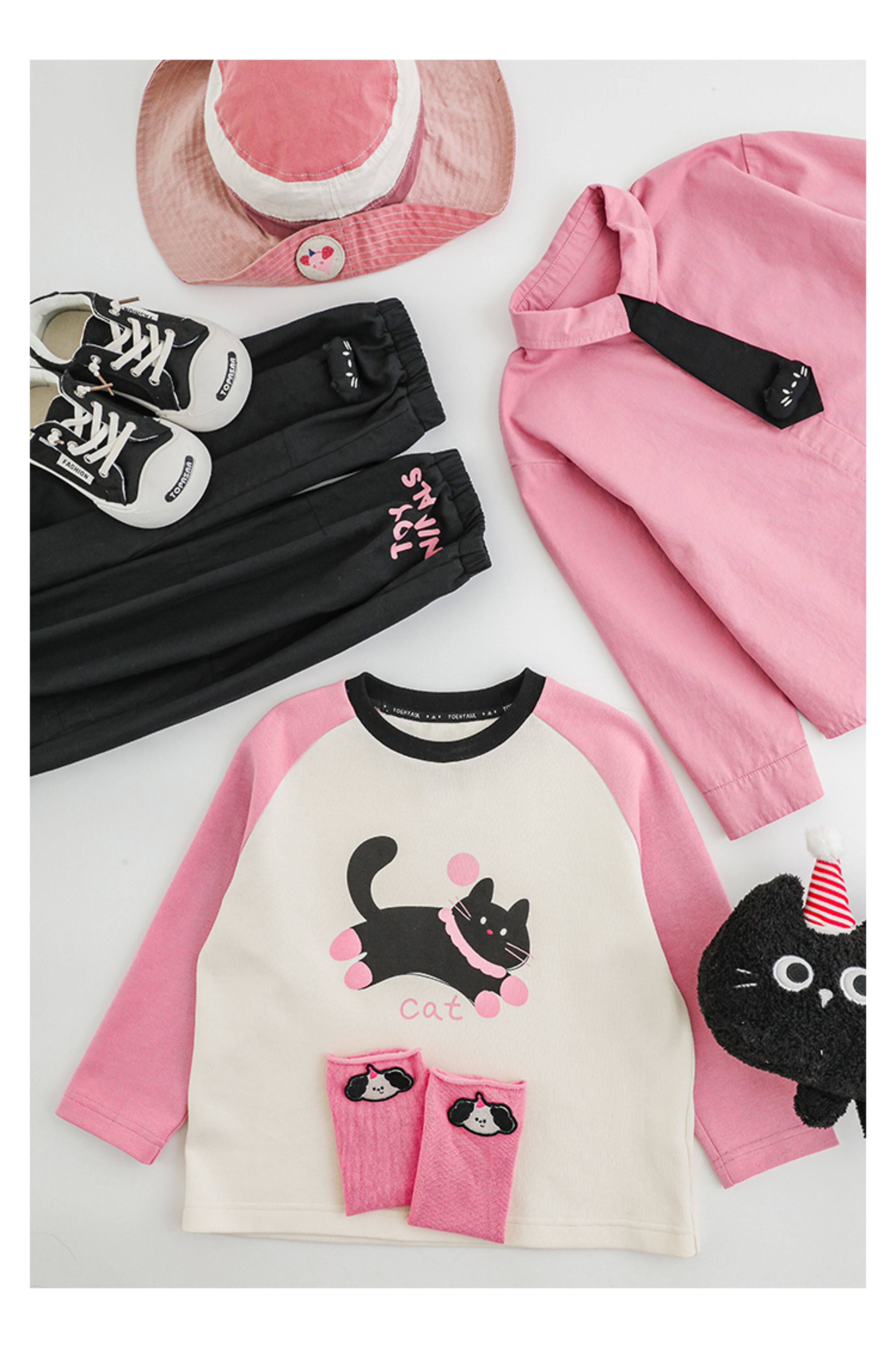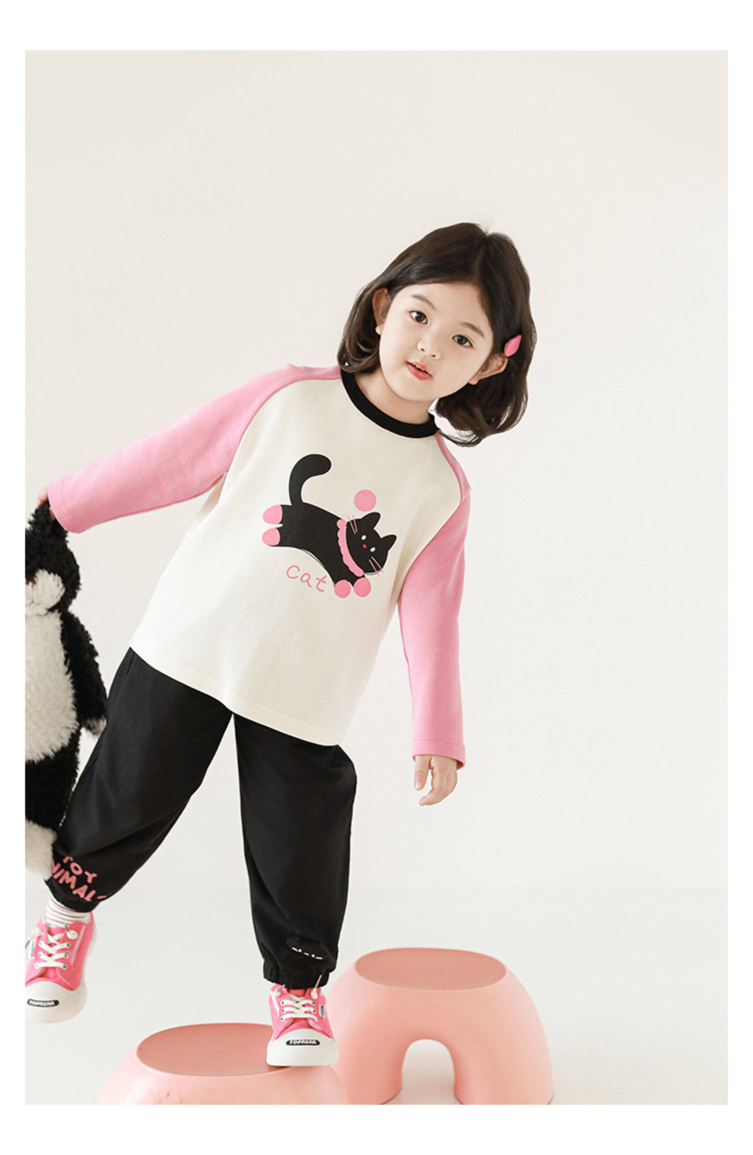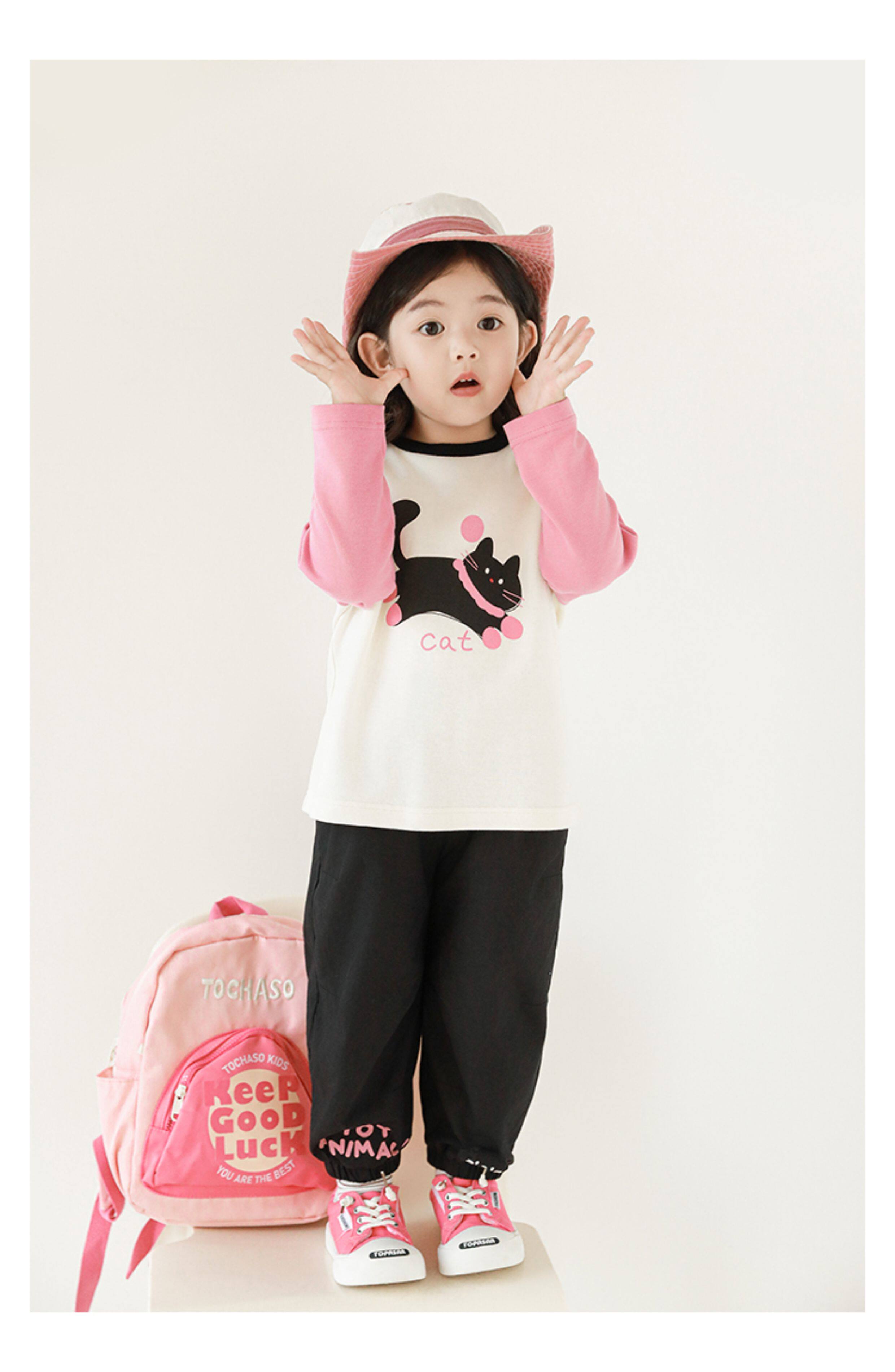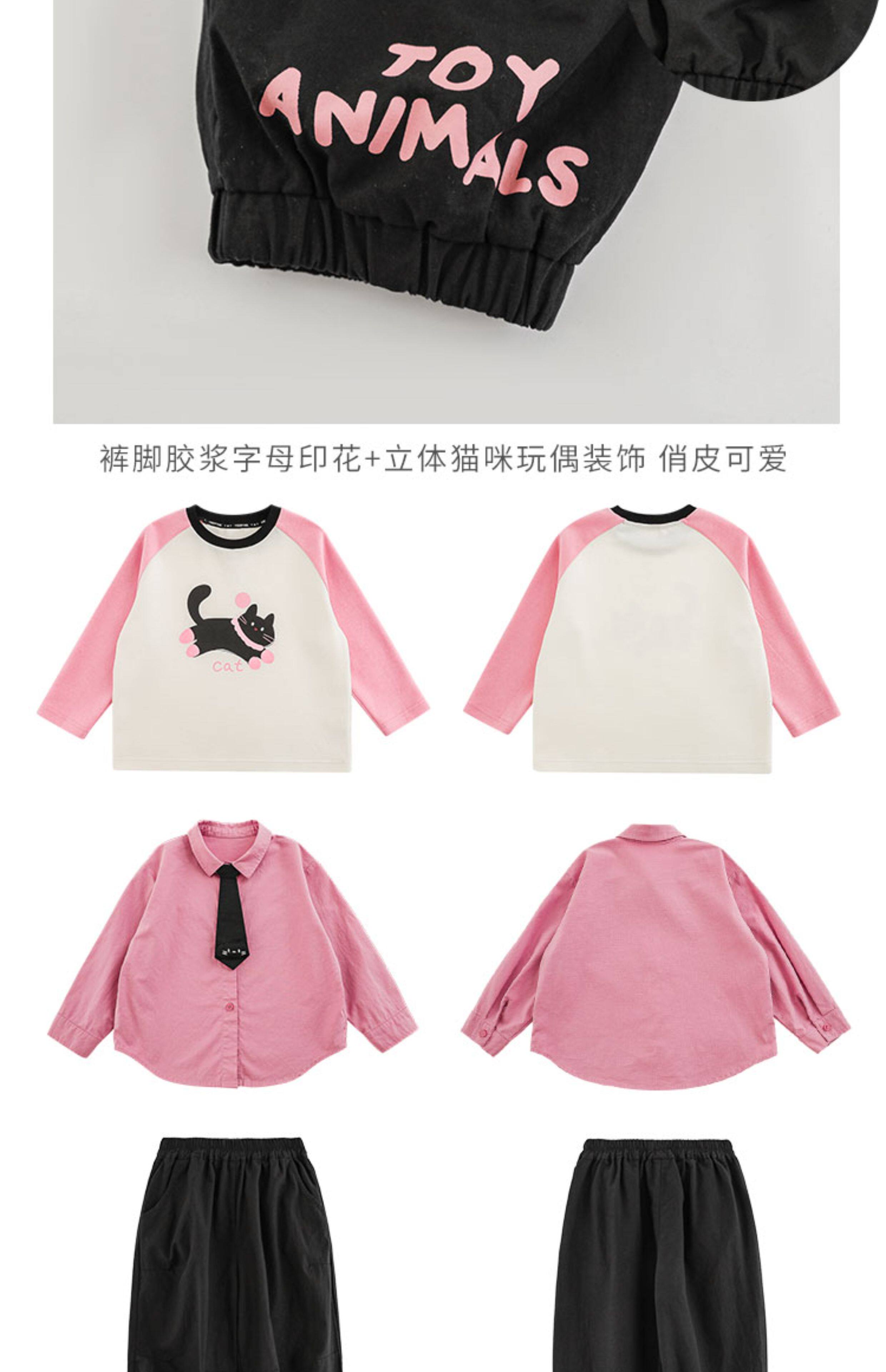 우리부이 여아 귀여운 애완동물 파라다이스 시리즈 봄 배색 래글런 티셔츠 심플하고 상큼한 카라 셔츠와 바지스토어 가기