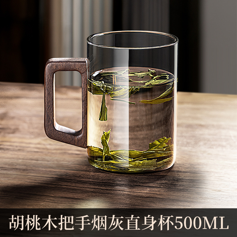 높은 붕규산 고온 저항하는 단단한 나무 손잡이 컵 커피 컵 사무실 컵 연기 회색 유리 컵 내구성 컵