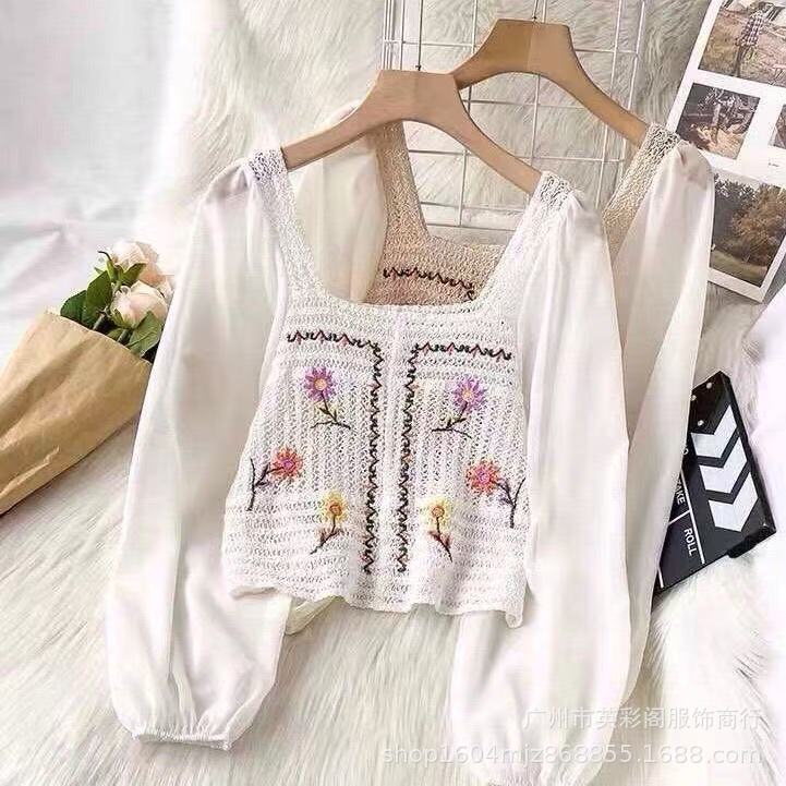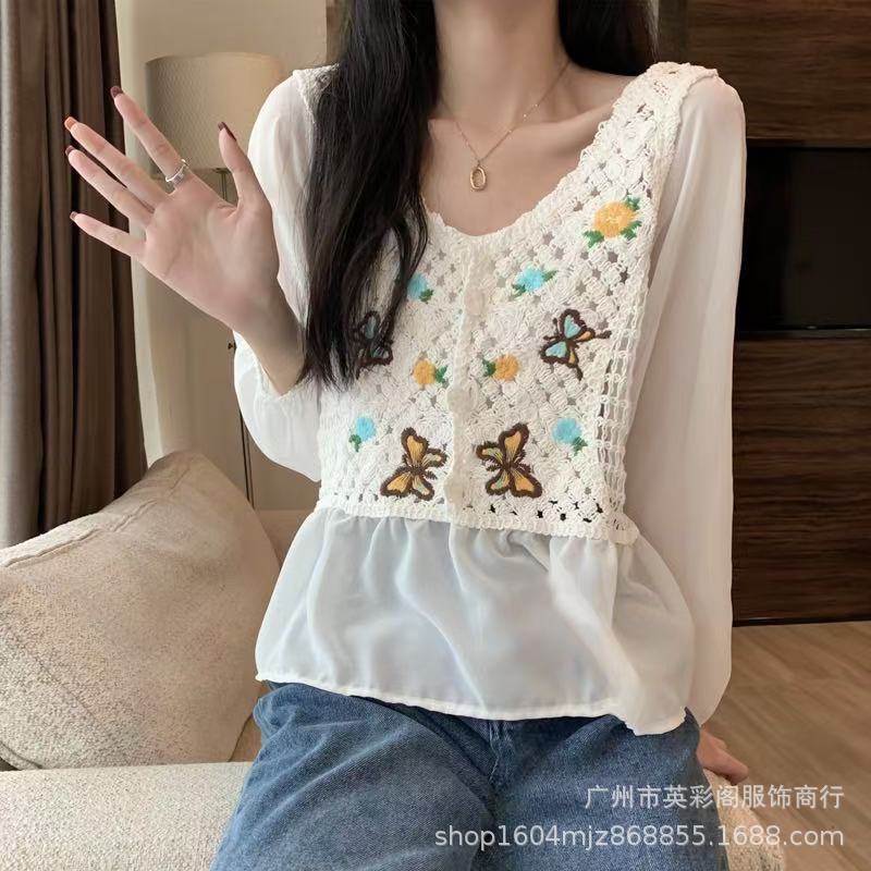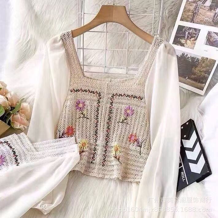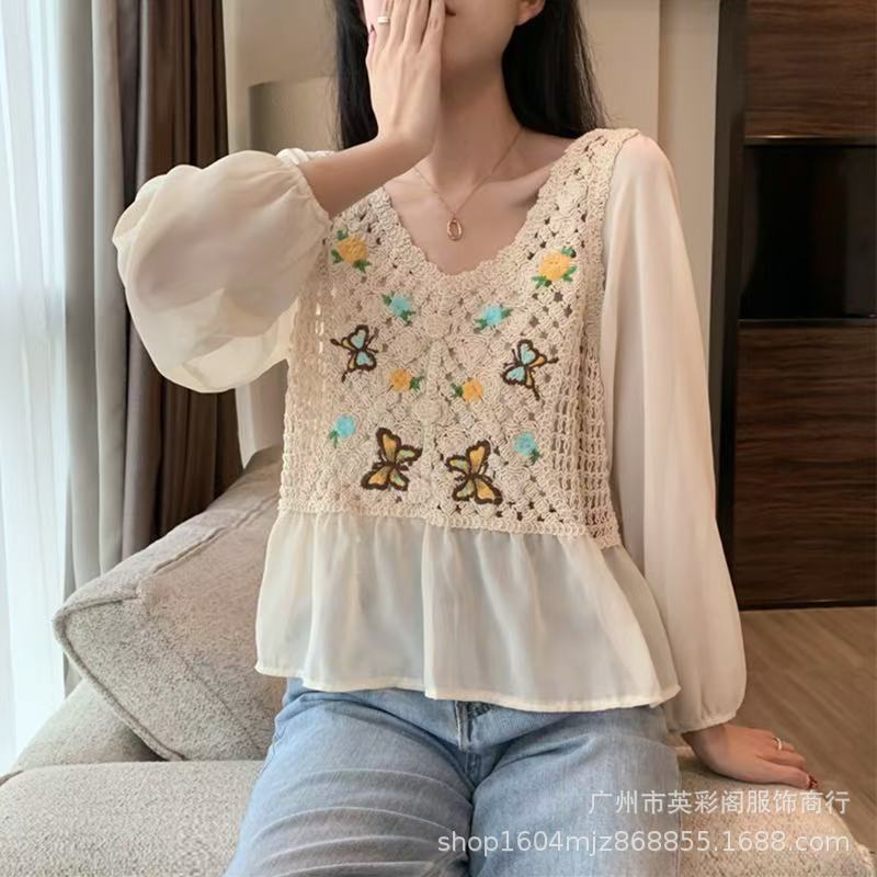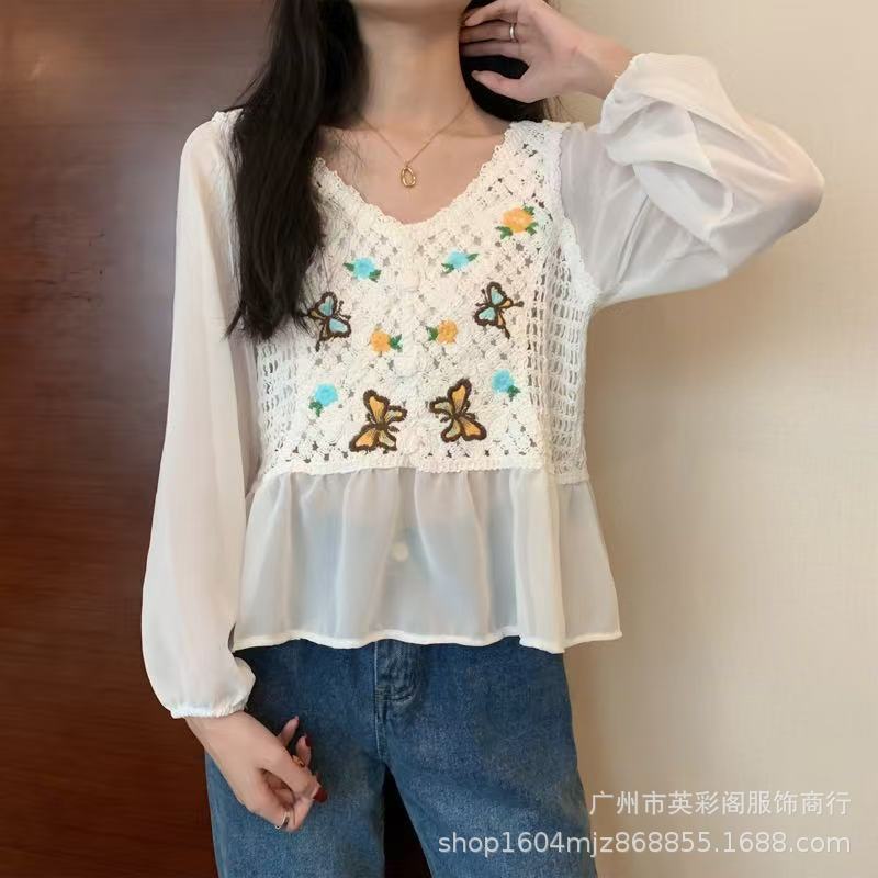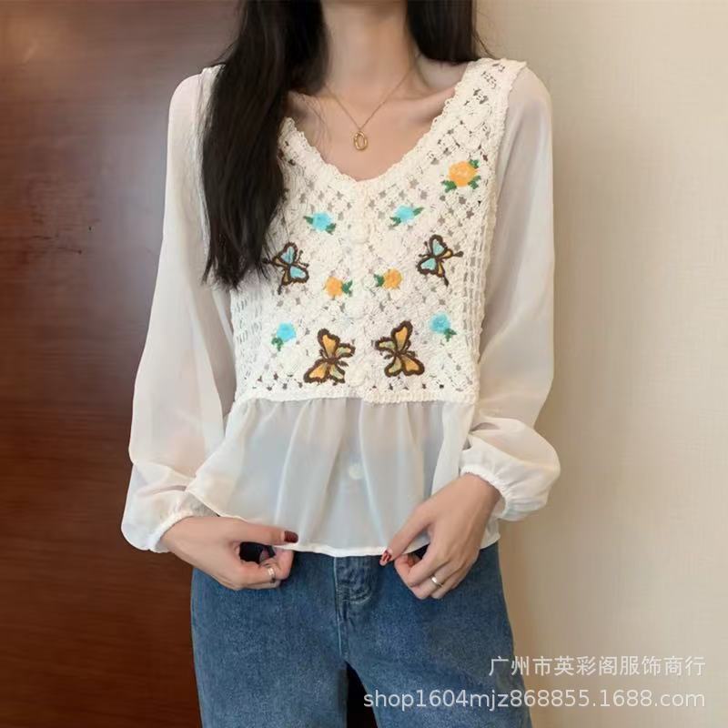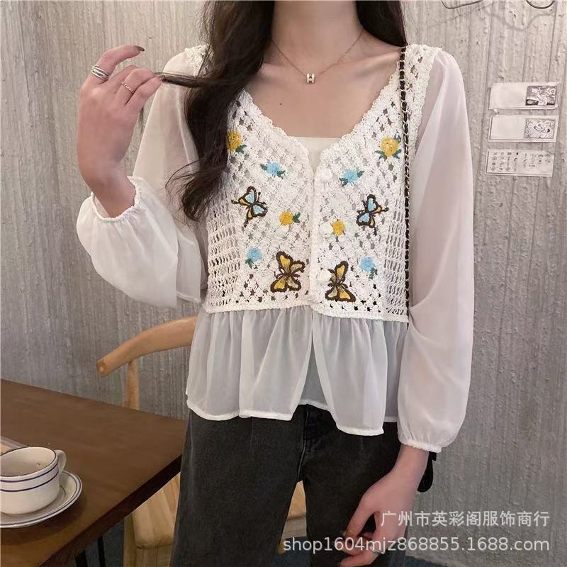 쉬폰 셔츠 슈퍼 요정 봄 여성용 할로우 젠틀 스타일 느슨한 새 스타일 선 스크린 의류 작은 신선한 긴팔 짧은 최고 트렌디스토어 가기