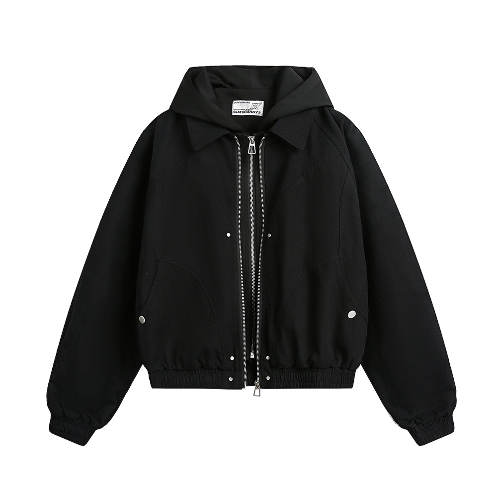 가짜 2 피스 더블 레이어 지퍼 바느질 후드 짧은 재킷 트렌디 하이 스트리트 디자인 센스 해체 작업 재킷 남성복스토어 가기