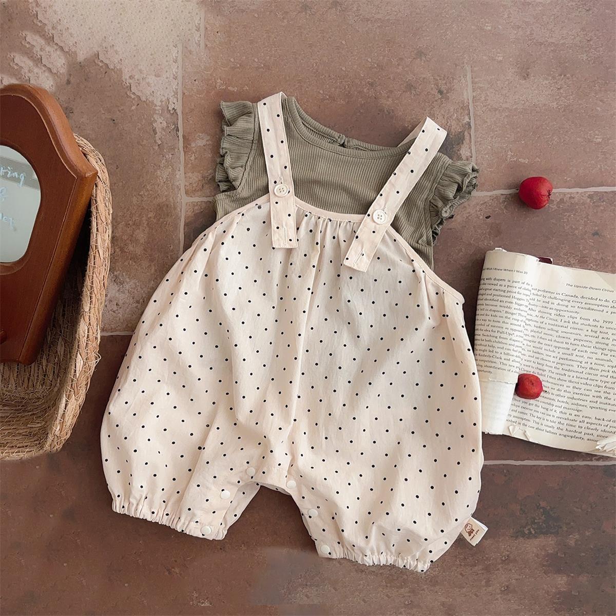 한국 아동복 여아옷 투피스 세트, 세련된 물방울 무늬 A급 멜빵바지 세트, 긴팔 외출복, 0-2세
