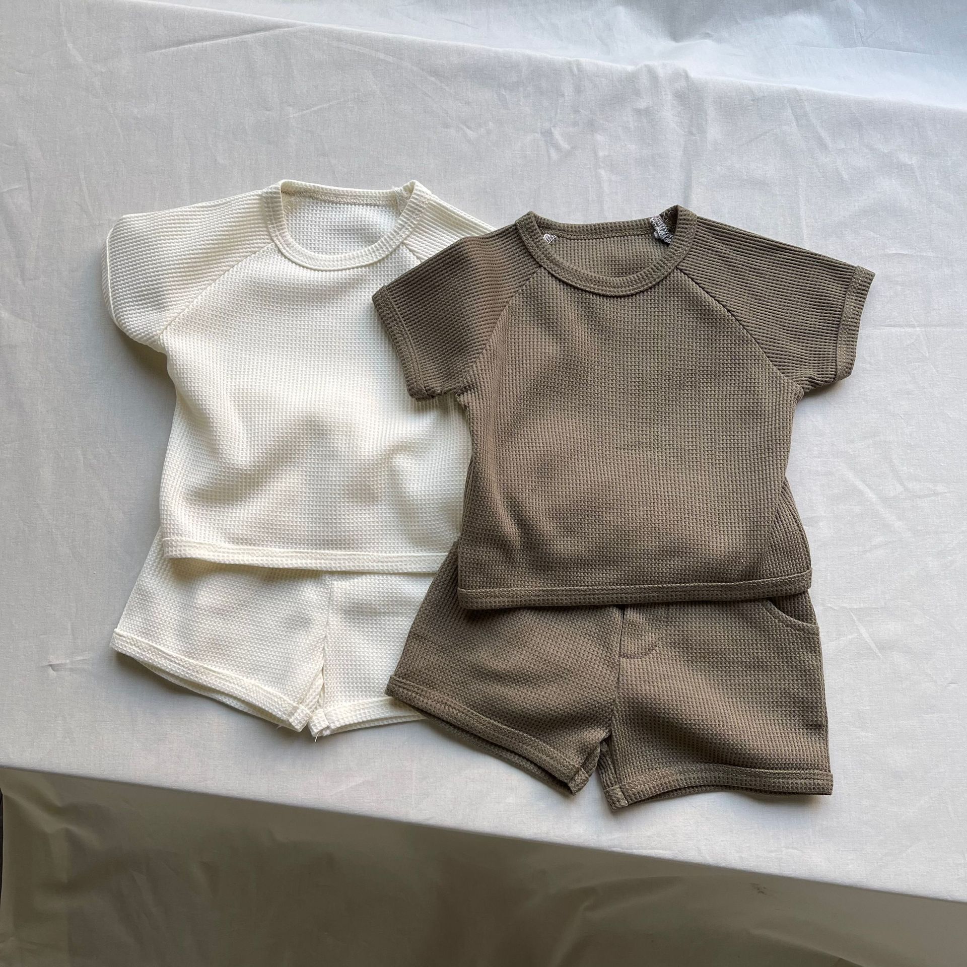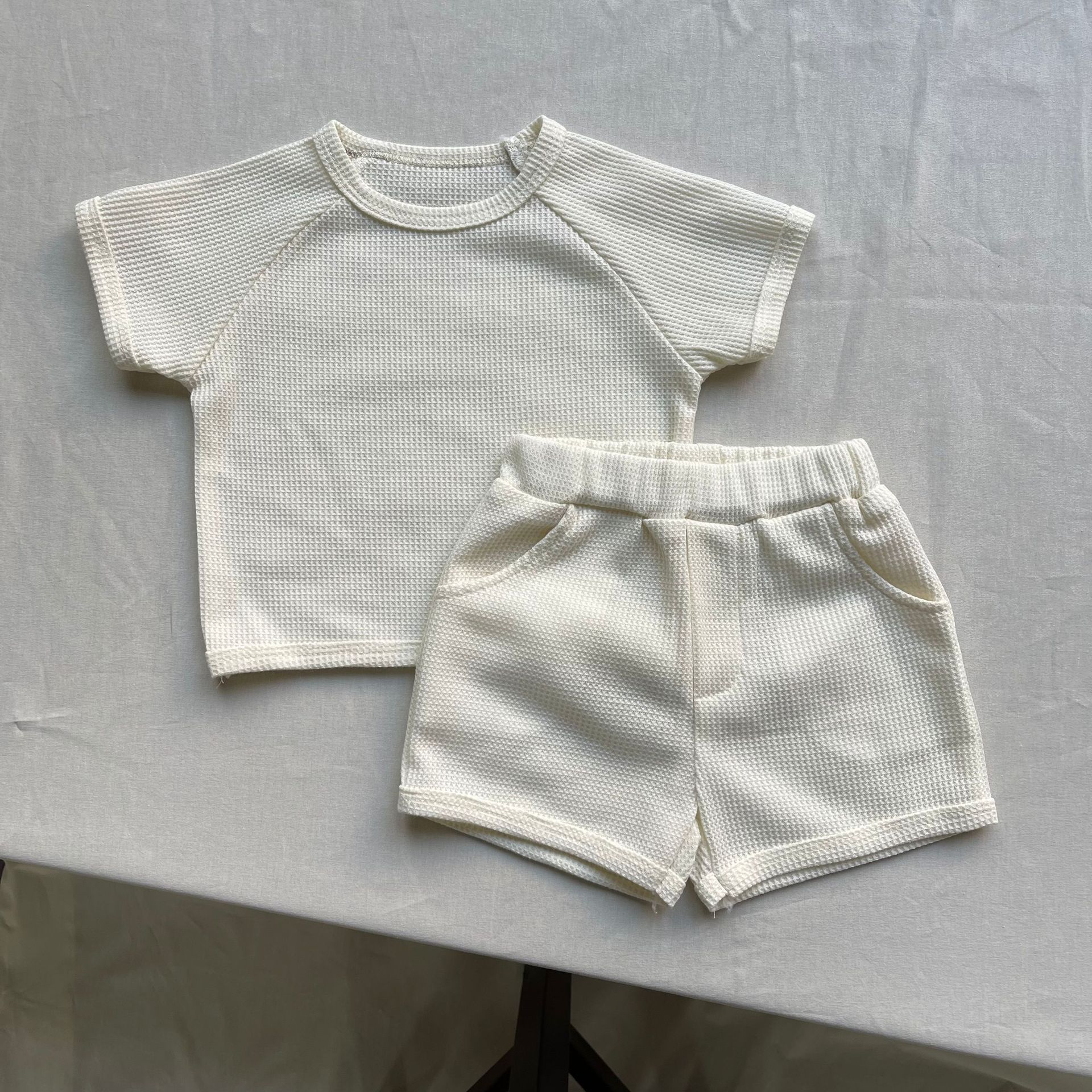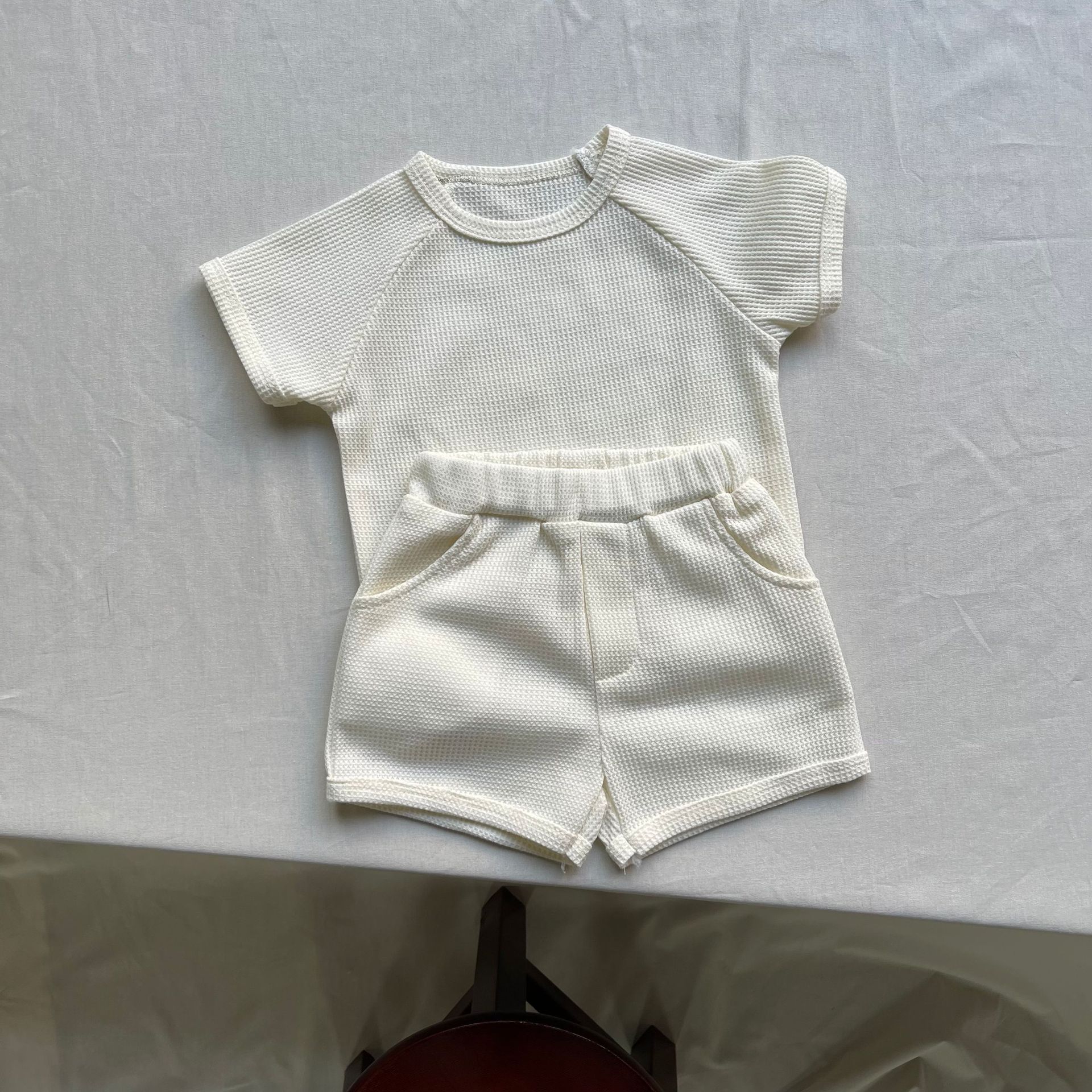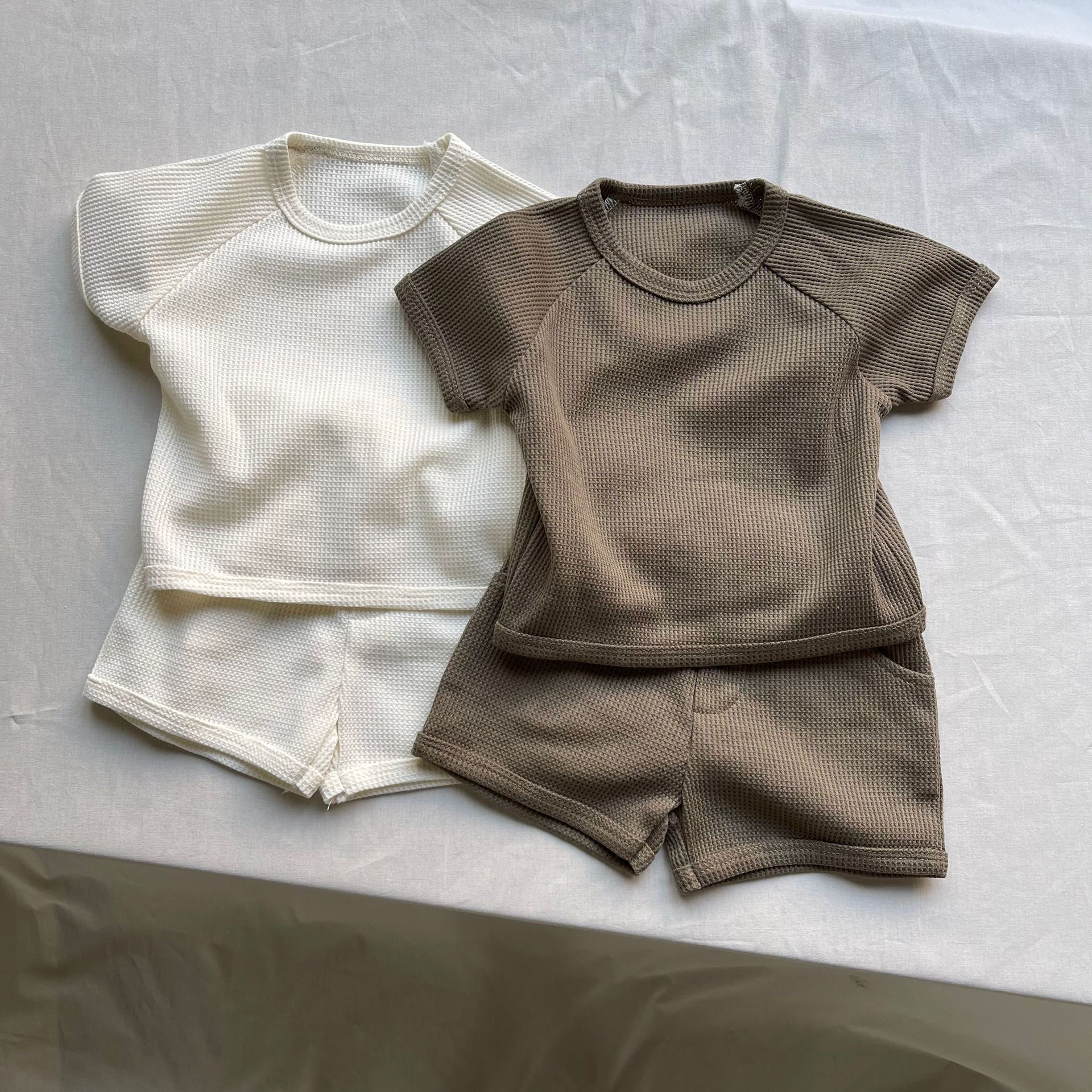 모리 스타일 유행 와플러 소년과 소녀 북유럽 스타일 여름 아기 홈 솔리드 컬러 짧은 소매 반바지 세트