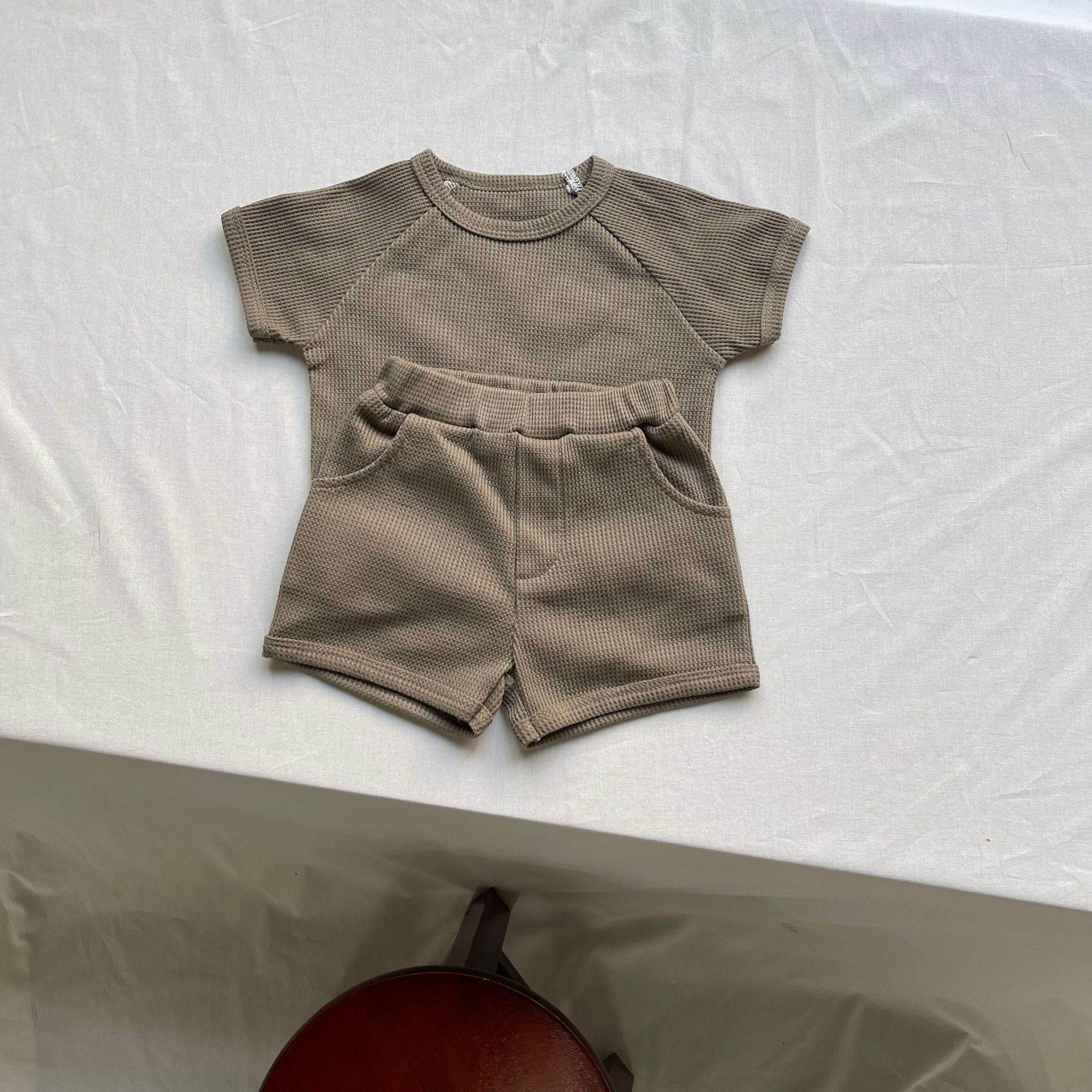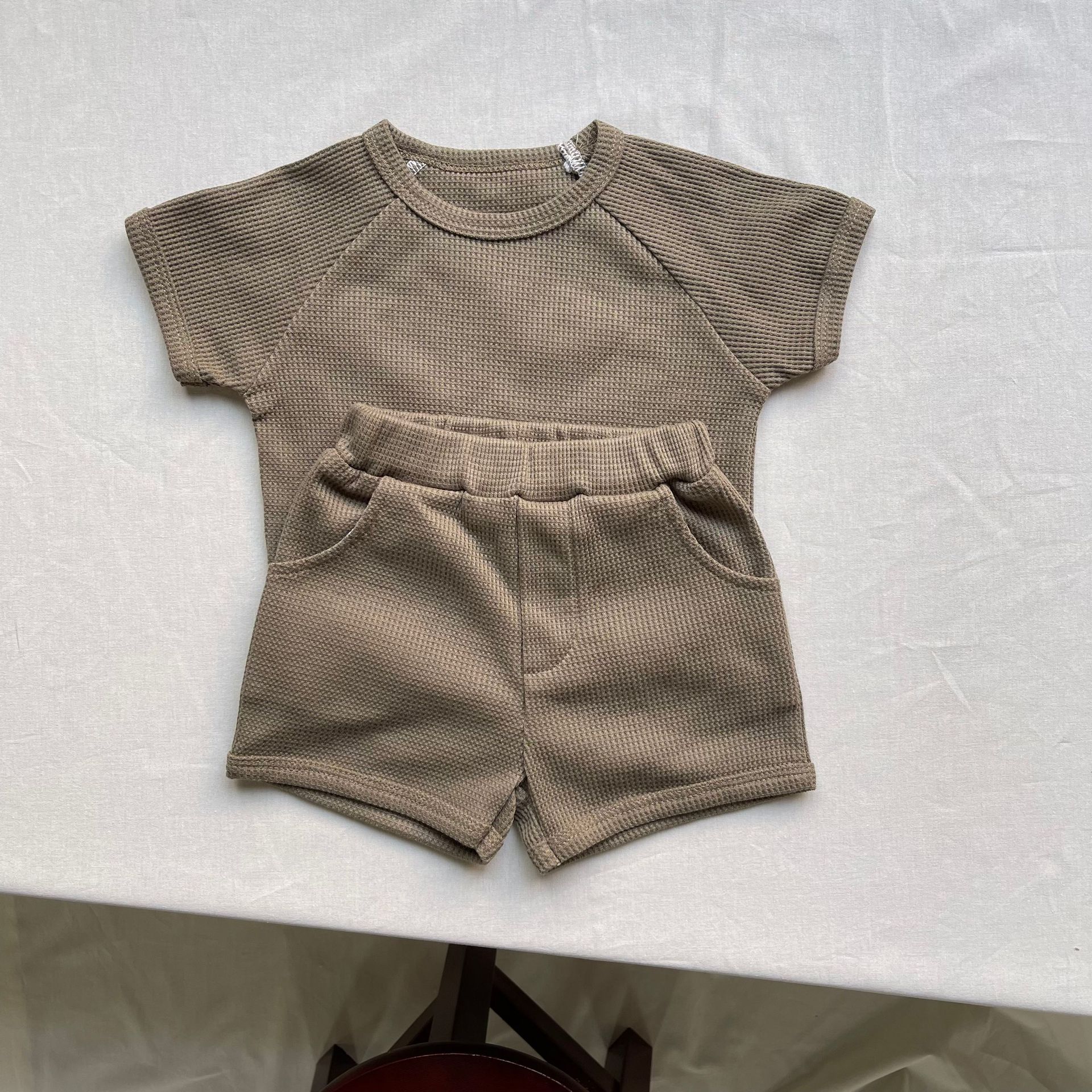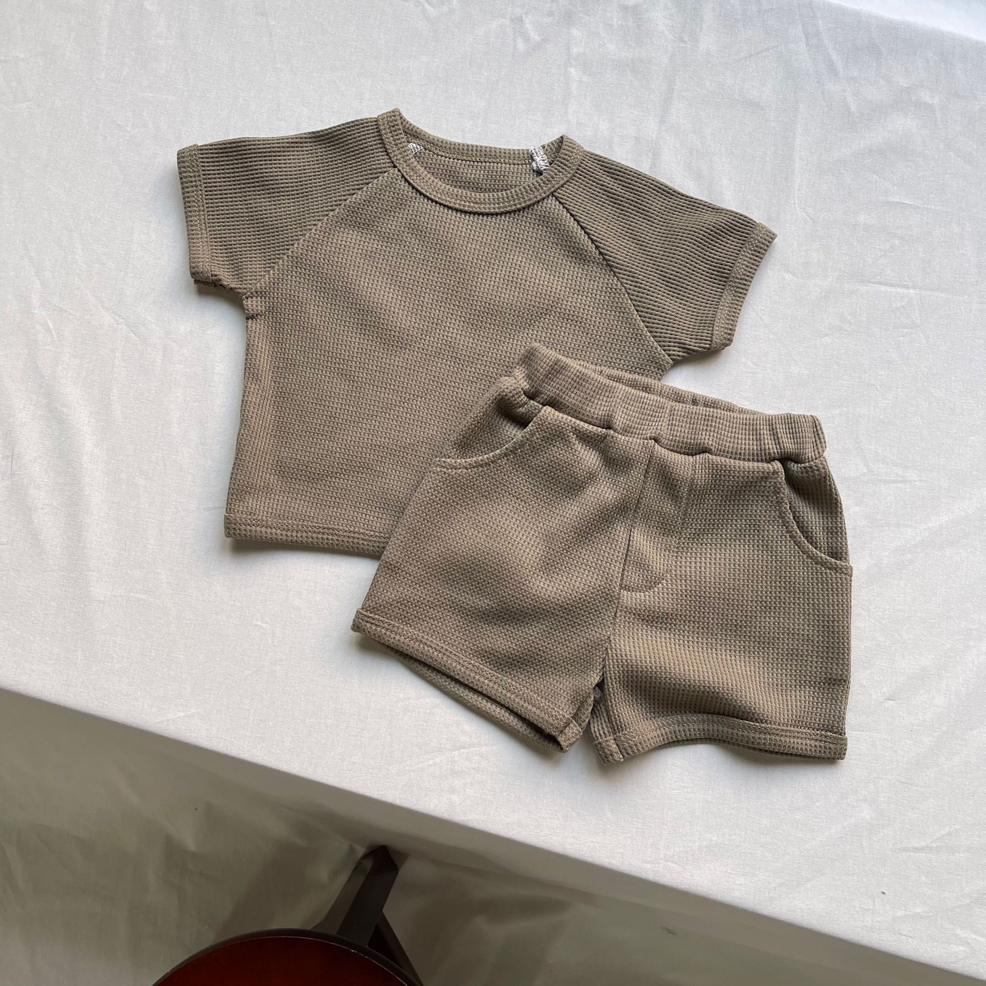 모리 스타일 유행 와플러 소년과 소녀 북유럽 스타일 여름 아기 홈 솔리드 컬러 짧은 소매 반바지 세트