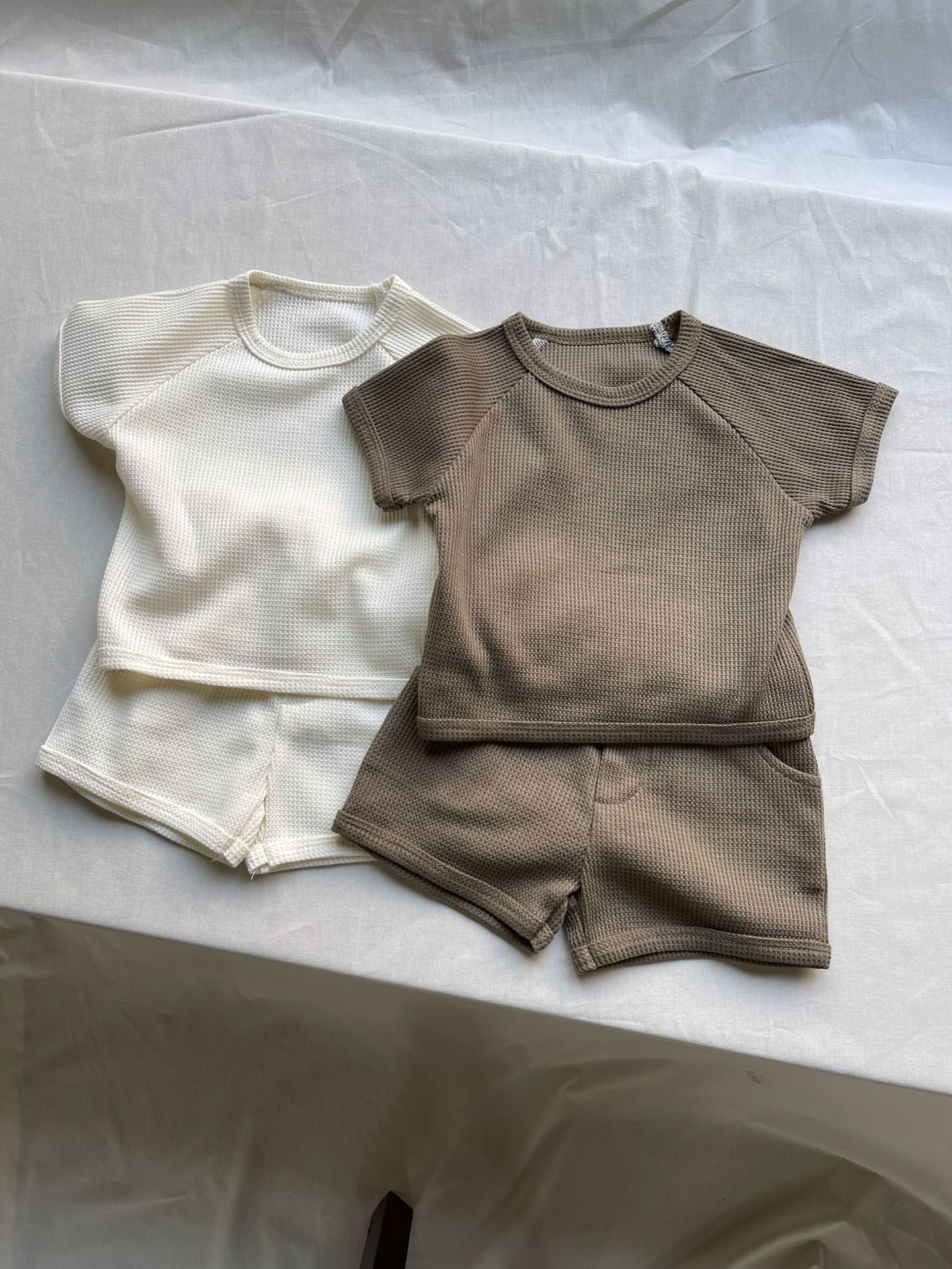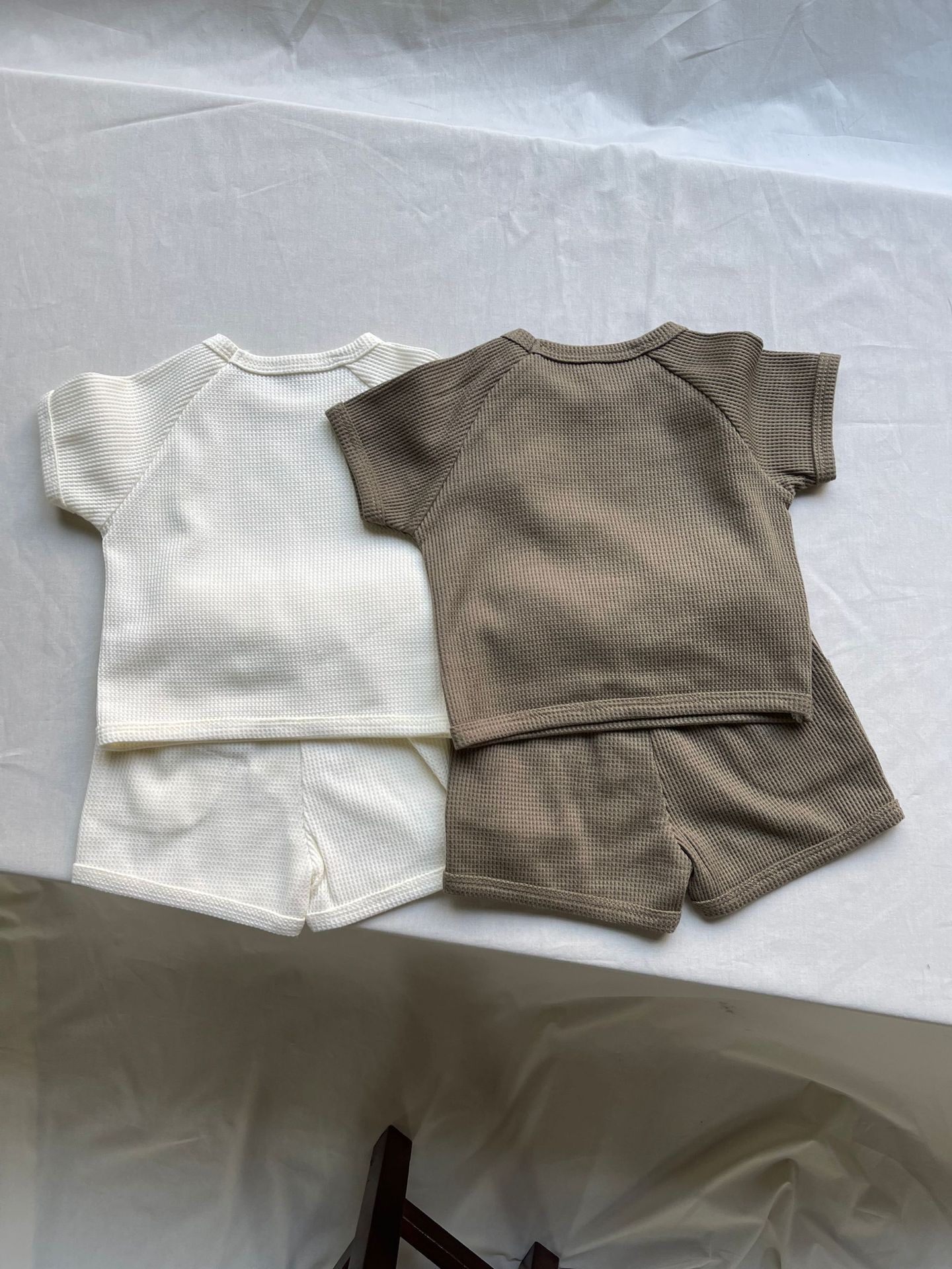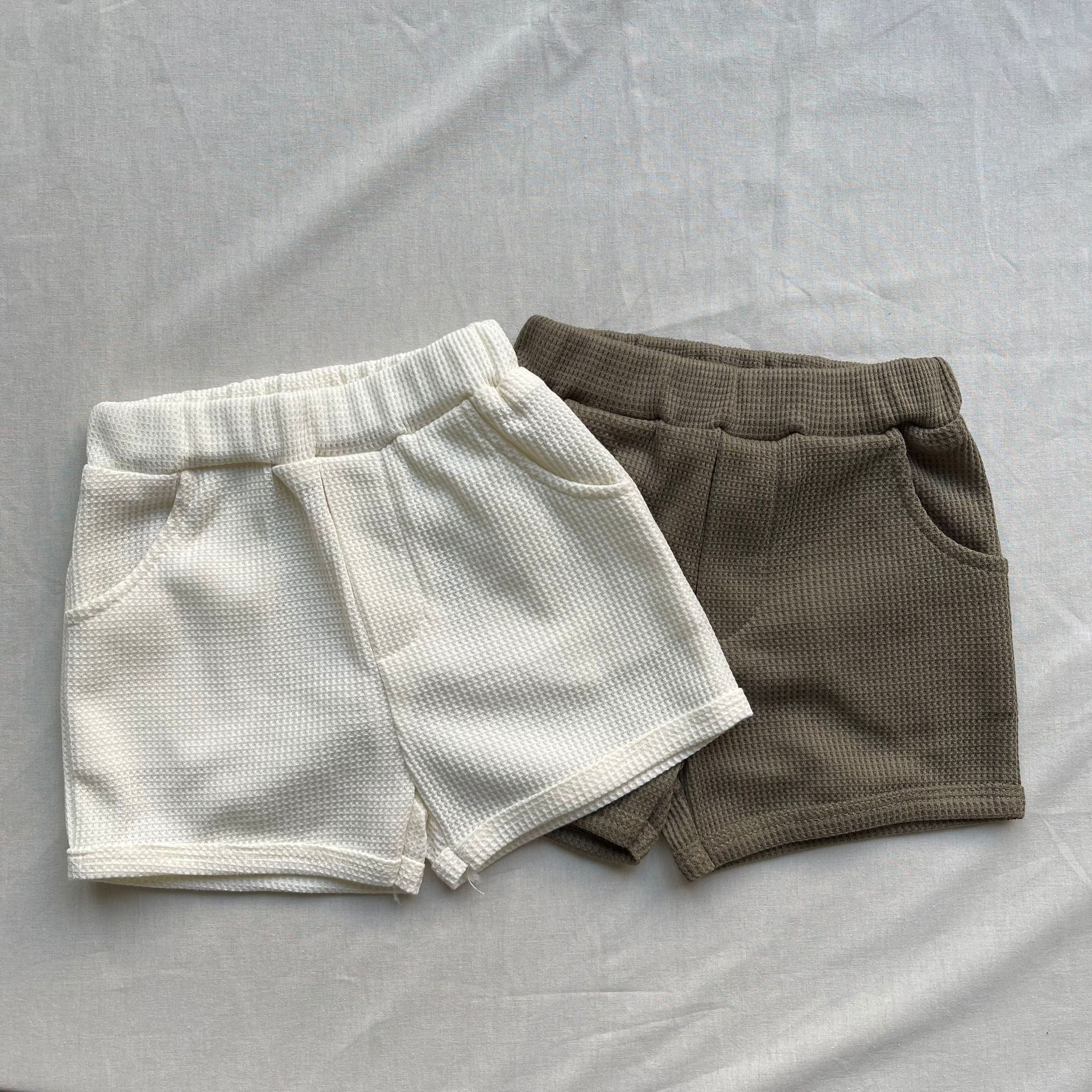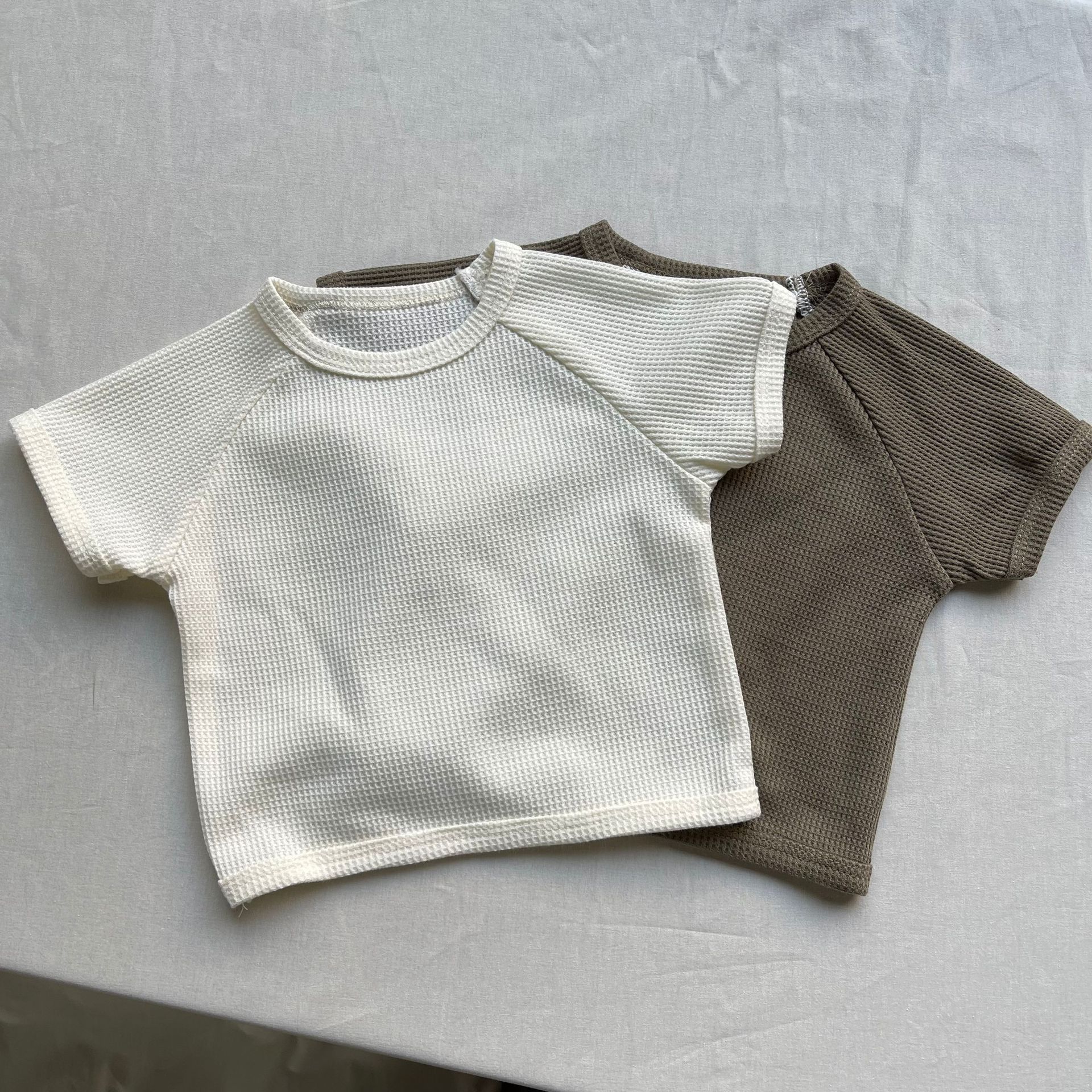 모리 스타일 유행 와플러 소년과 소녀 북유럽 스타일 여름 아기 홈 솔리드 컬러 짧은 소매 반바지 세트