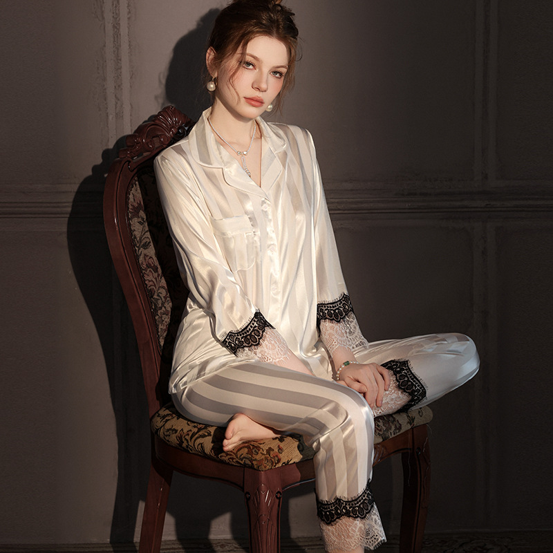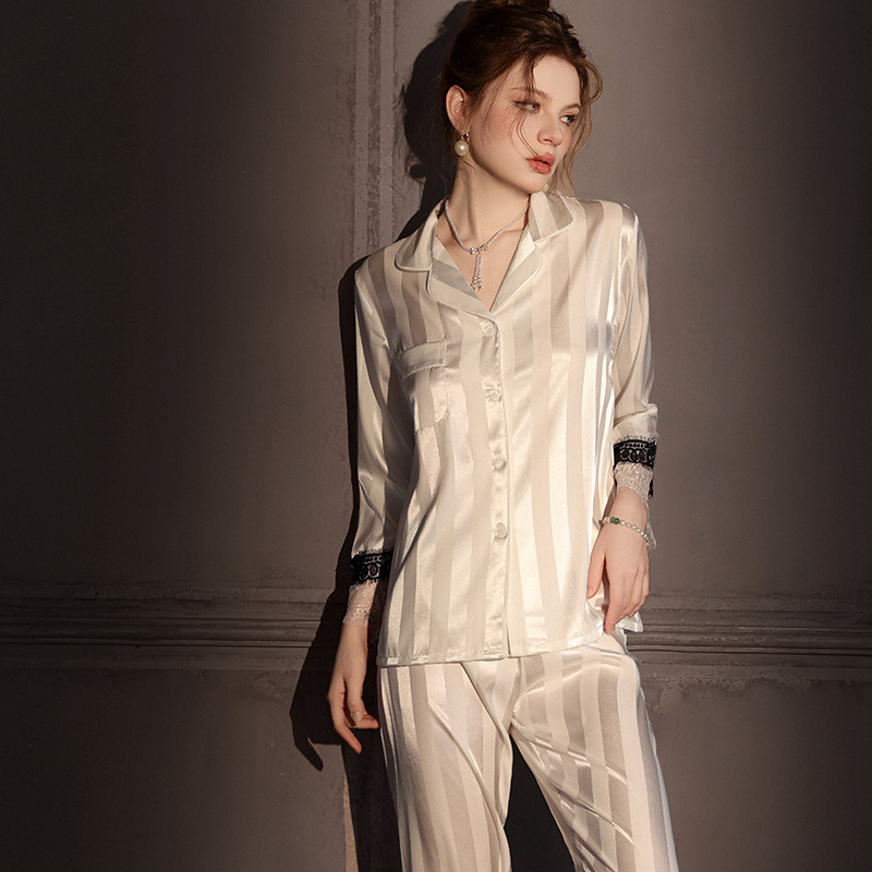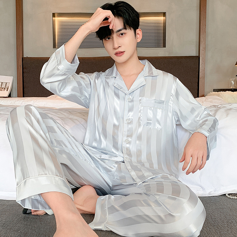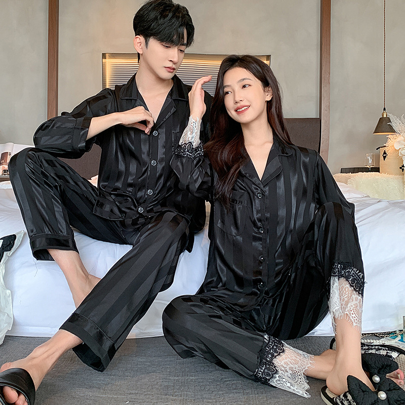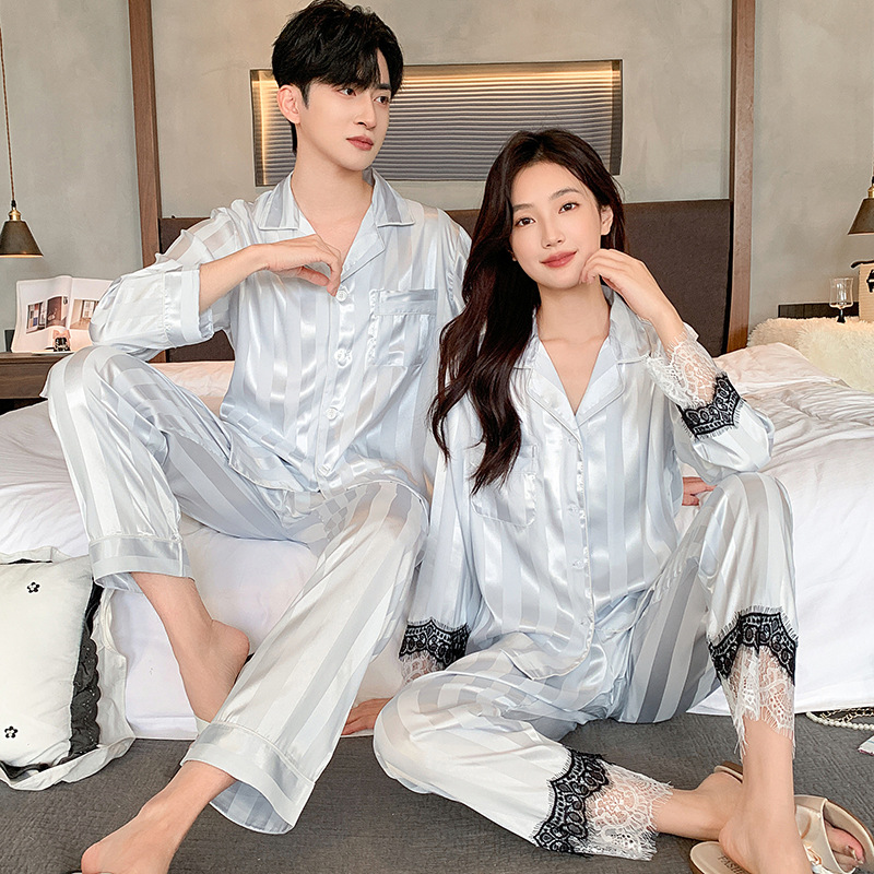 커플 잠옷 여성 아이스 실크 모조 실크 긴팔 여름 하이 엔드 홈 의류 봄과 가을 남성 줄무늬 얇은 세트