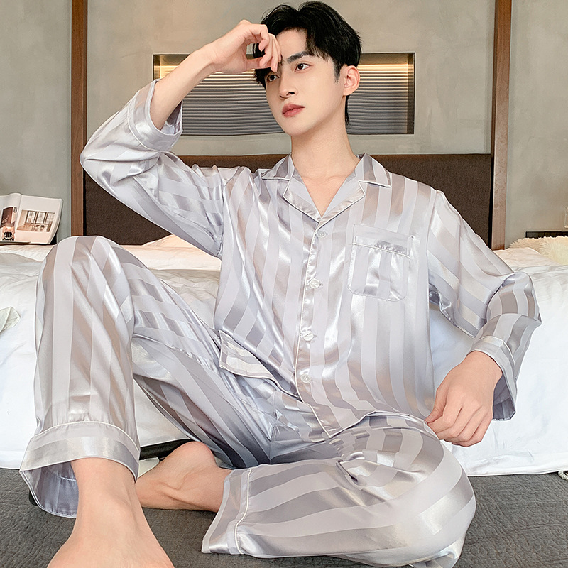 커플 잠옷 여성 아이스 실크 모조 실크 긴팔 여름 하이 엔드 홈 의류 봄과 가을 남성 줄무늬 얇은 세트스토어 가기