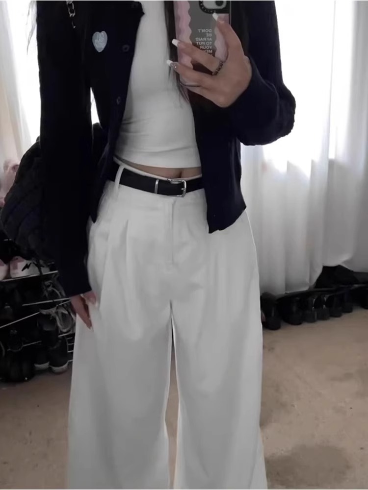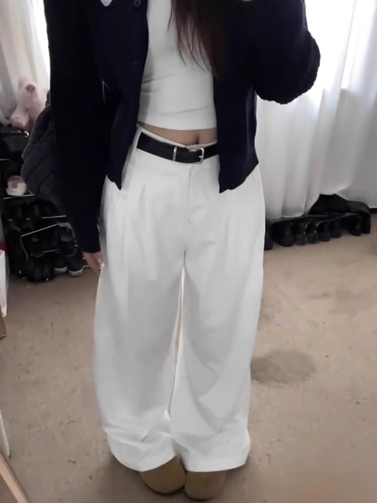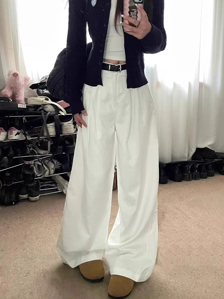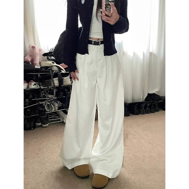 흰색 주름 넓은 다리 청바지 여성의 2025 봄 새로운 높은 허리 느슨한 드레이프 스트레이트 게으른 걸레 바지스토어 가기