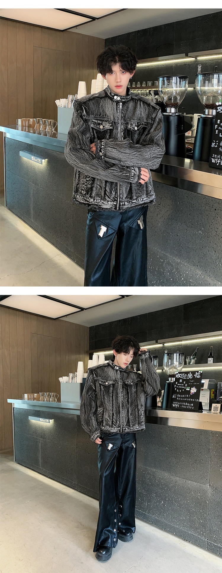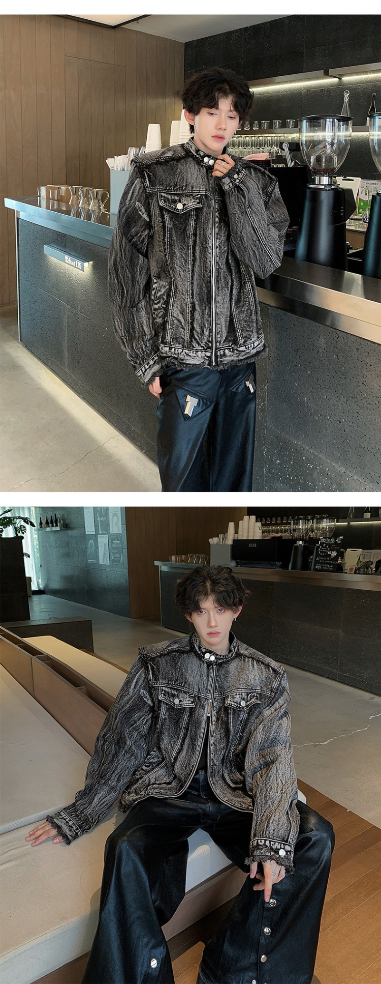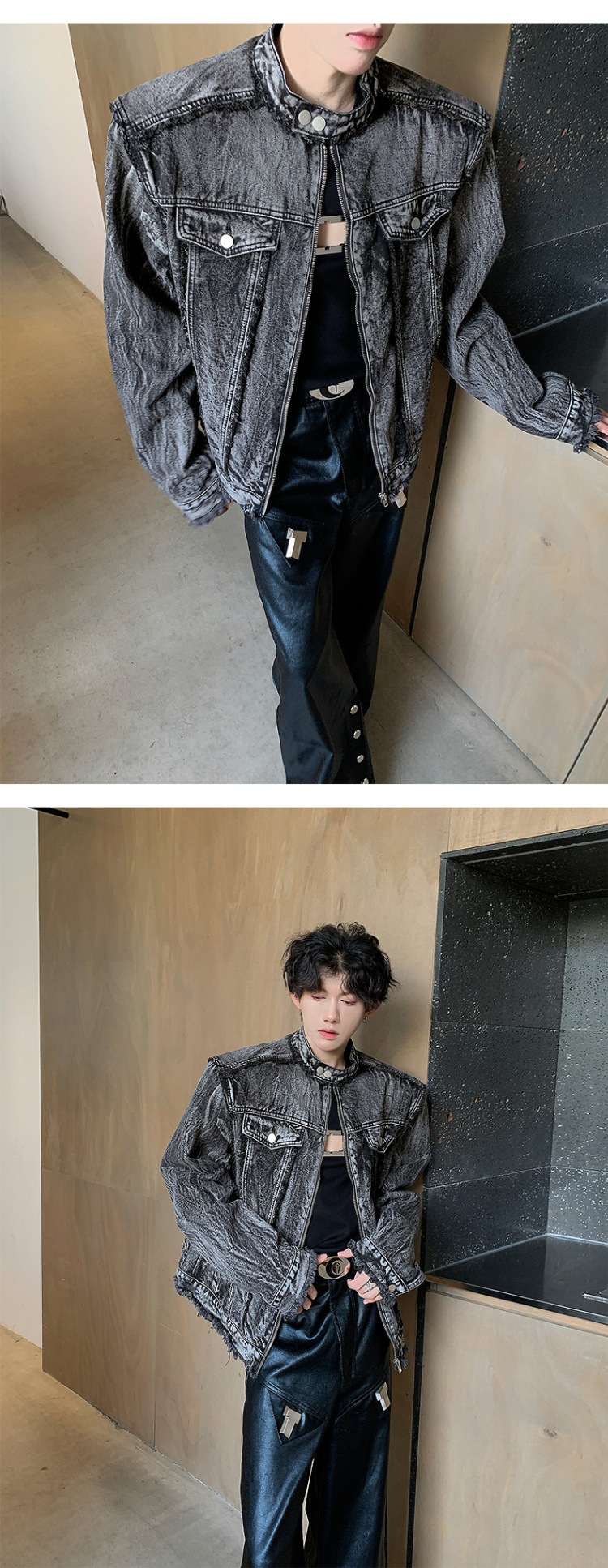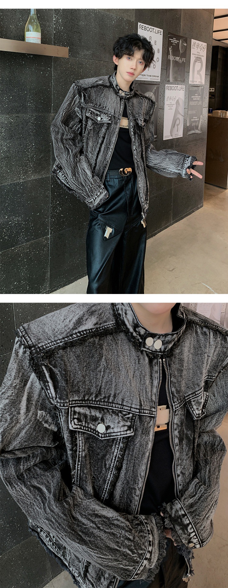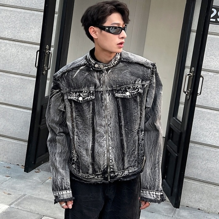 아메리칸 스타일 레트로 맞춤형 데님 재킷 남성 봄과 가을 하이 엔드 어깨 패드 재킷 유행 칼라 블랙 데님 재킷스토어 가기