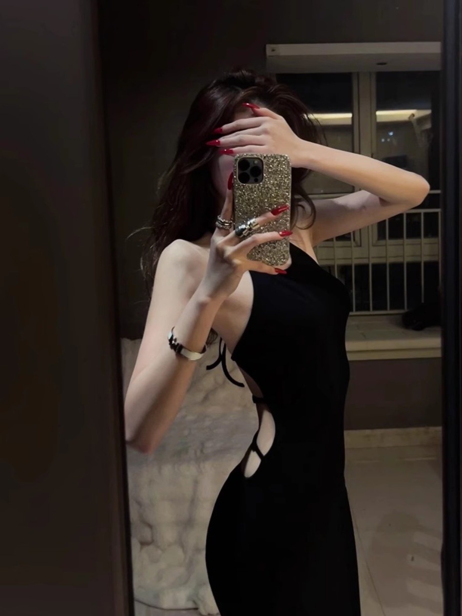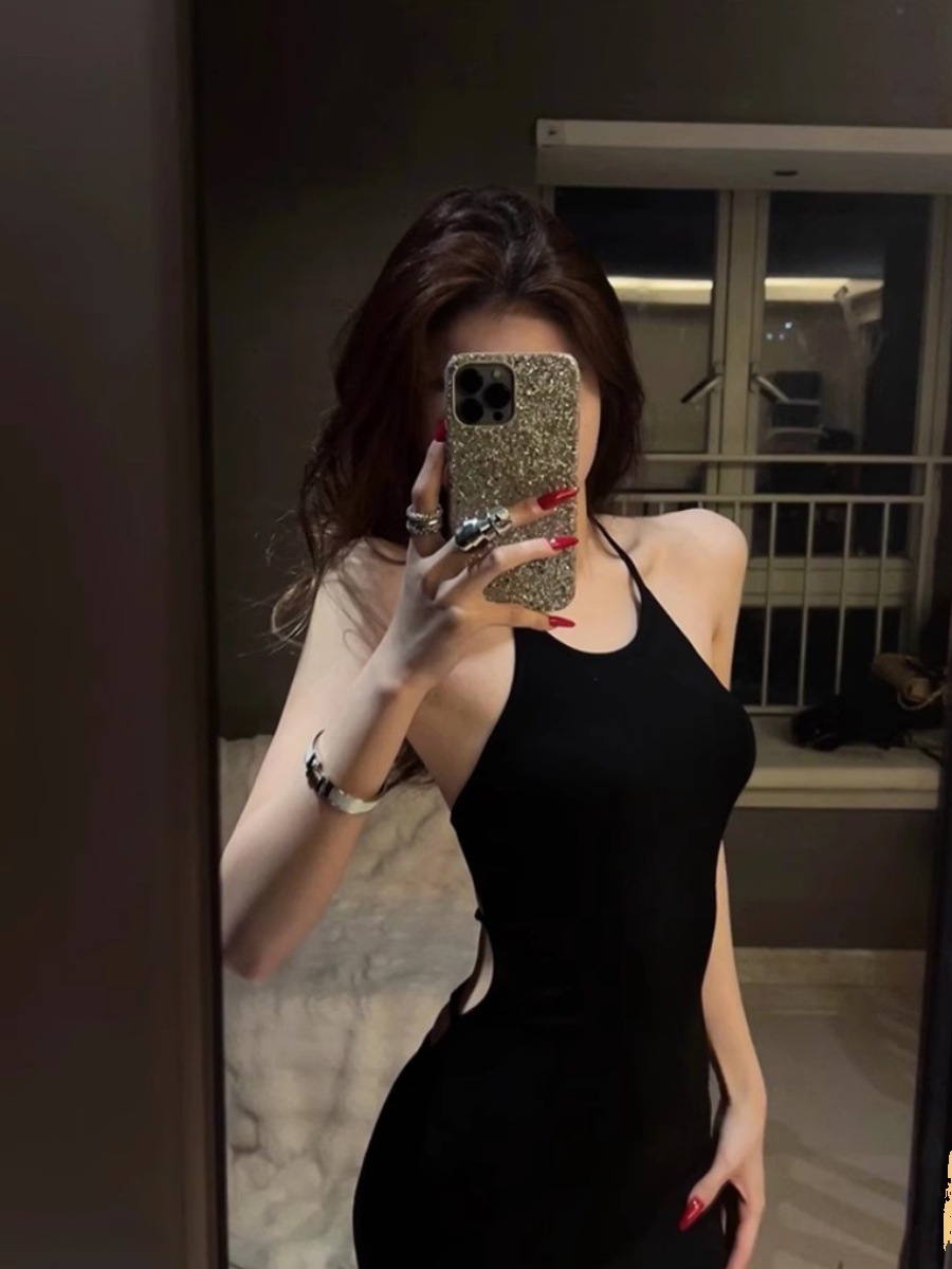 여름 여성을 위한 고급스럽고 시원한 블랙 백리스 홀터넥 드레스, 고급스러운 엄마 스타일 허리와 엉덩이를 감싸는 피쉬테일 롱 드레스
