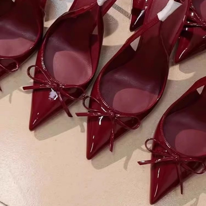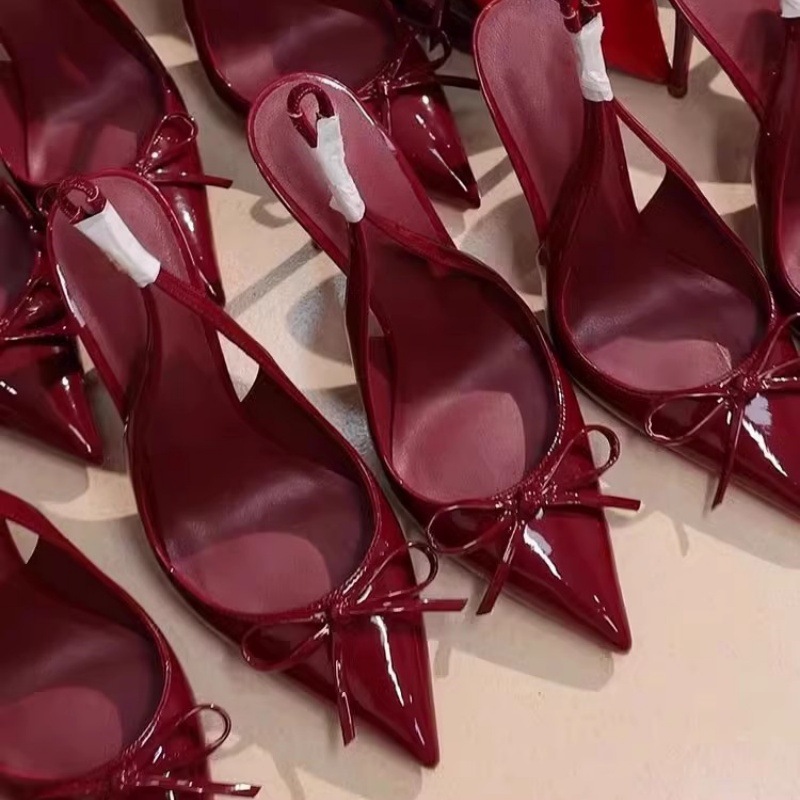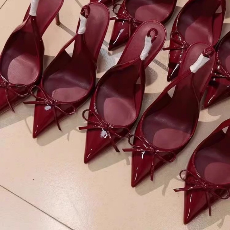 2025 새로운 도착 활 버건디 하이힐 여성 뾰족한 뒷면 빈 레드 솔 신발 섹시한 스틸레토 힐 커버 발가락 샌들스토어 가기