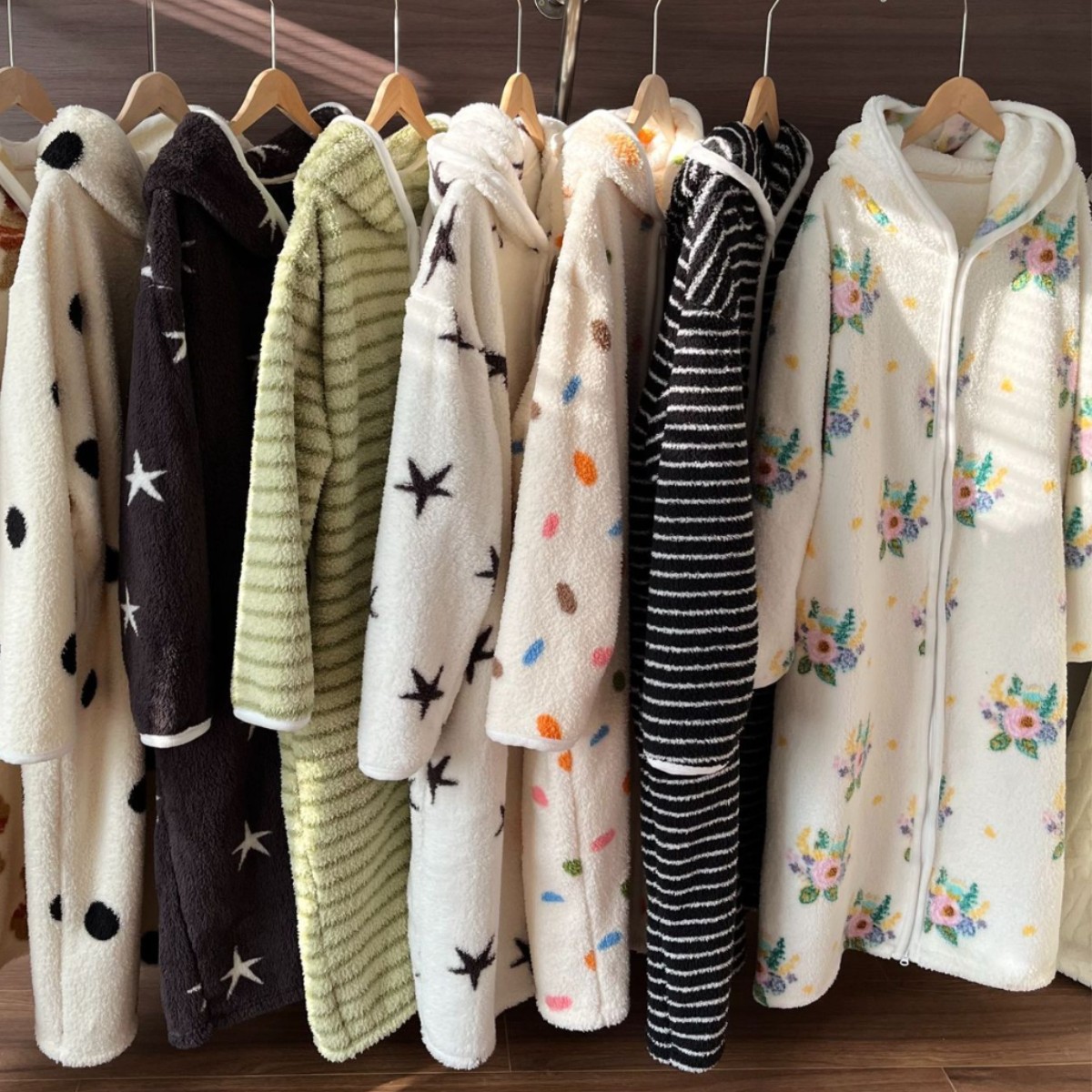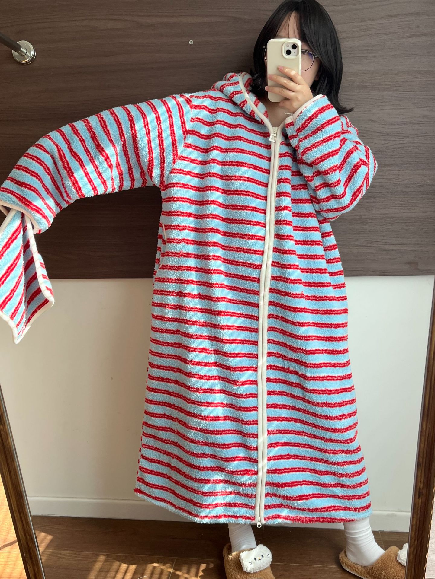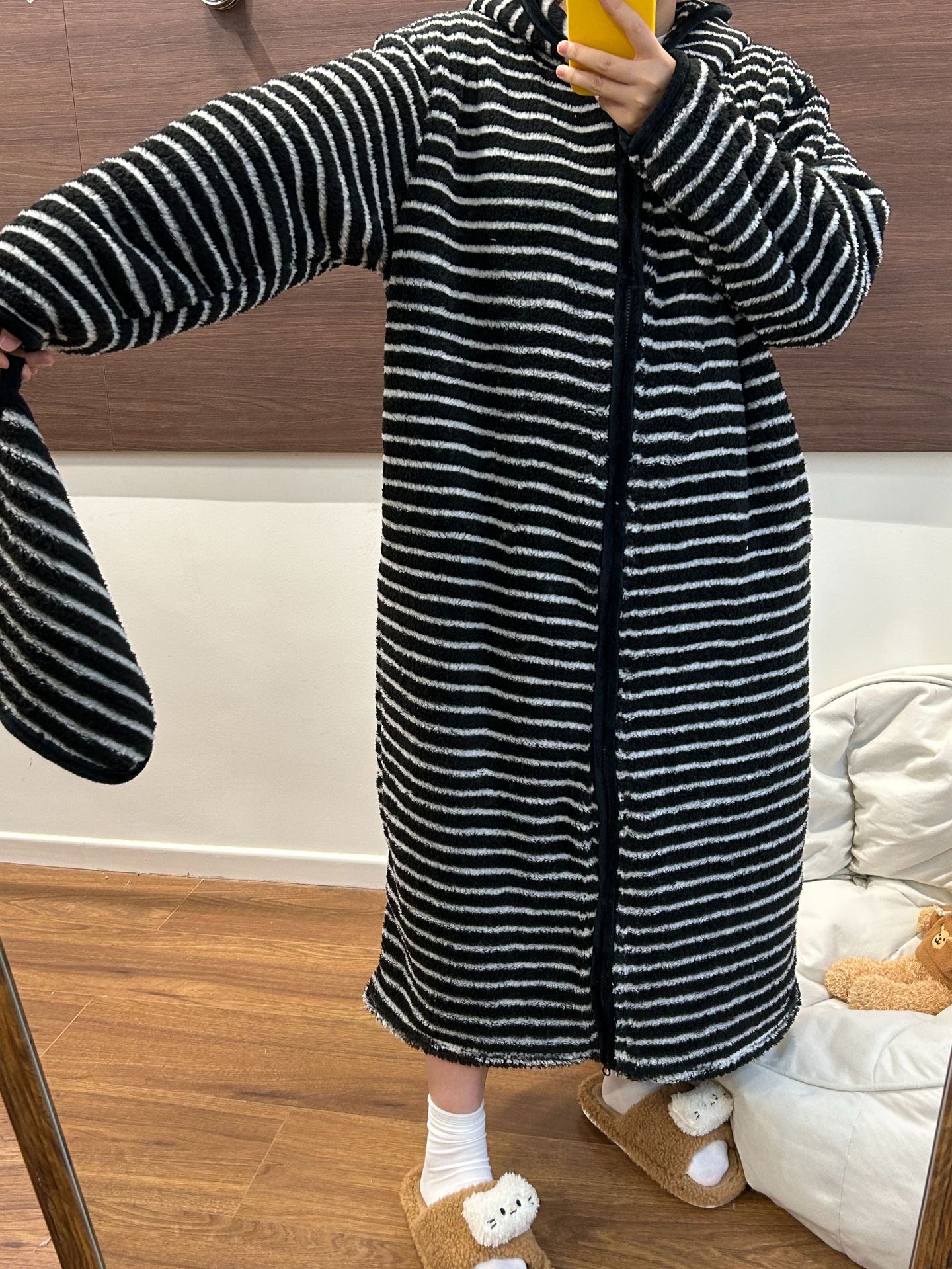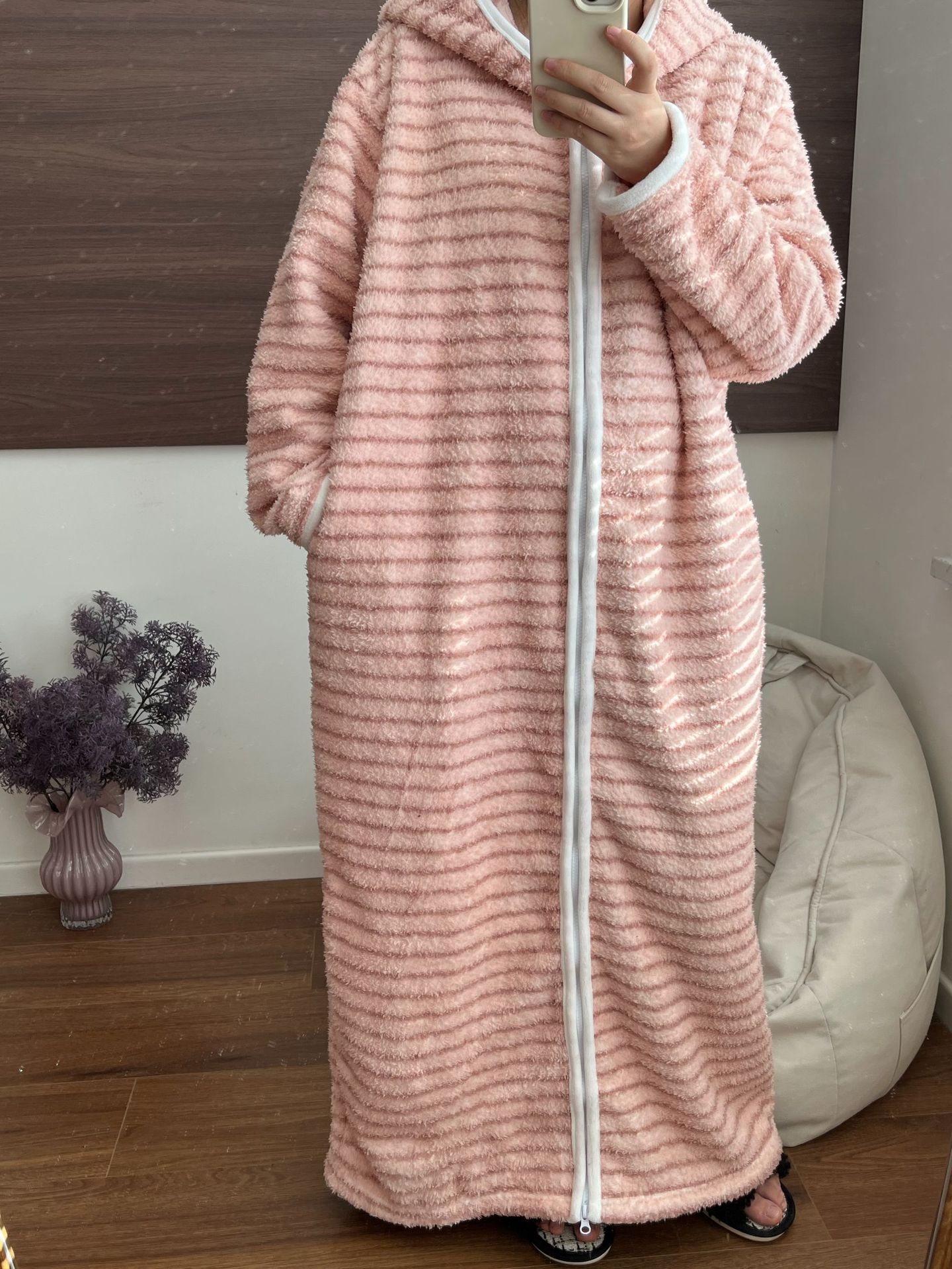 [실제 사진] Hongnan Walking Bed 스트라이프 산호 벨벳 잠옷 여성용 두꺼운 따뜻한 홈웨어 잠옷 후드스토어 가기