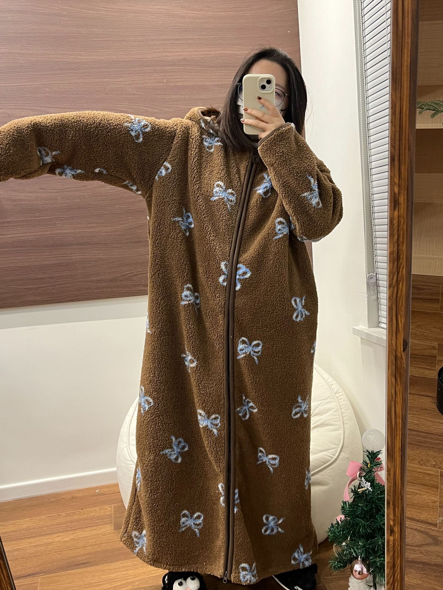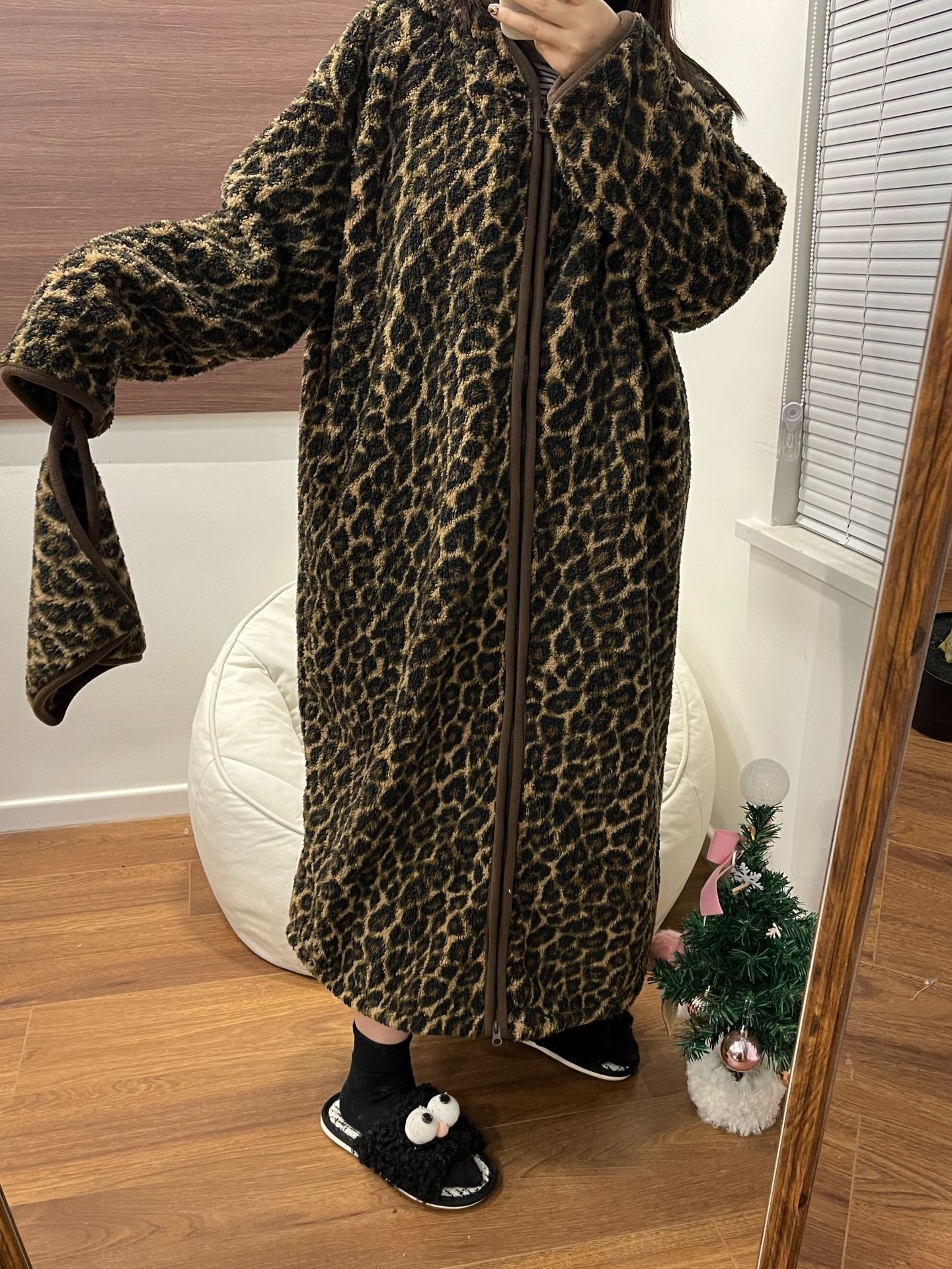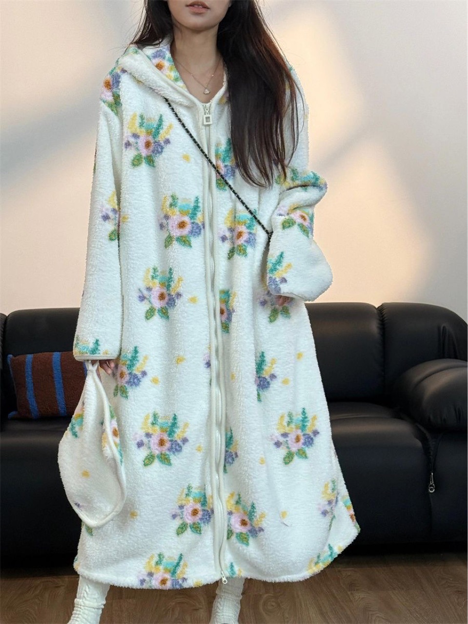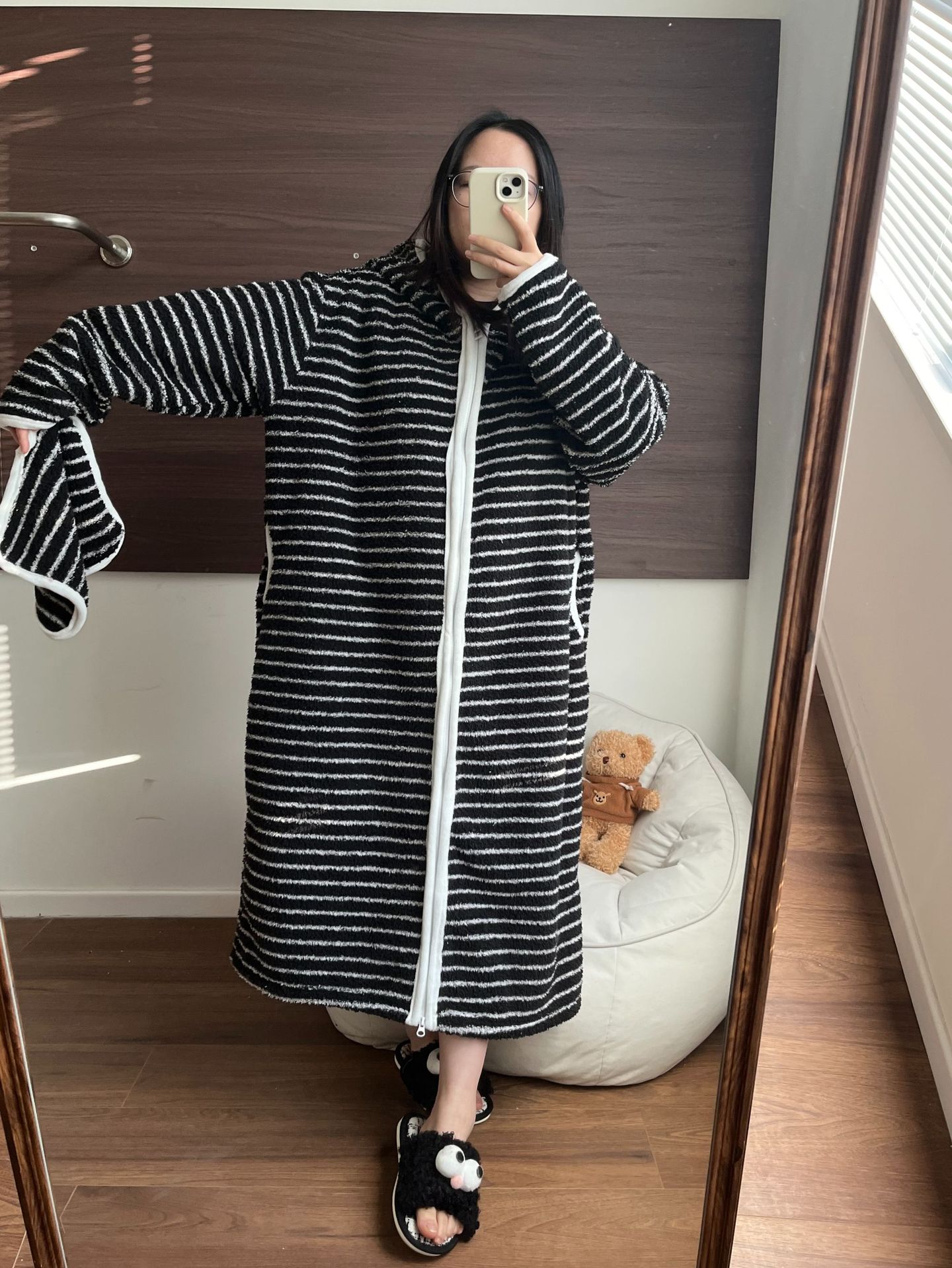 [실제 사진] Hongnan Walking Bed 스트라이프 산호 벨벳 잠옷 여성용 두꺼운 따뜻한 홈웨어 잠옷 후드스토어 가기
