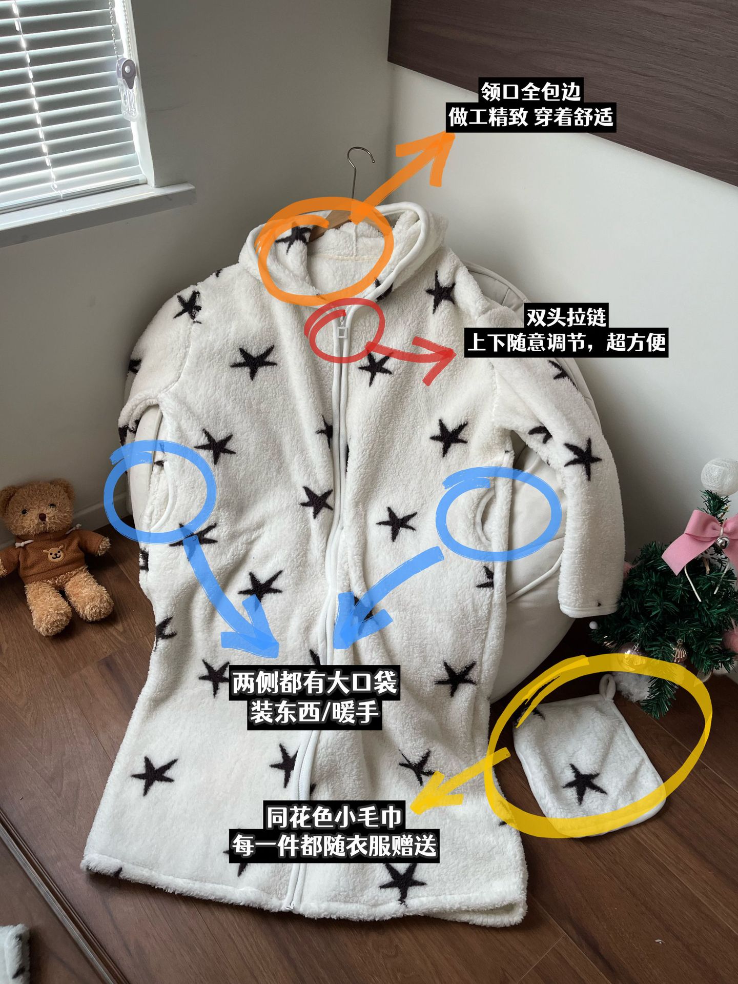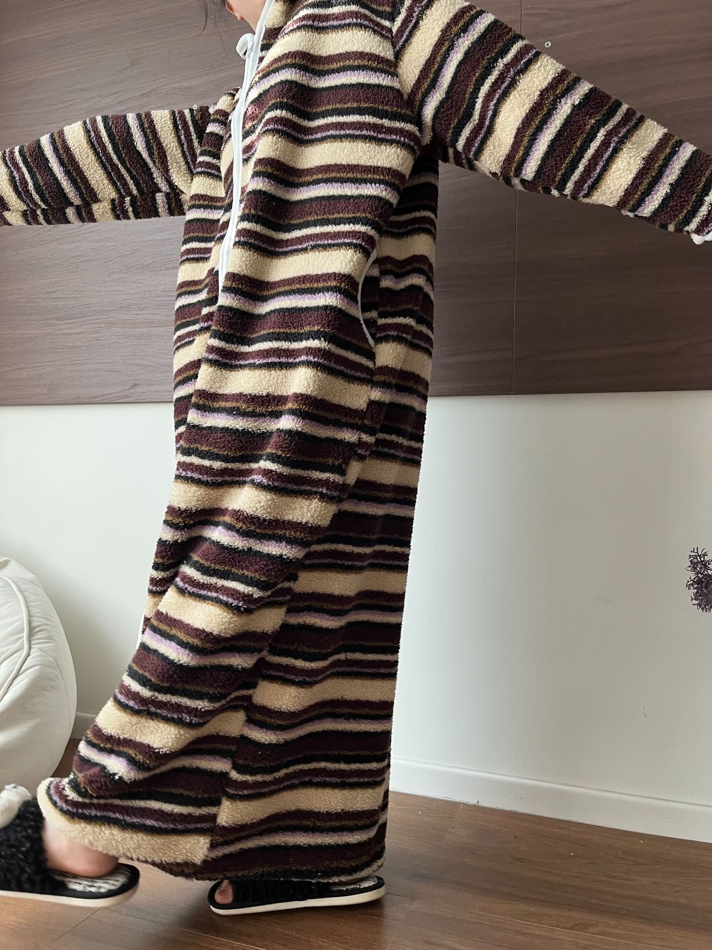 [실제 사진] Hongnan Walking Bed 스트라이프 산호 벨벳 잠옷 여성용 두꺼운 따뜻한 홈웨어 잠옷 후드