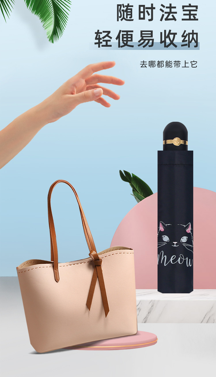 30% 접힌 귀여운 고양이 애니메이션 만화 우산 검은 접착제 햇빛 우산 여성의 맑고 비오는 이중 사용 도매 인쇄 로고스토어 가기