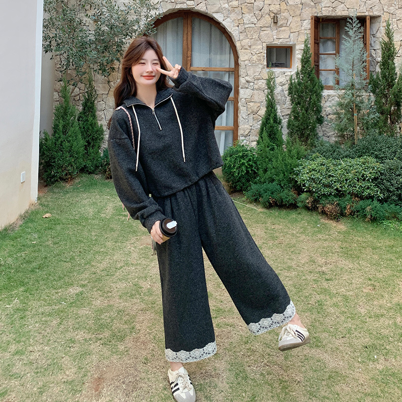 실제 샷 레이스 스티칭 캐주얼 스웨터 스포츠 세트 2025 새로운 시대를 줄이는 대학 스타일 작은 투피스 세트