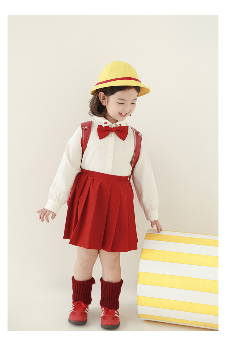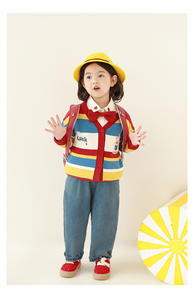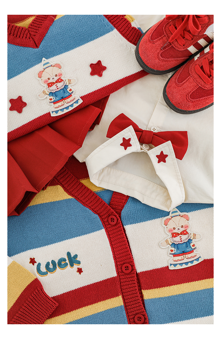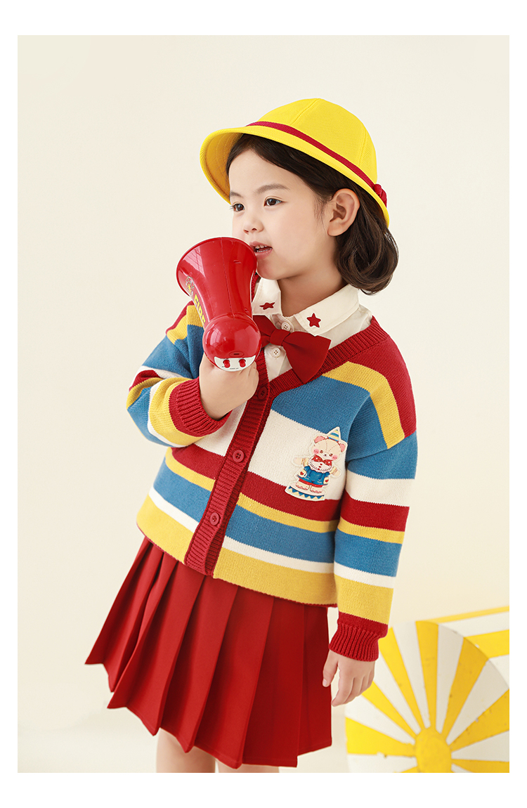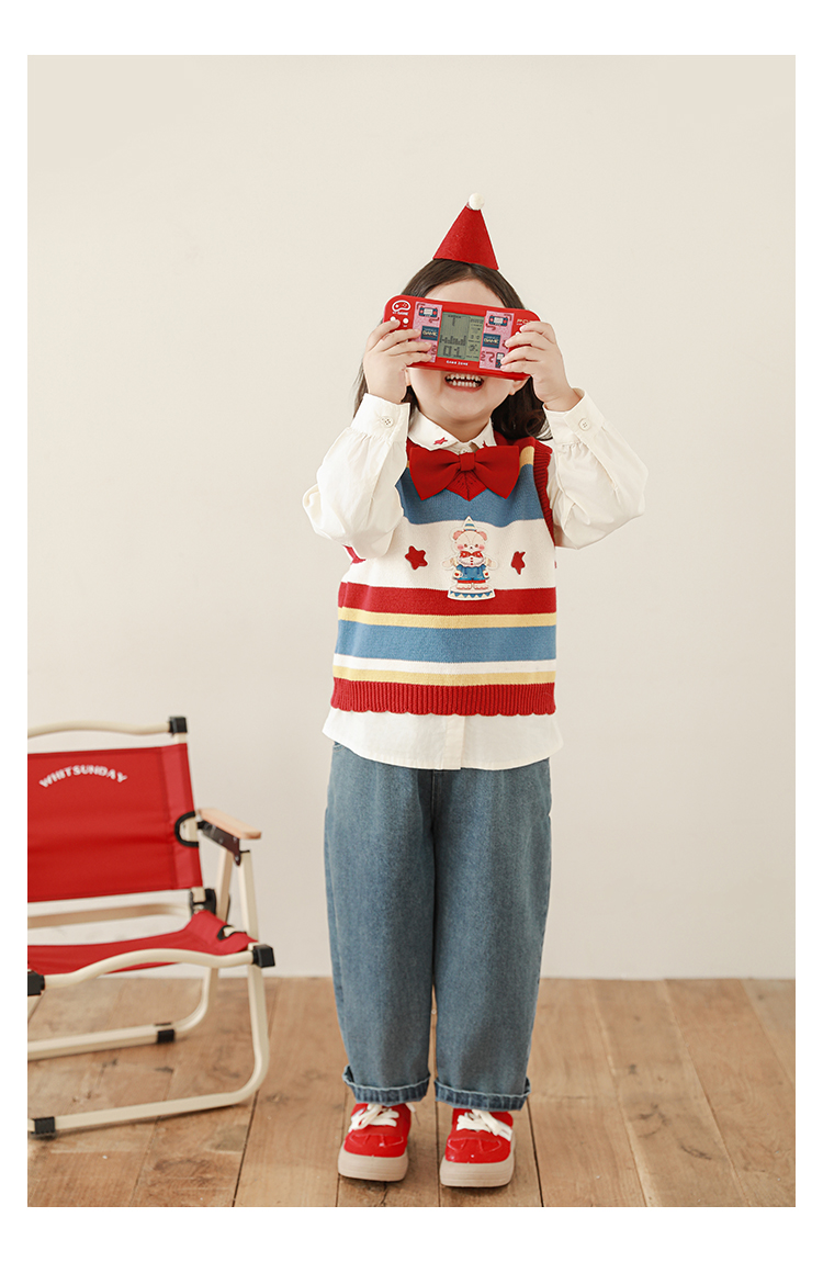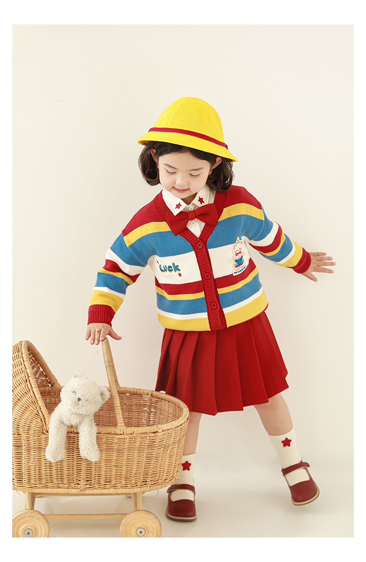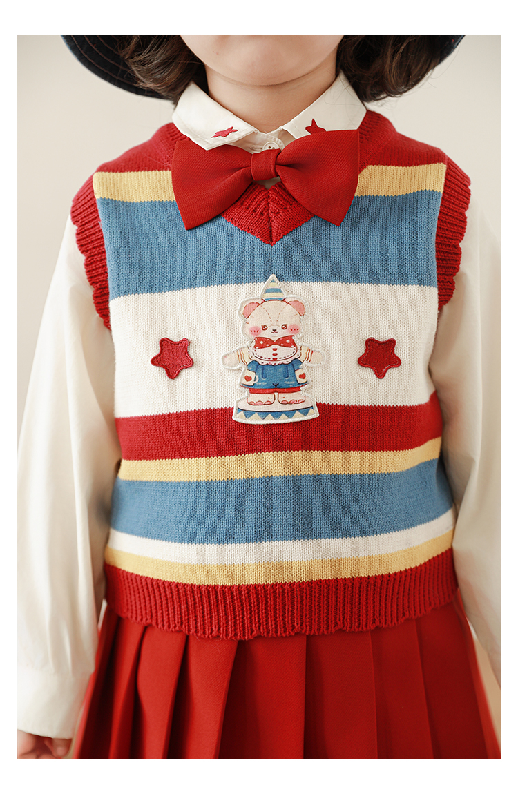 Wuri Boyi 소녀 레인보우 파라다이스 세트 빨간색과 파란색 줄무늬 V-Neck 스웨터 조끼 간단한 셔츠 스커트 트렌디스토어 가기