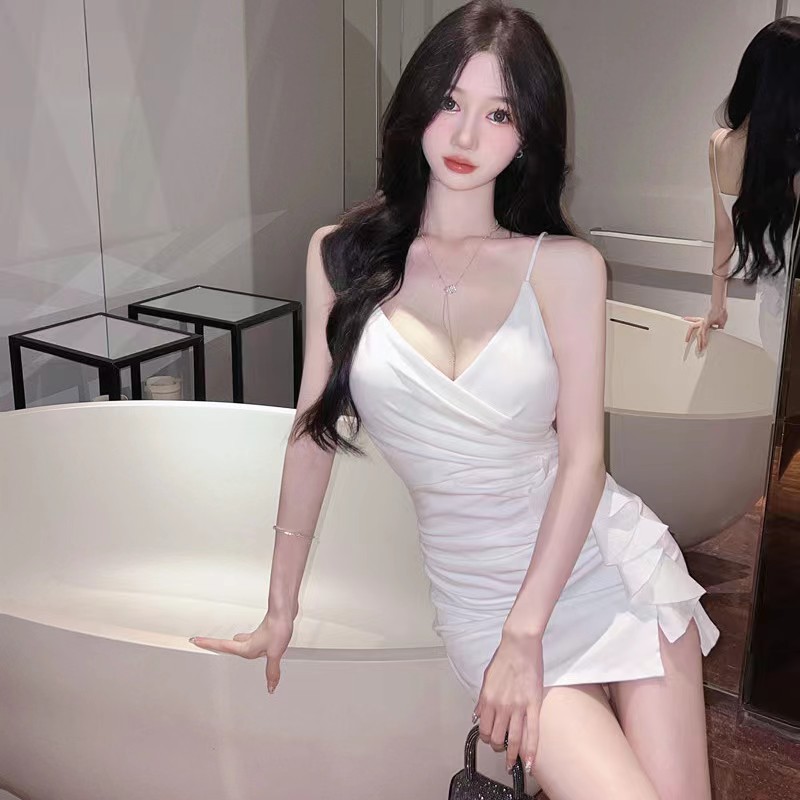 로우 컷 슬링 원피스 2025 여름 새로운 서양 스타일 섹시한 짧은 스커트 나이트 클럽 러플 슬림 타이트 힙