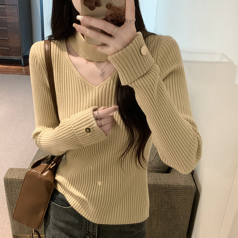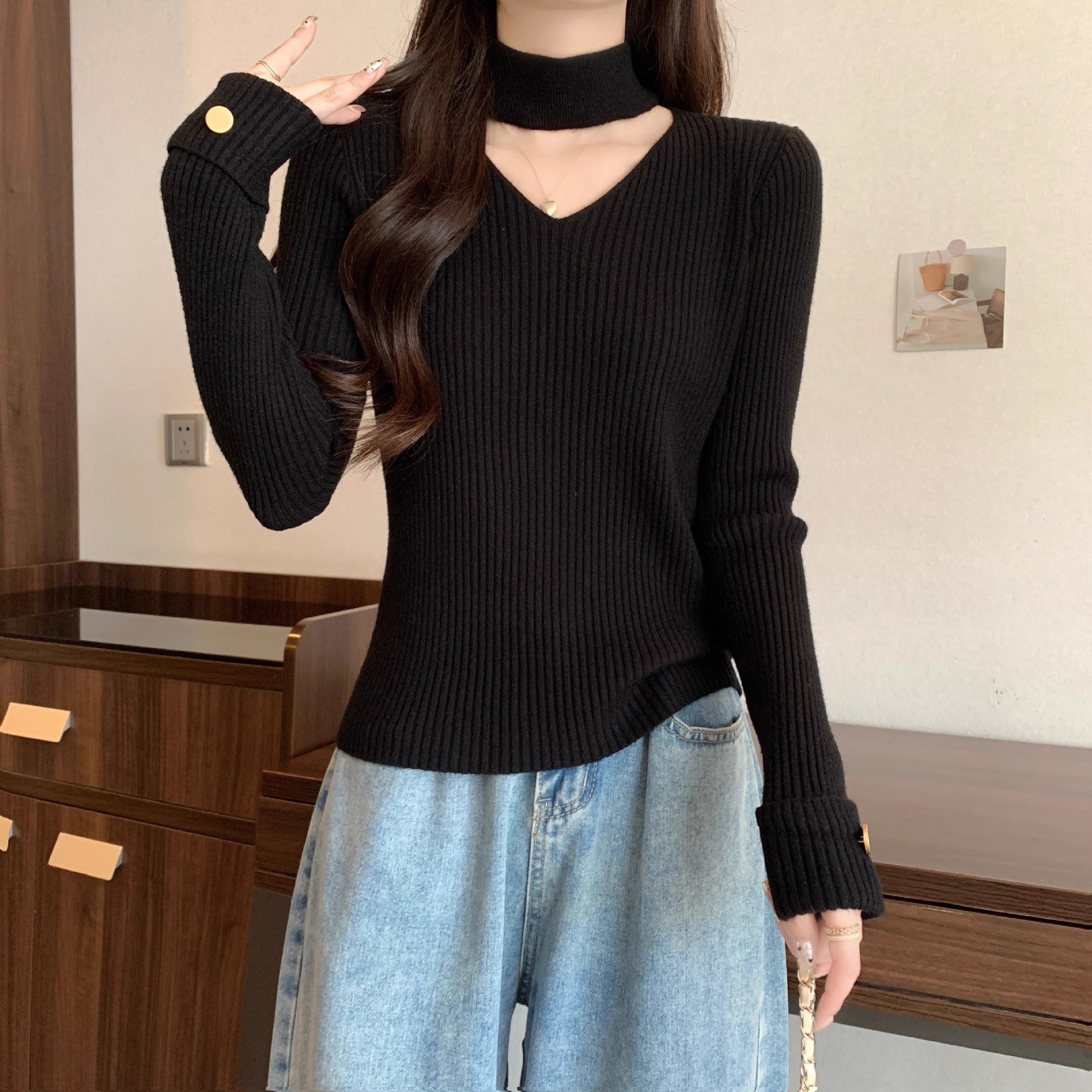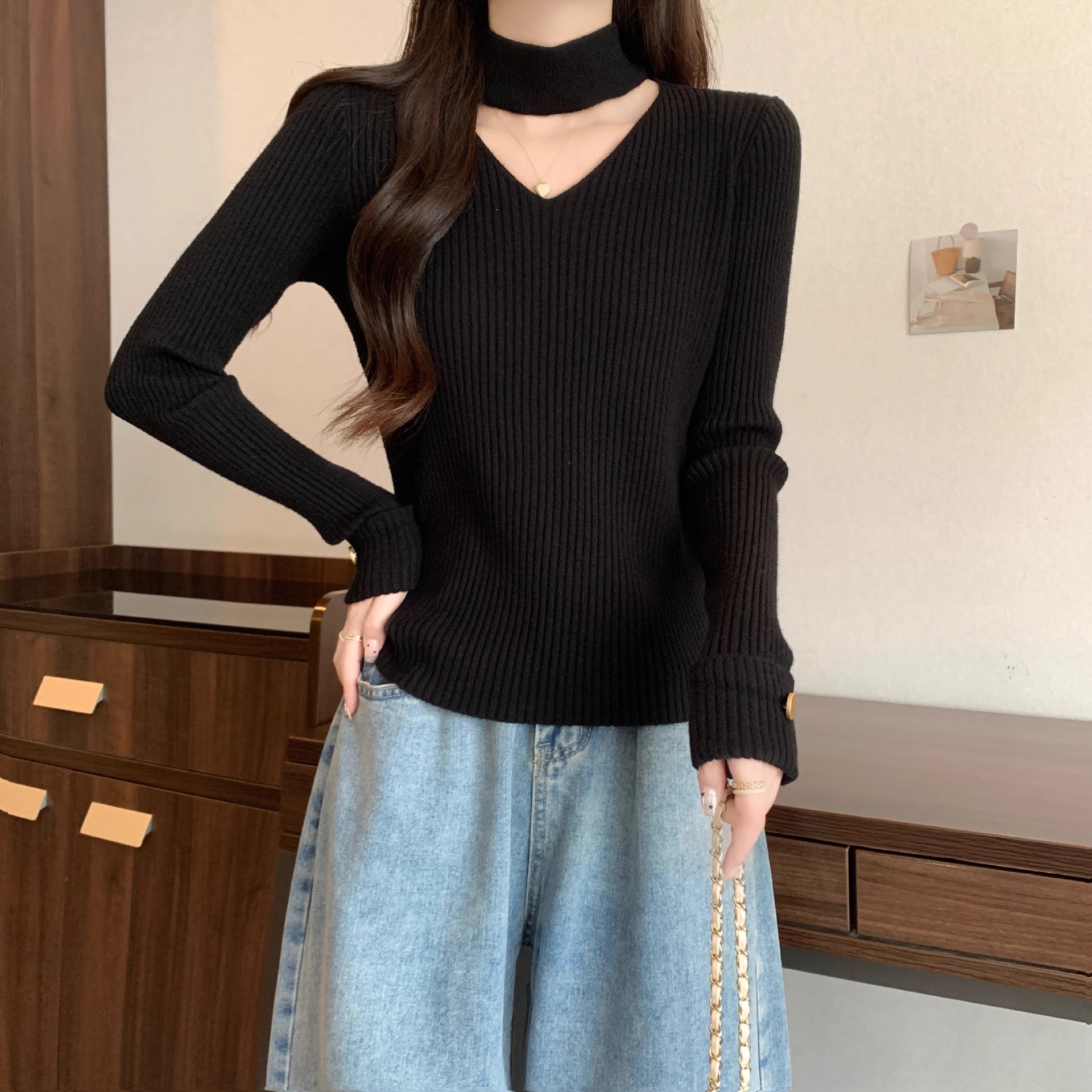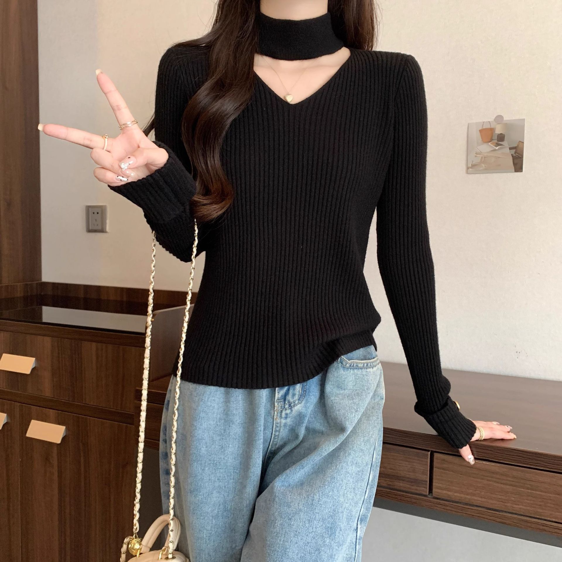 순수한 매력 스타일 슬림핏 이너 니트 여성용 52025 가을 겨울 신상 고급스러운 홀터넥 브이넥 긴팔 니트