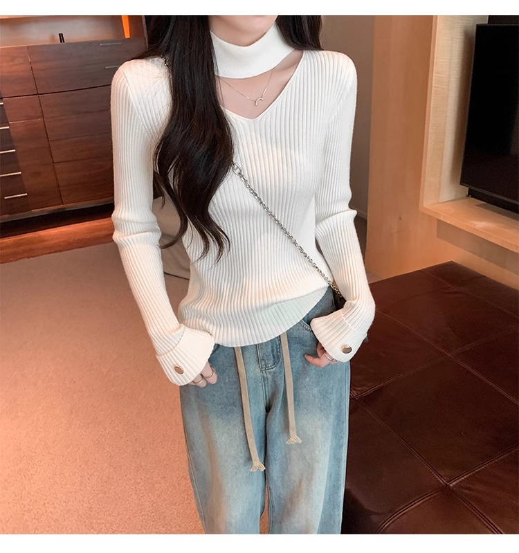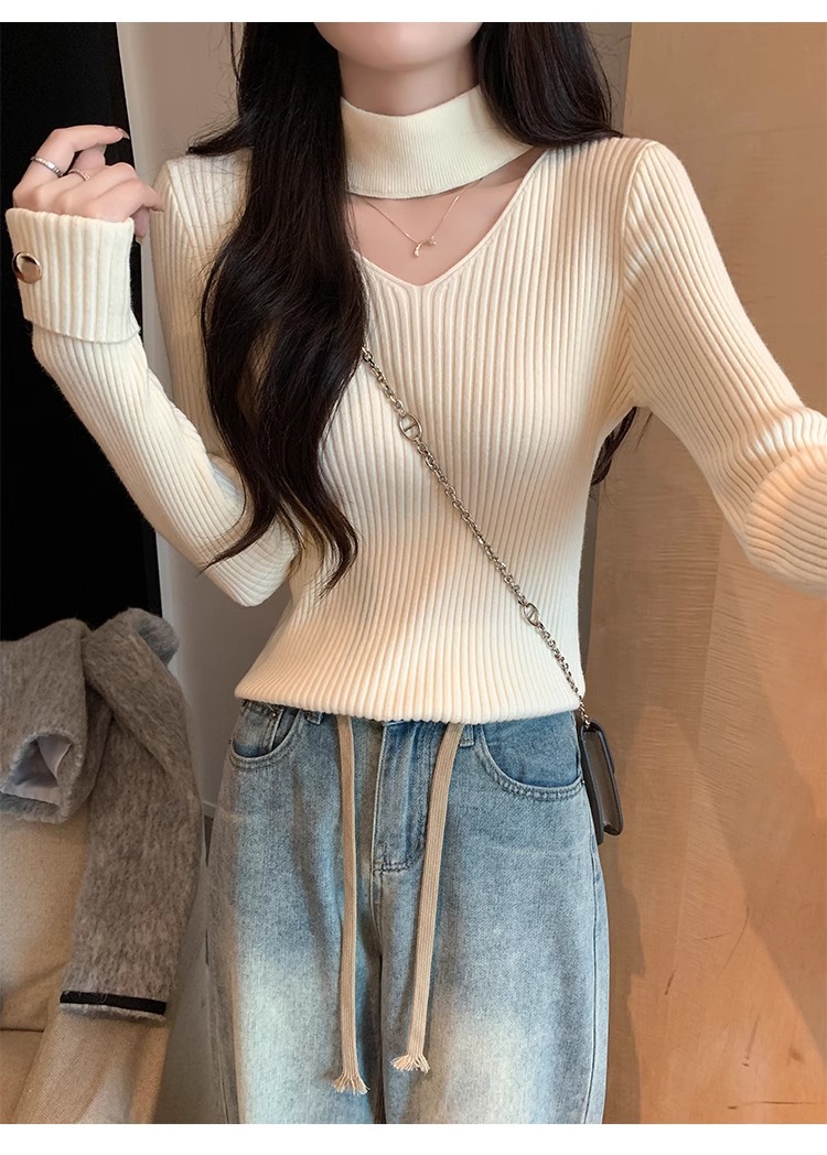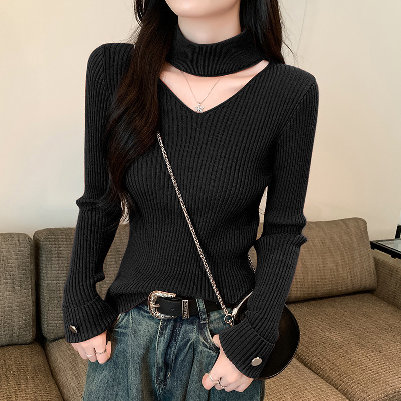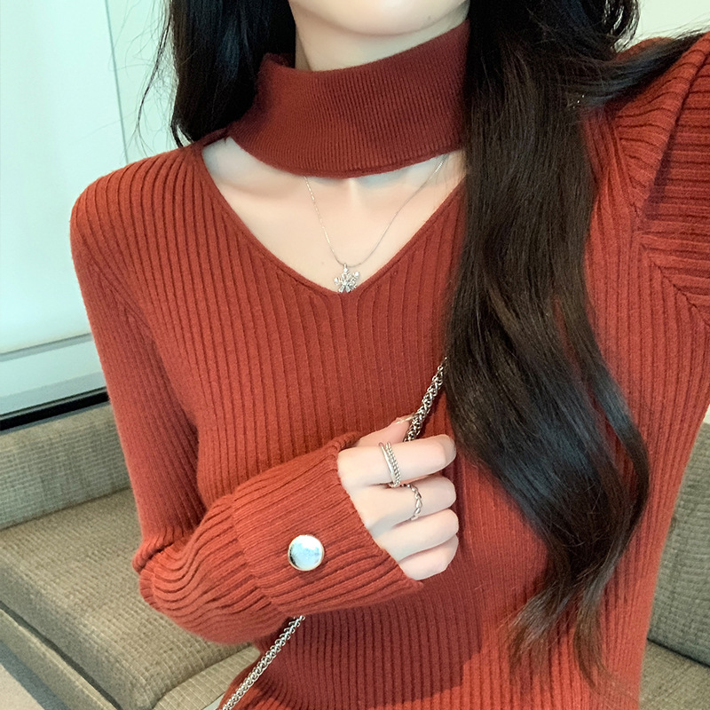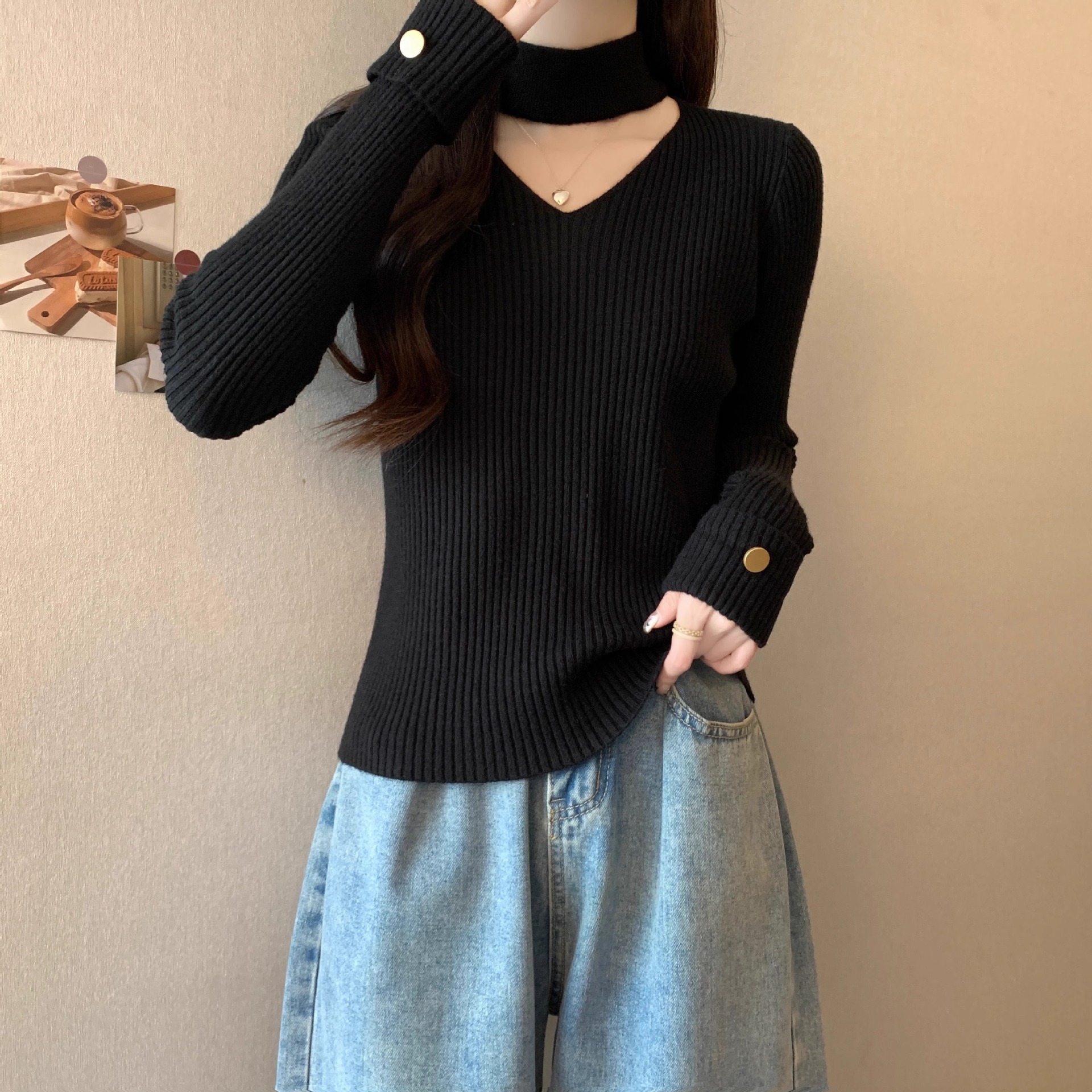 순수한 매력 스타일 슬림핏 이너 니트 여성용 52025 가을 겨울 신상 고급스러운 홀터넥 브이넥 긴팔 니트
