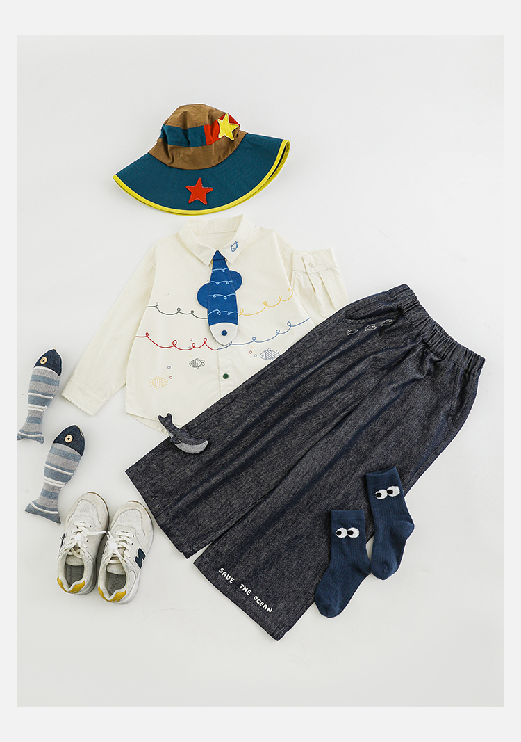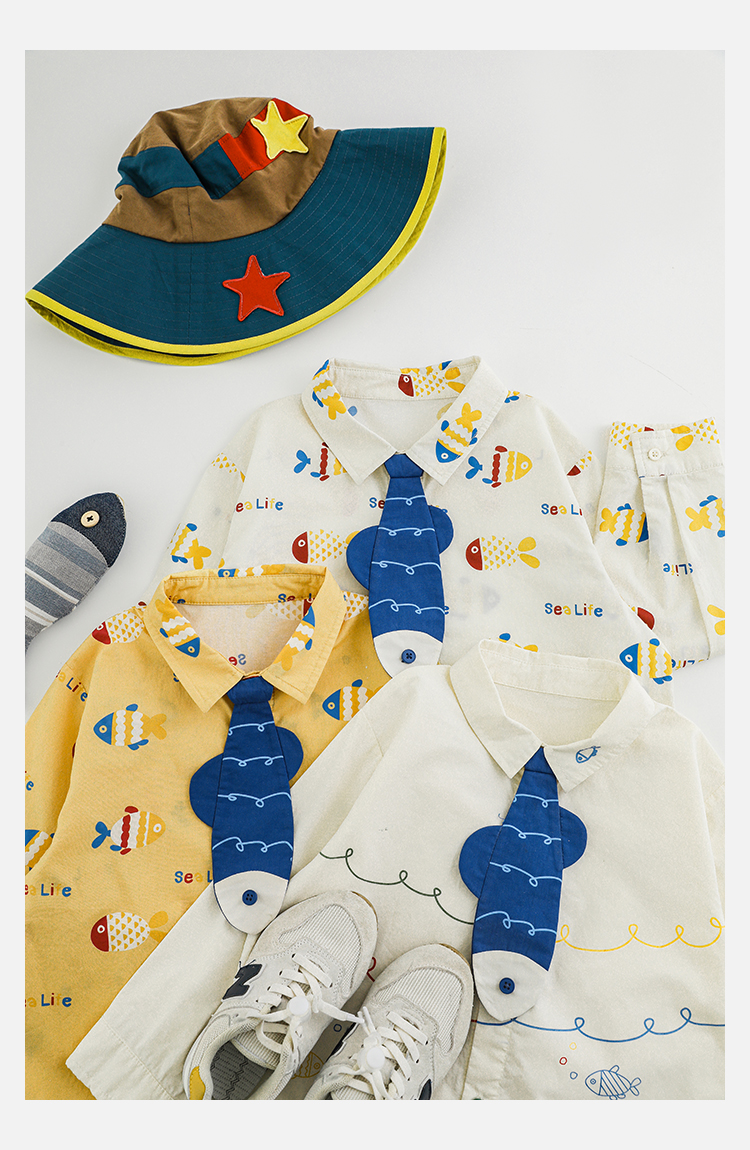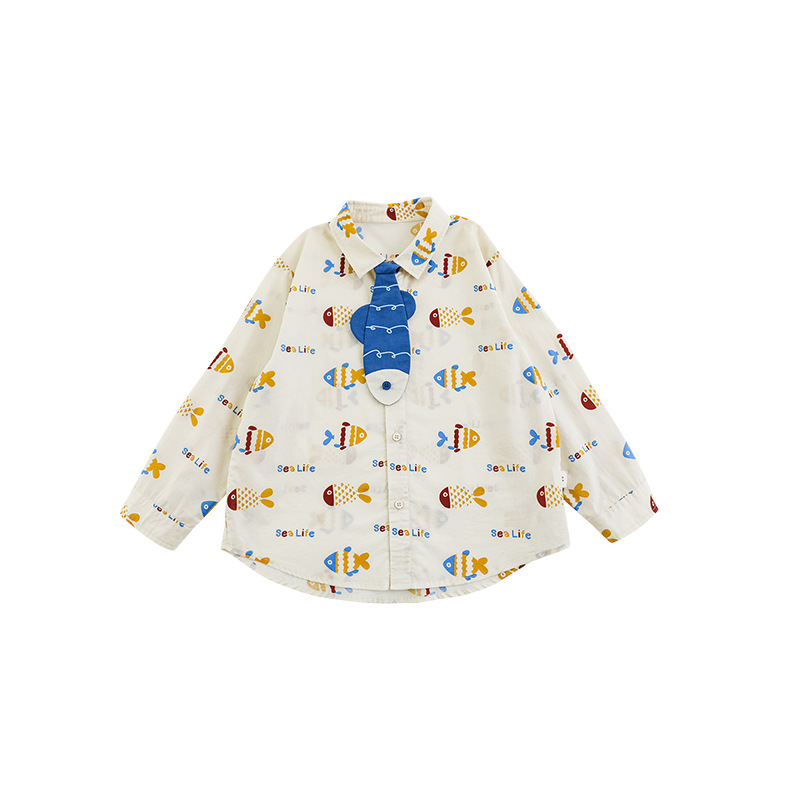 Wurib 소년 봄 새로운 긴 소매 옷깃 만화 생선 셔츠 짧은 뒤로 긴 유행 올 매치 셔츠