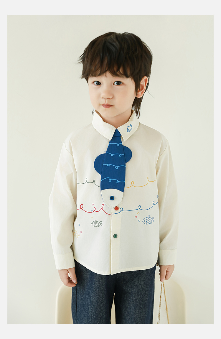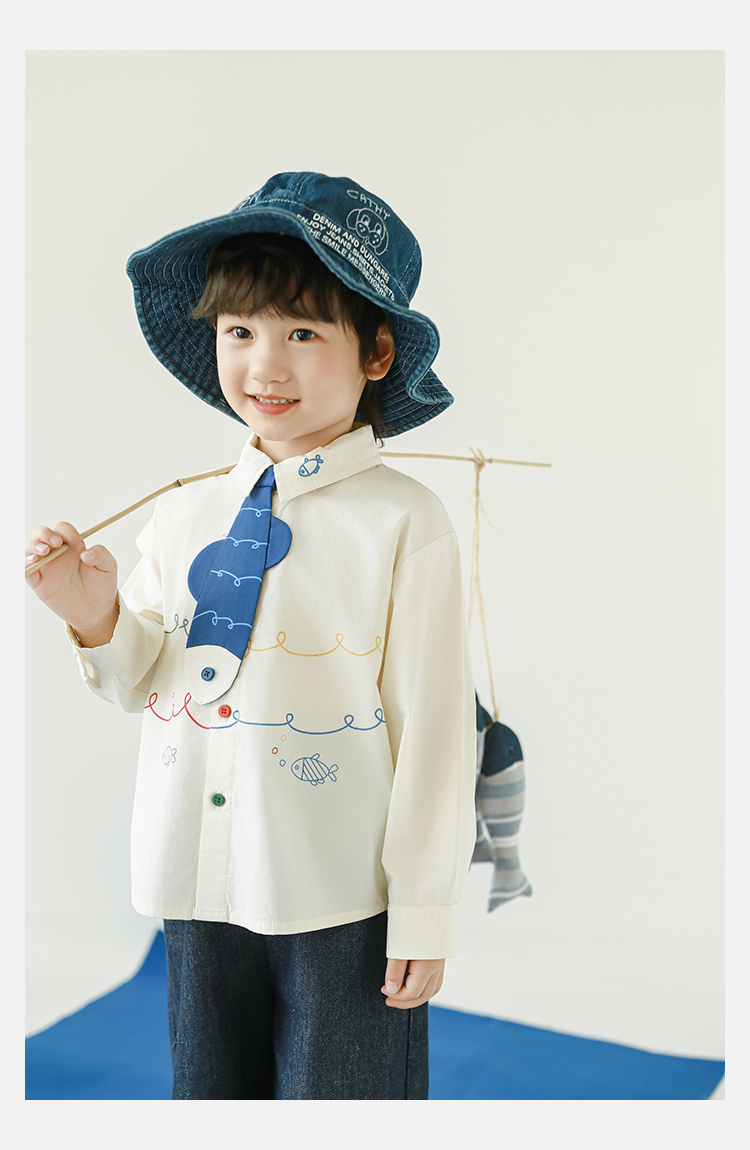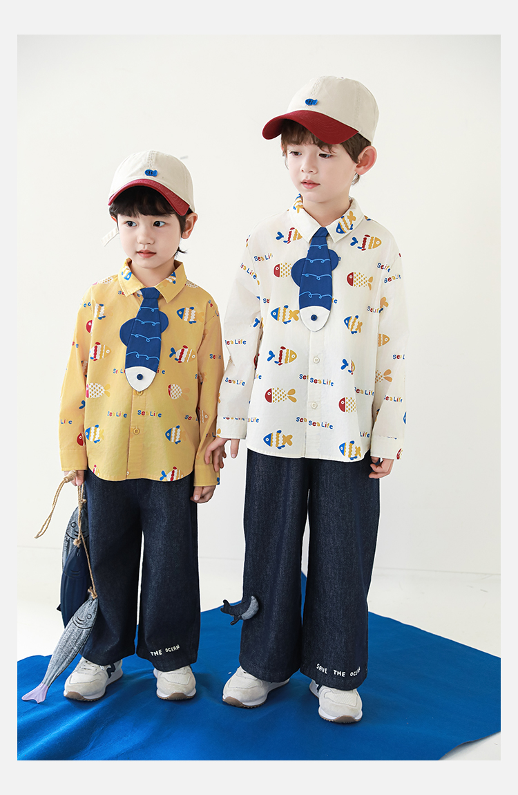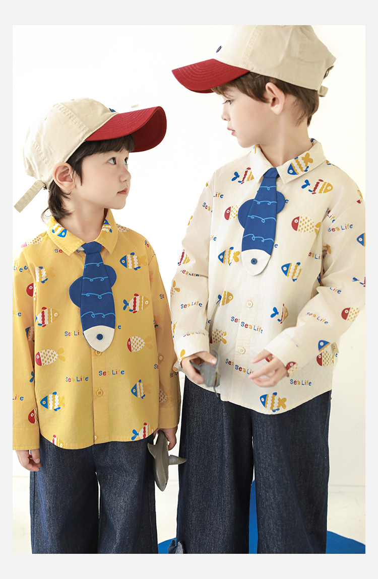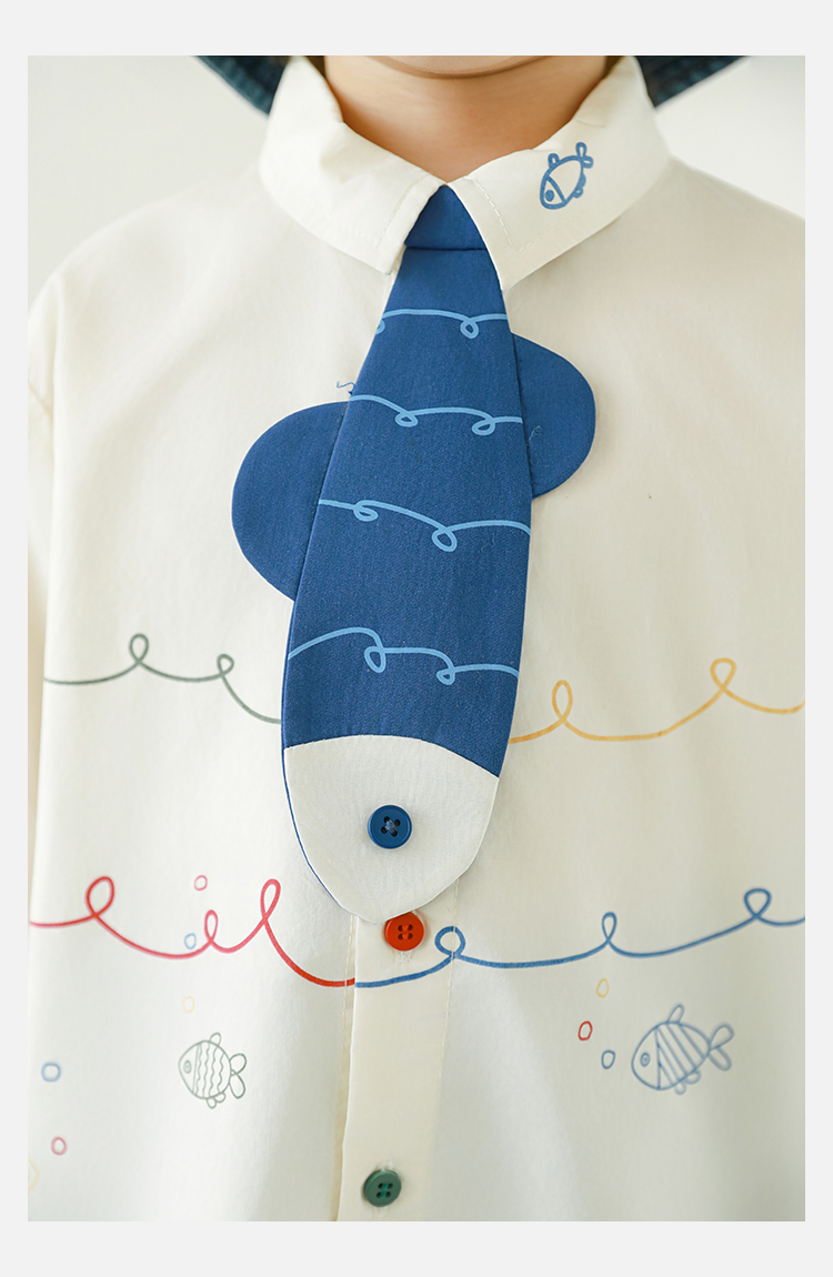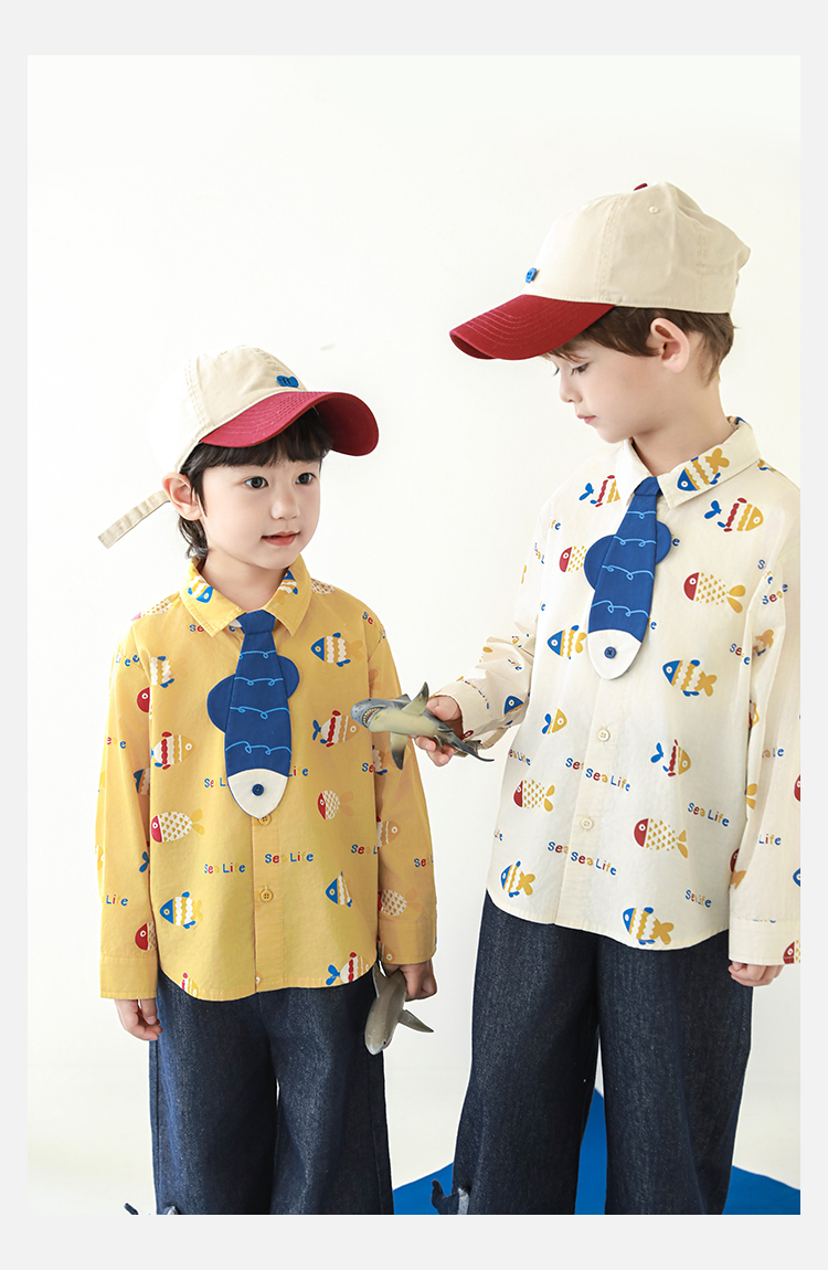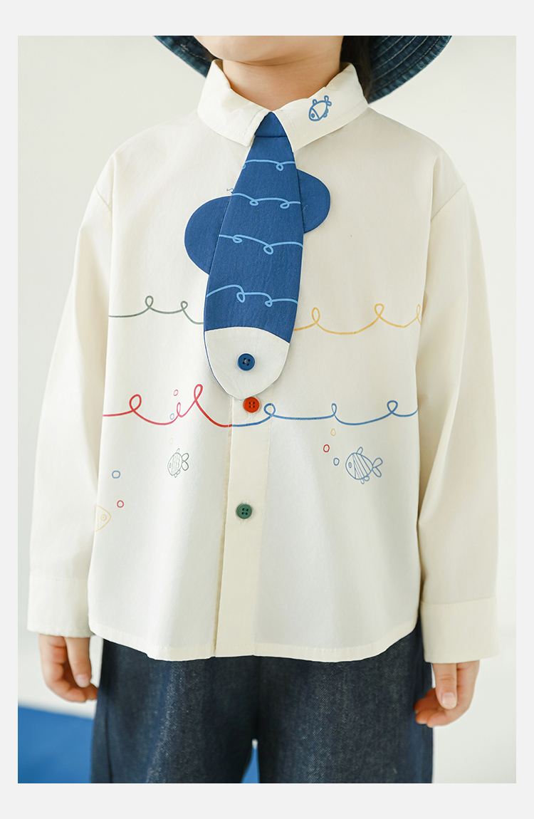 Wurib 소년 봄 새로운 긴 소매 옷깃 만화 생선 셔츠 짧은 뒤로 긴 유행 올 매치 셔츠스토어 가기