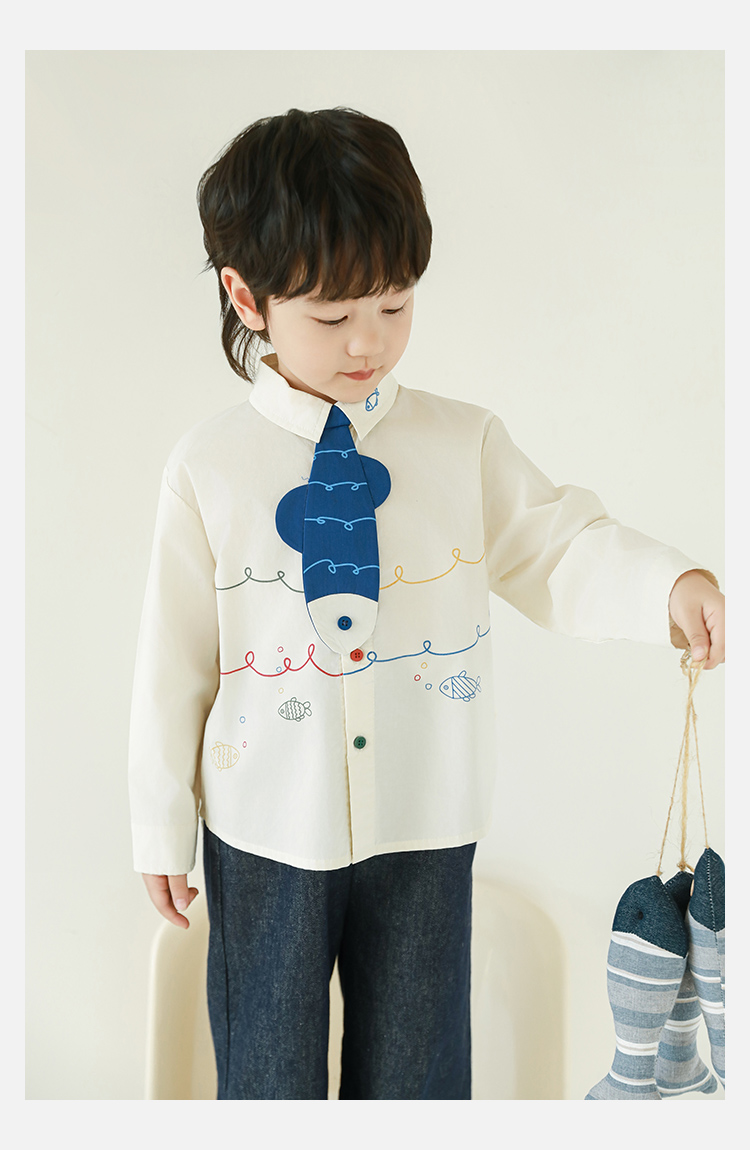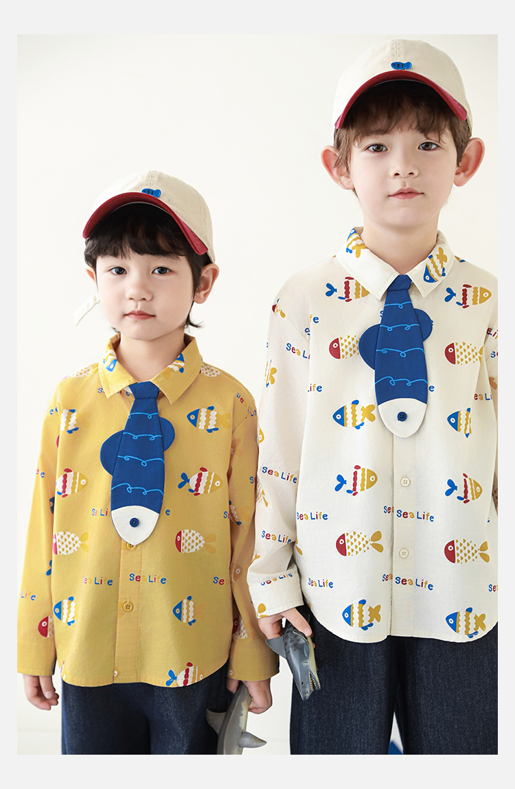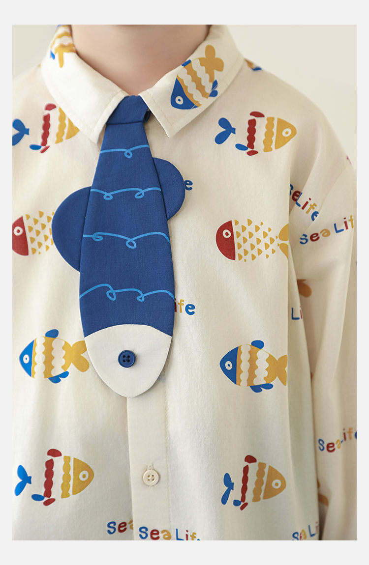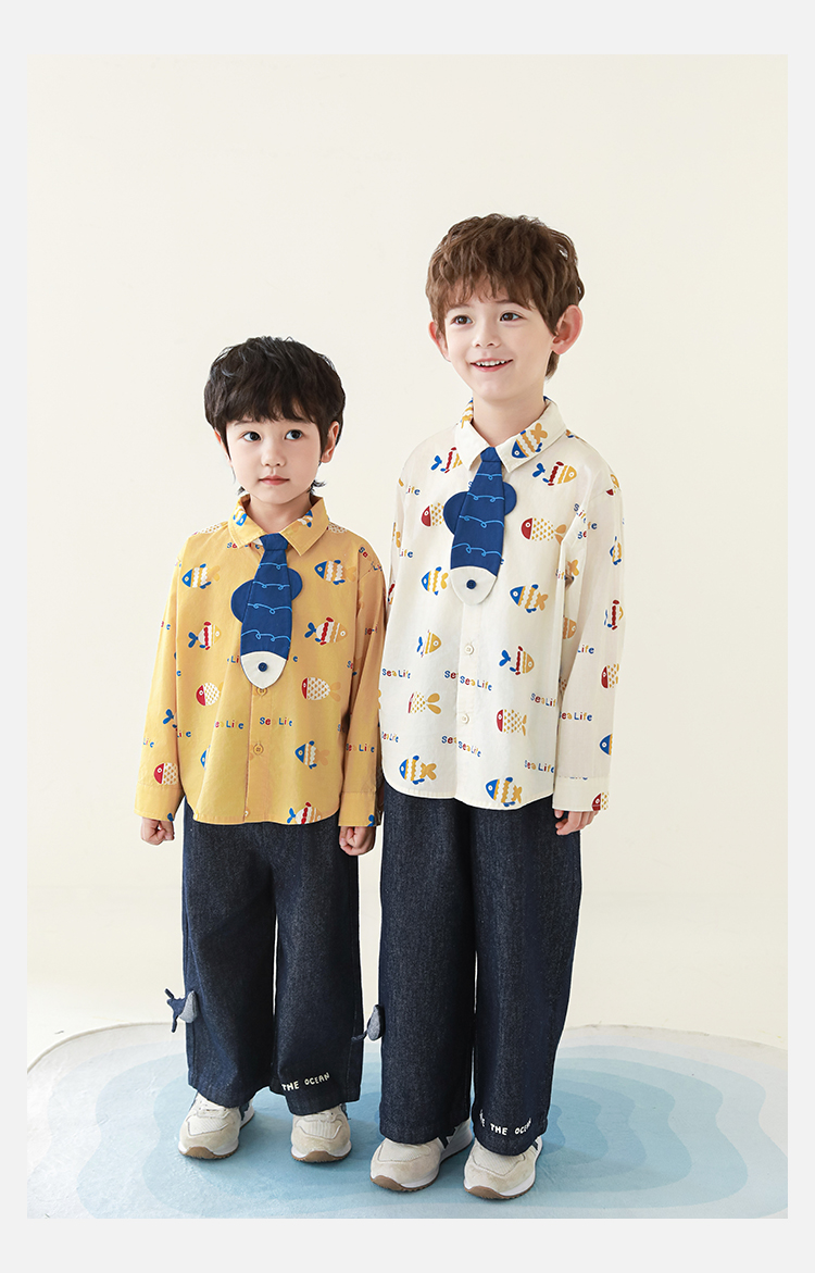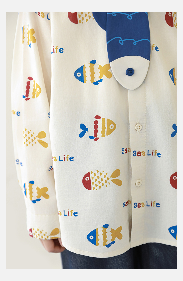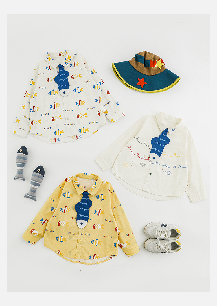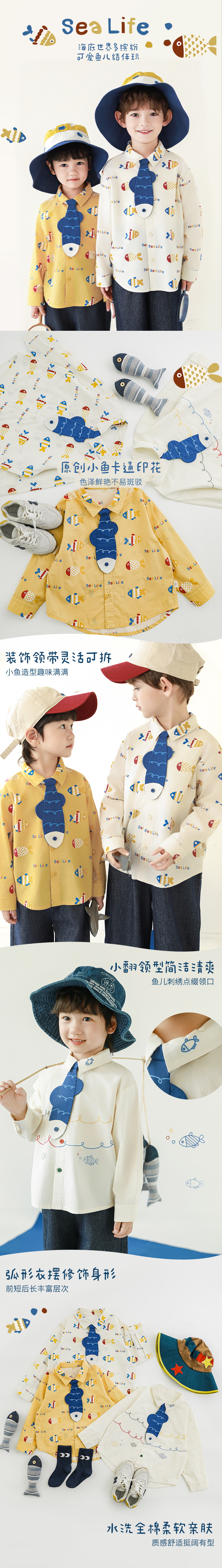 Wurib 소년 봄 새로운 긴 소매 옷깃 만화 생선 셔츠 짧은 뒤로 긴 유행 올 매치 셔츠스토어 가기